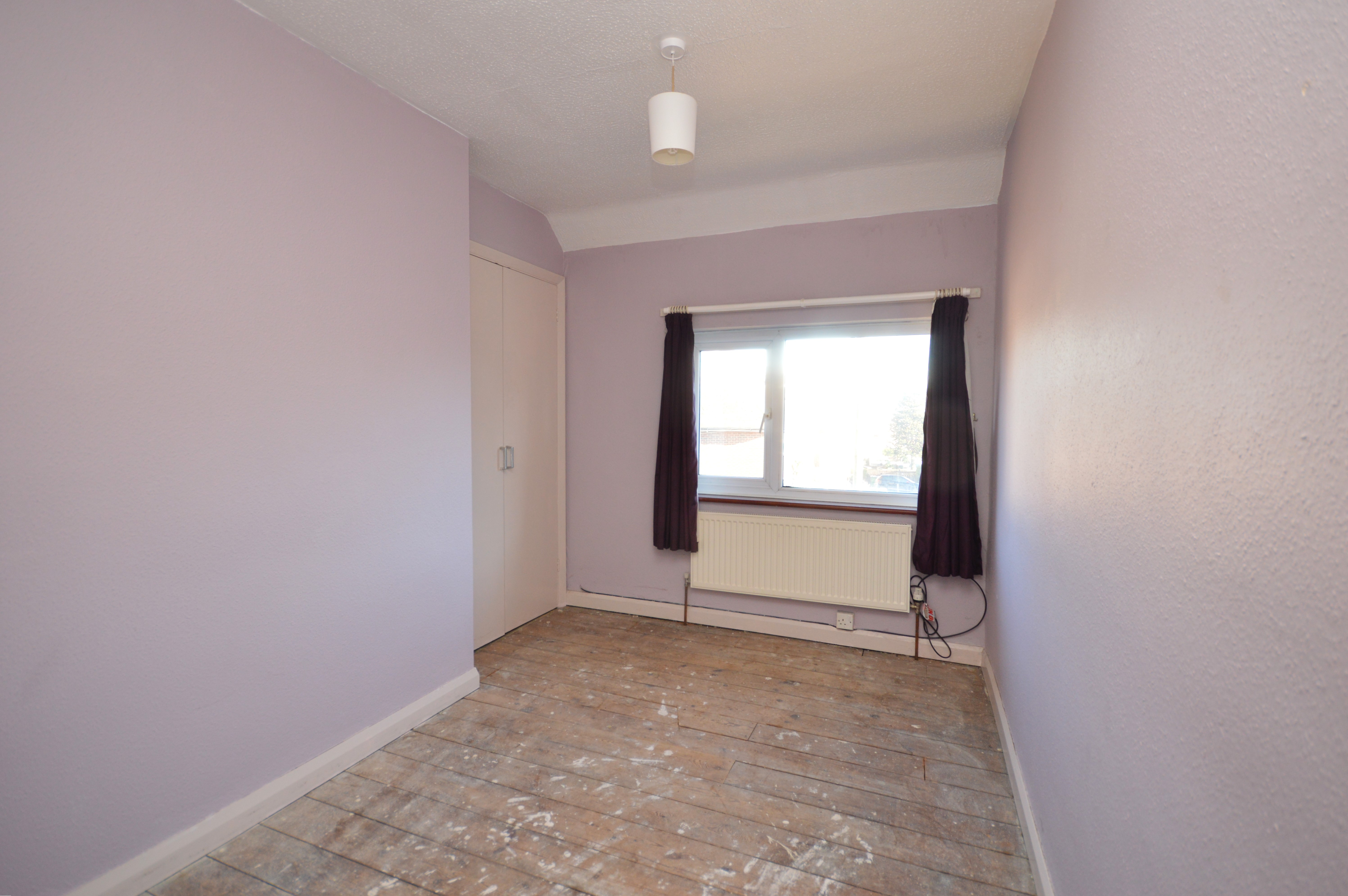 UPVC double glazed window to the front of the property with exposed wooden floor boards, in built wardrobe and a radiator.