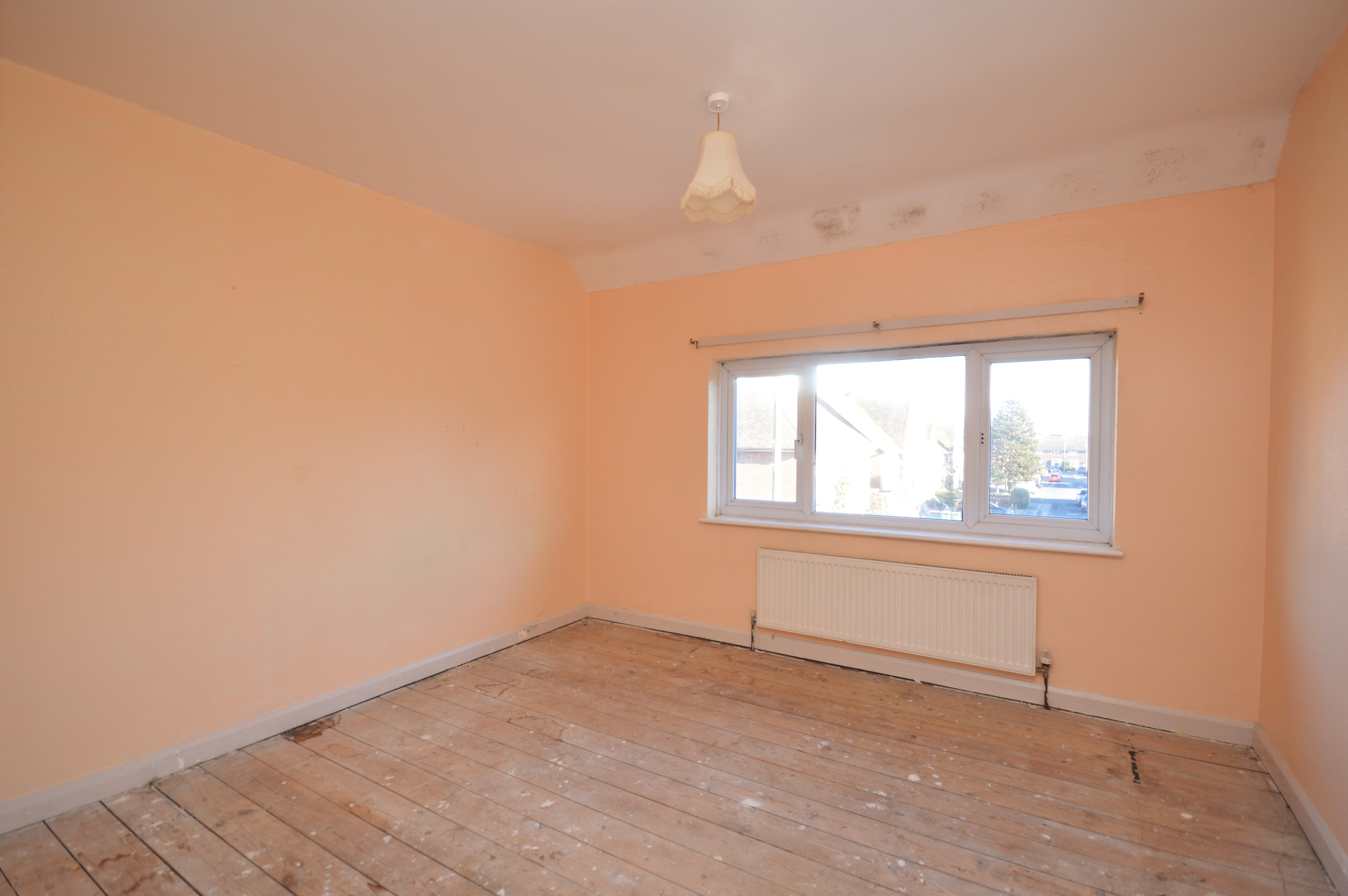 UPVC double glazed window to the rear of the property with exposed wooden floor boards and a radiator.