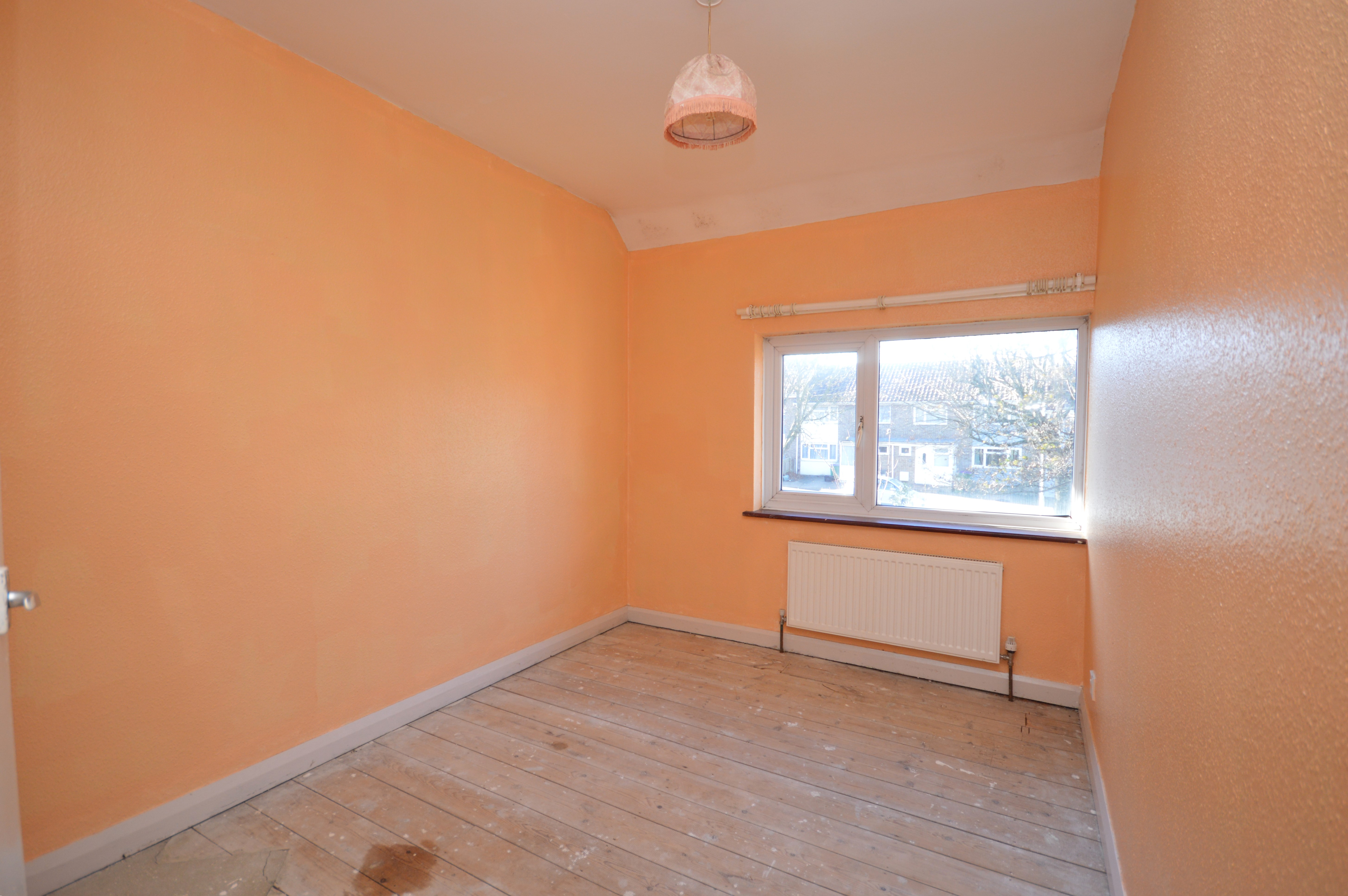 UPVC double glazed window to the front of the property, exposed wooden floor boards and a radiator.