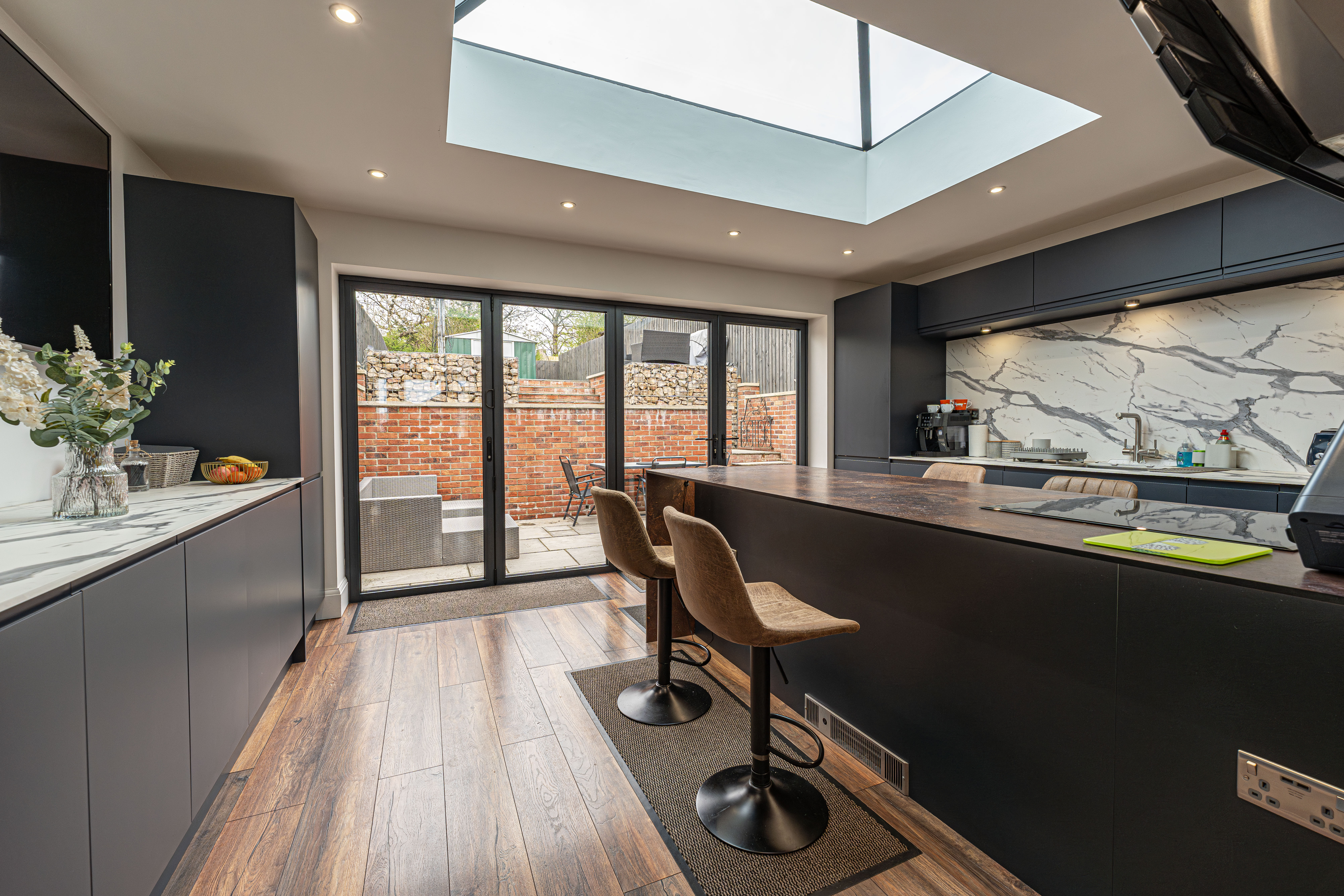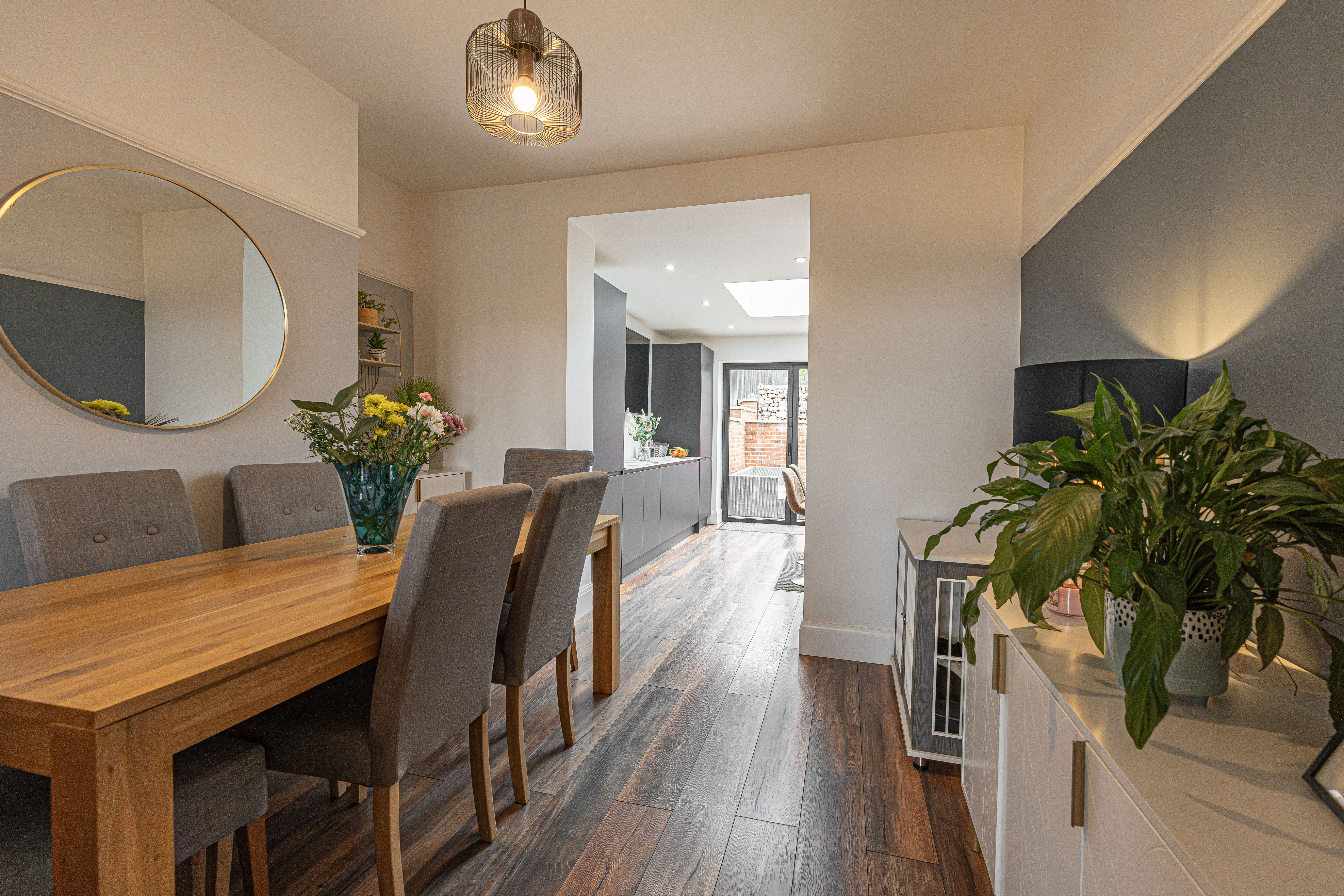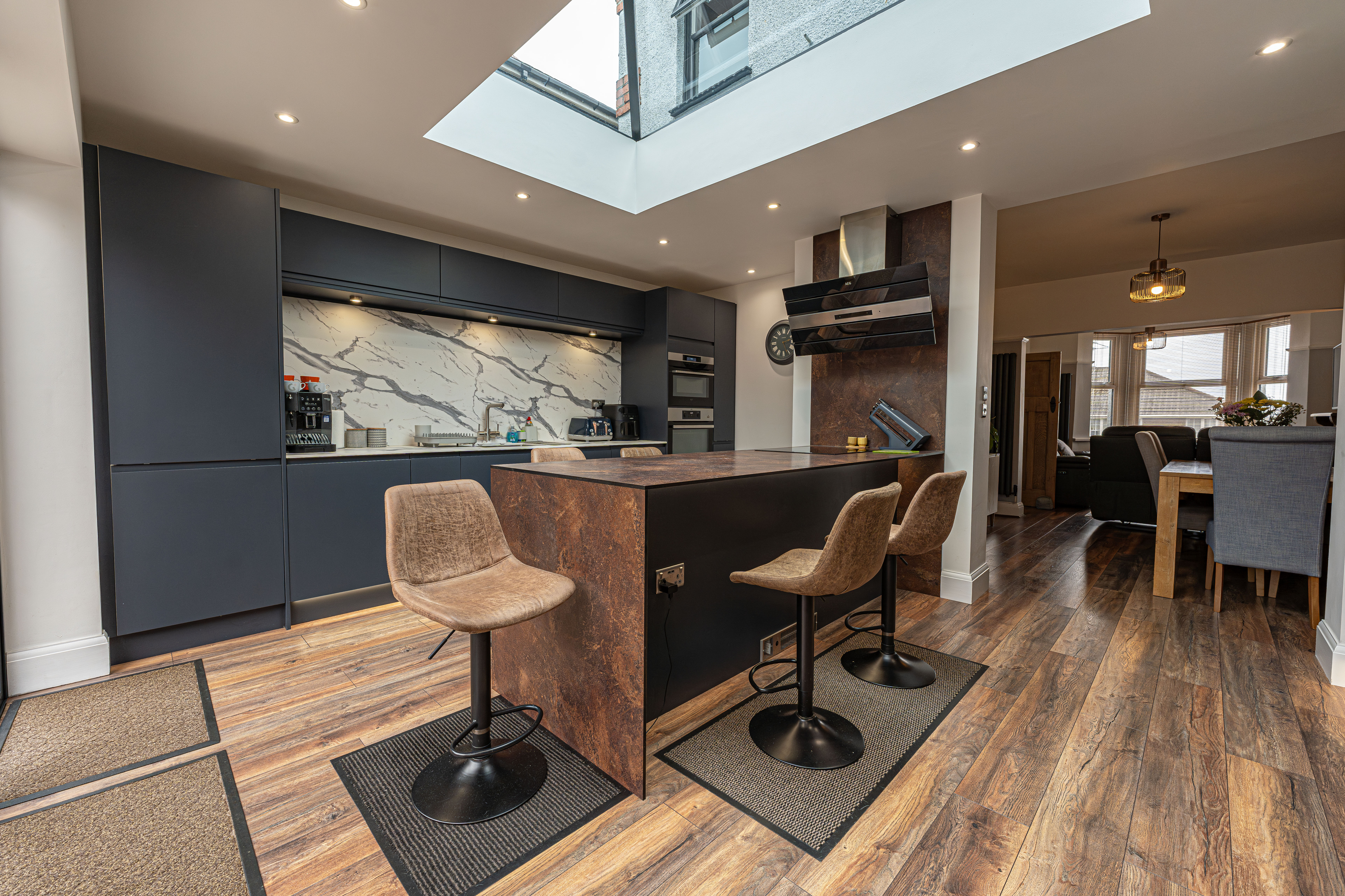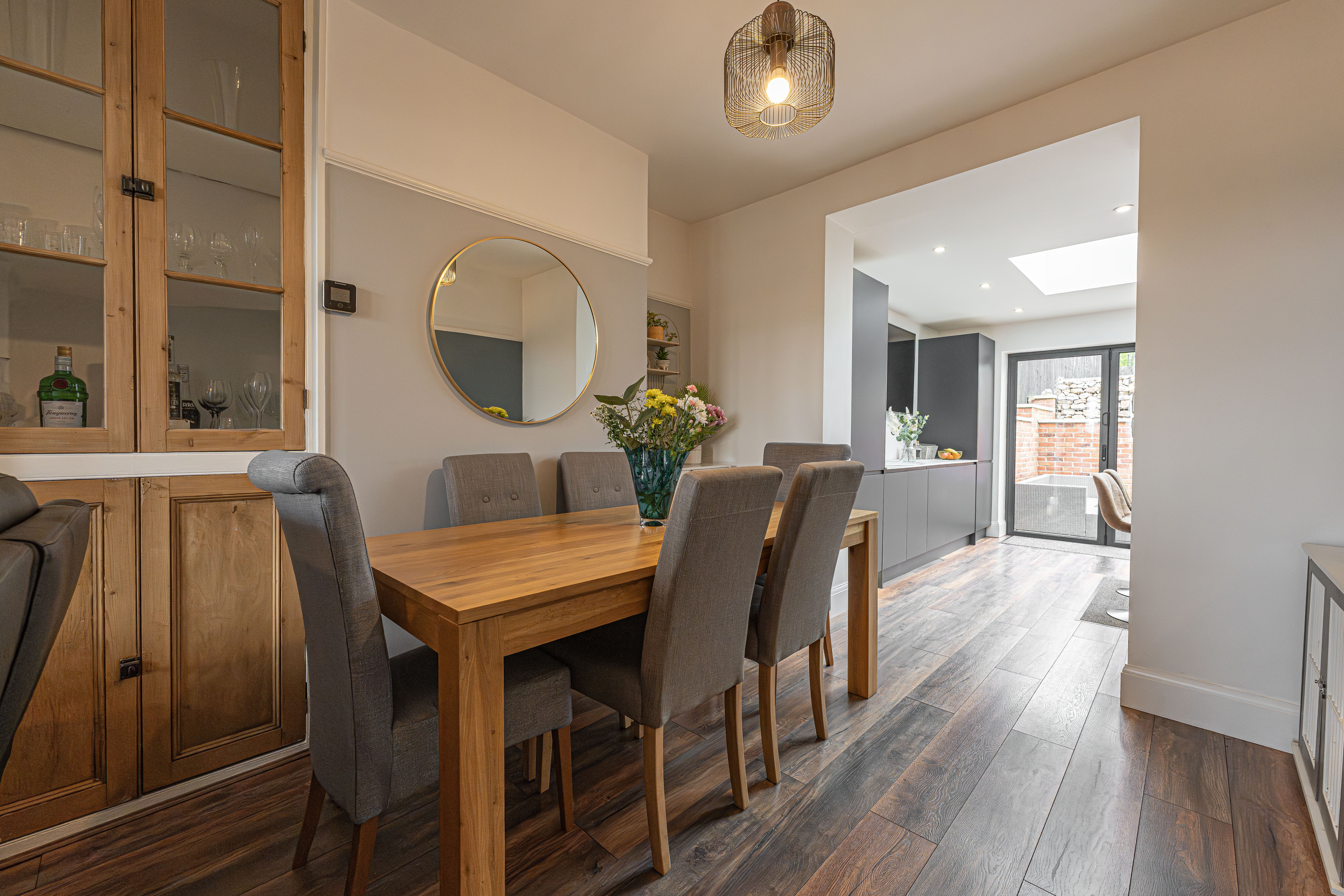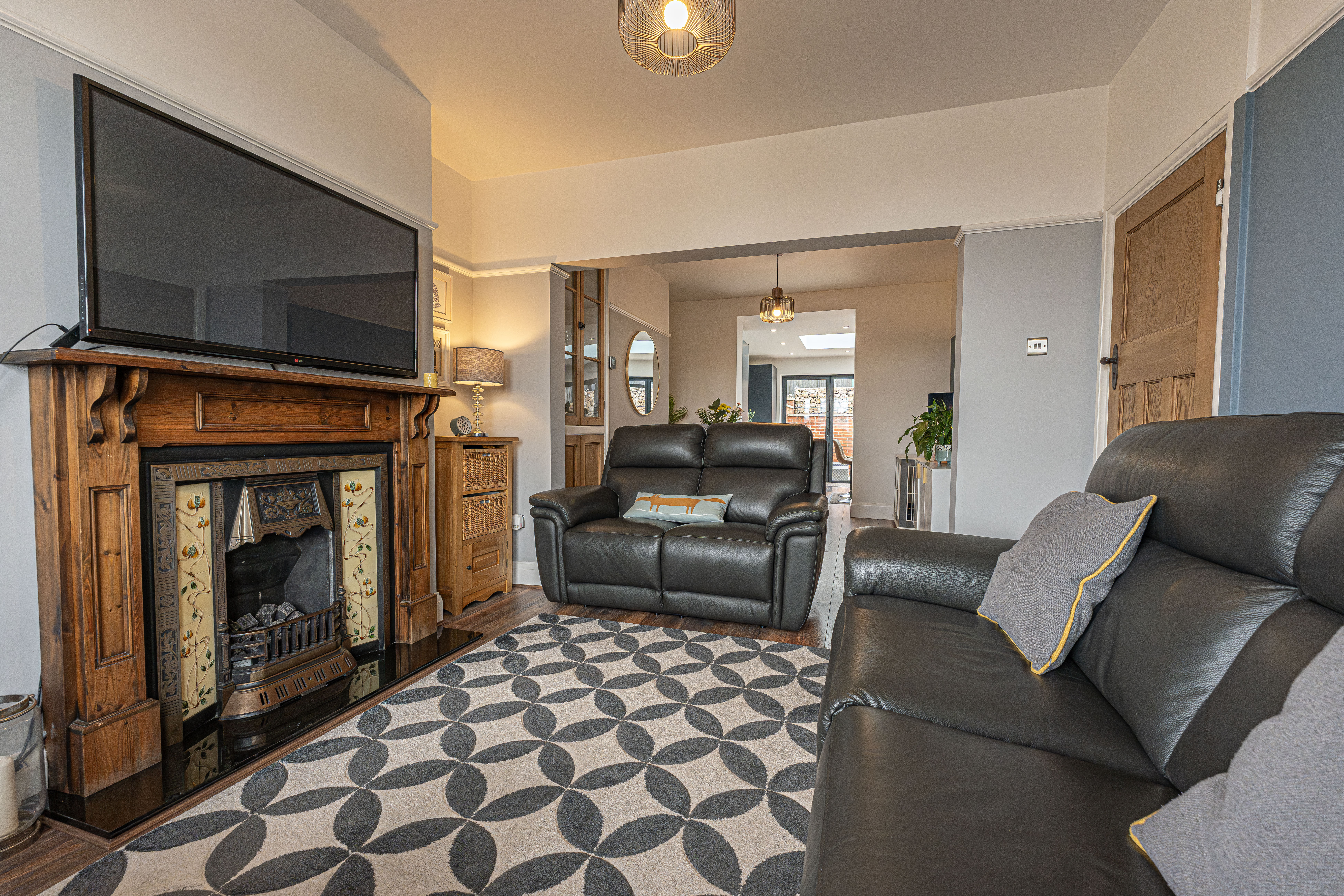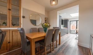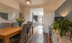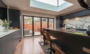 This attractive property has been renovated to an impeccable standard throughout, offering a beautifully presented space that is ideal for contemporary family living. The property boasts two beautifully presented reception rooms connected by a fluid open plan design, offering a flexible and attractive space for residents to relax and entertain visitors. The front facing living room is lit up by bay windows, and features a charming period fireplace for a charming decorative touch. At the rear of the house we have the impressive kitchen extension, featuring a stylish modern design with a large breakfast bar, ample counter space, and abundance of storage options with sleek cabinetry throughout. The kitchen also benefits from a flood of natural light streaming in through an overhead skylight and bi-fold windows that effortlessly open out to the garden. Numerous high-end appliances are integrated into the worktop, such as a full length fridge, freezer, dishwasher, double oven/microwave and induction hob with extractor. The kitchen sink is also fitted with an ‘InSinkErator’, with boiling water tap and waste disposal system. Additional space for laundry machines can be found from the hallway with the W.C, which doubles up as a helpful utility room, while fitted understairs storage is available from the entry hallway.