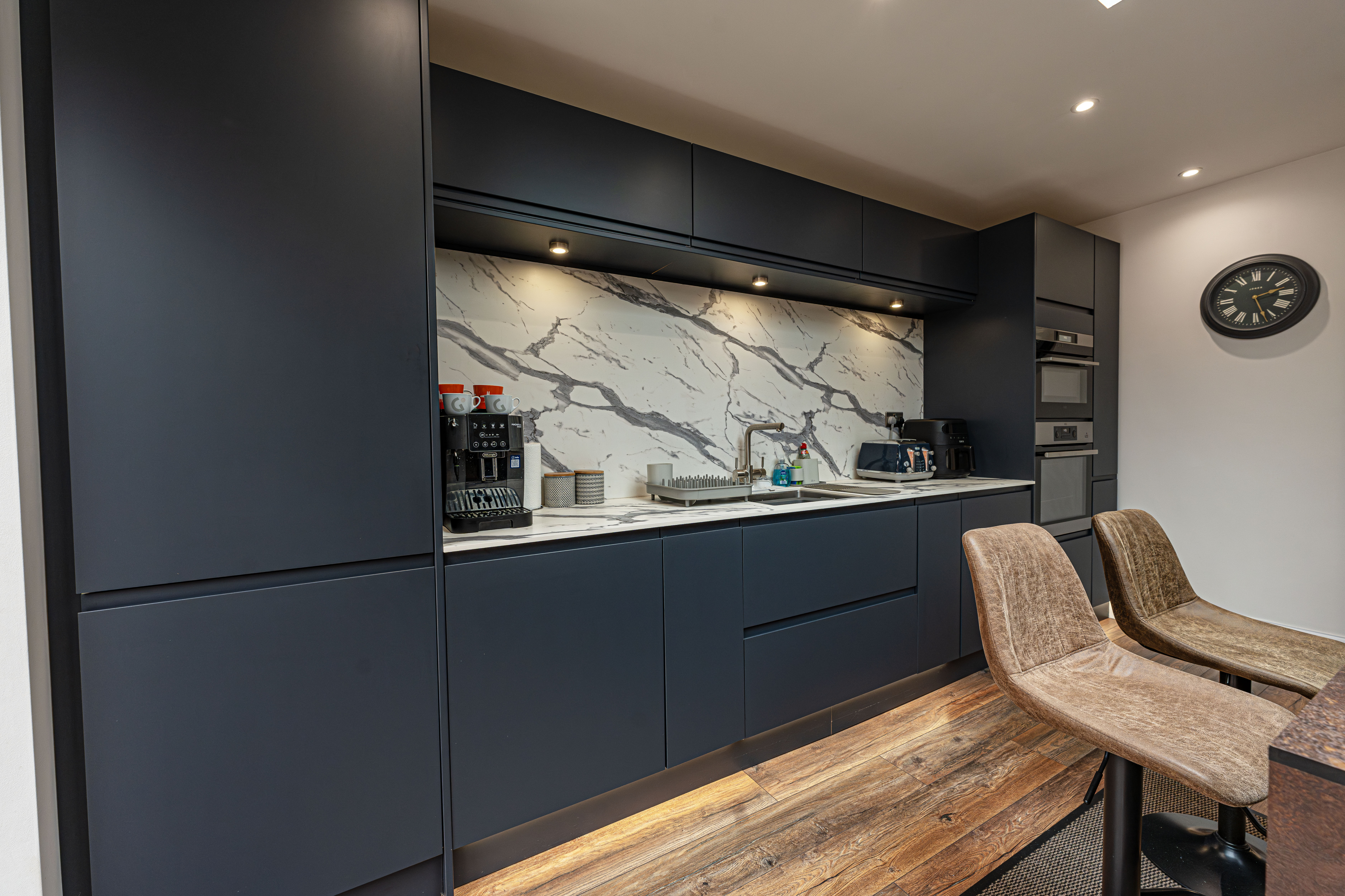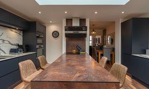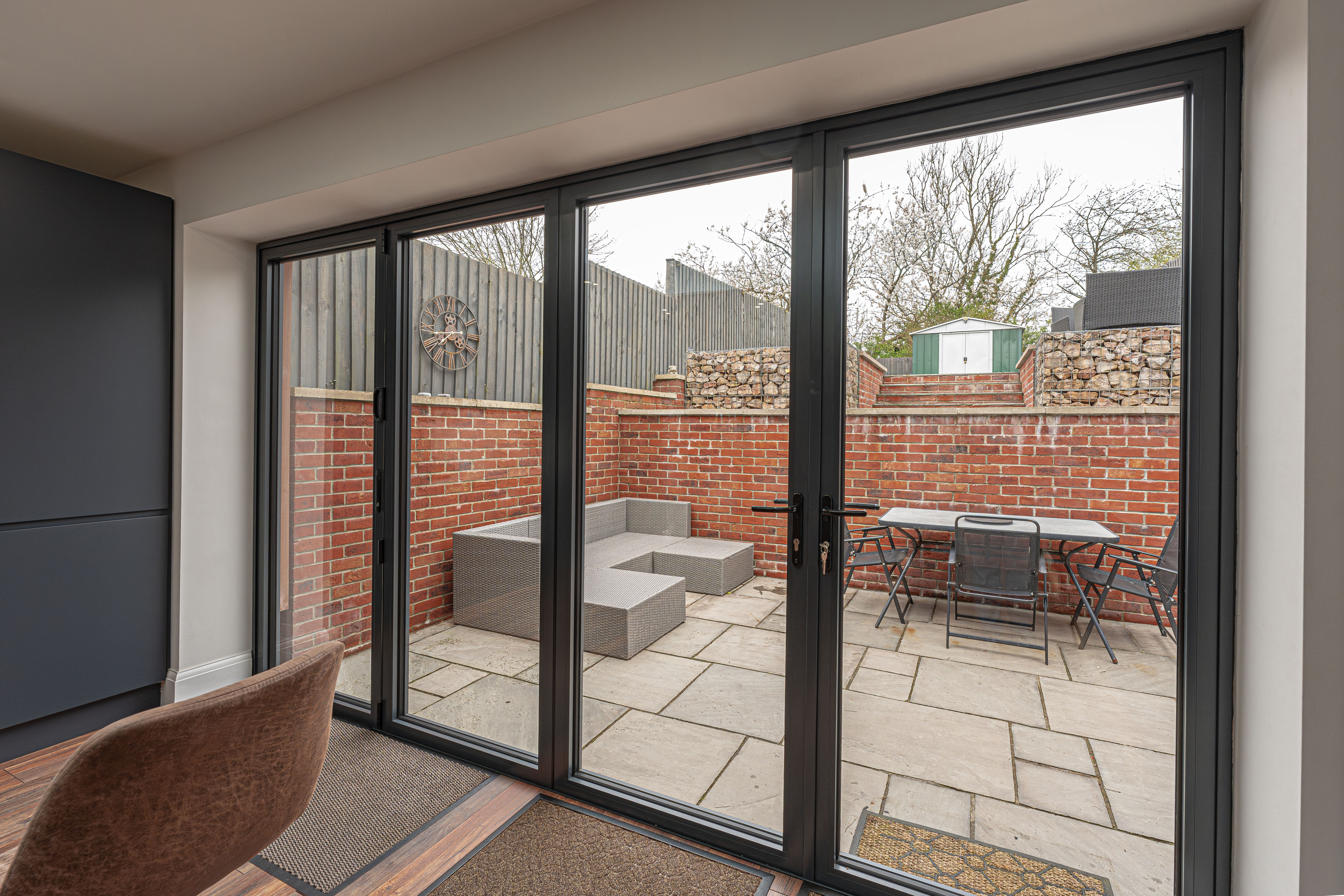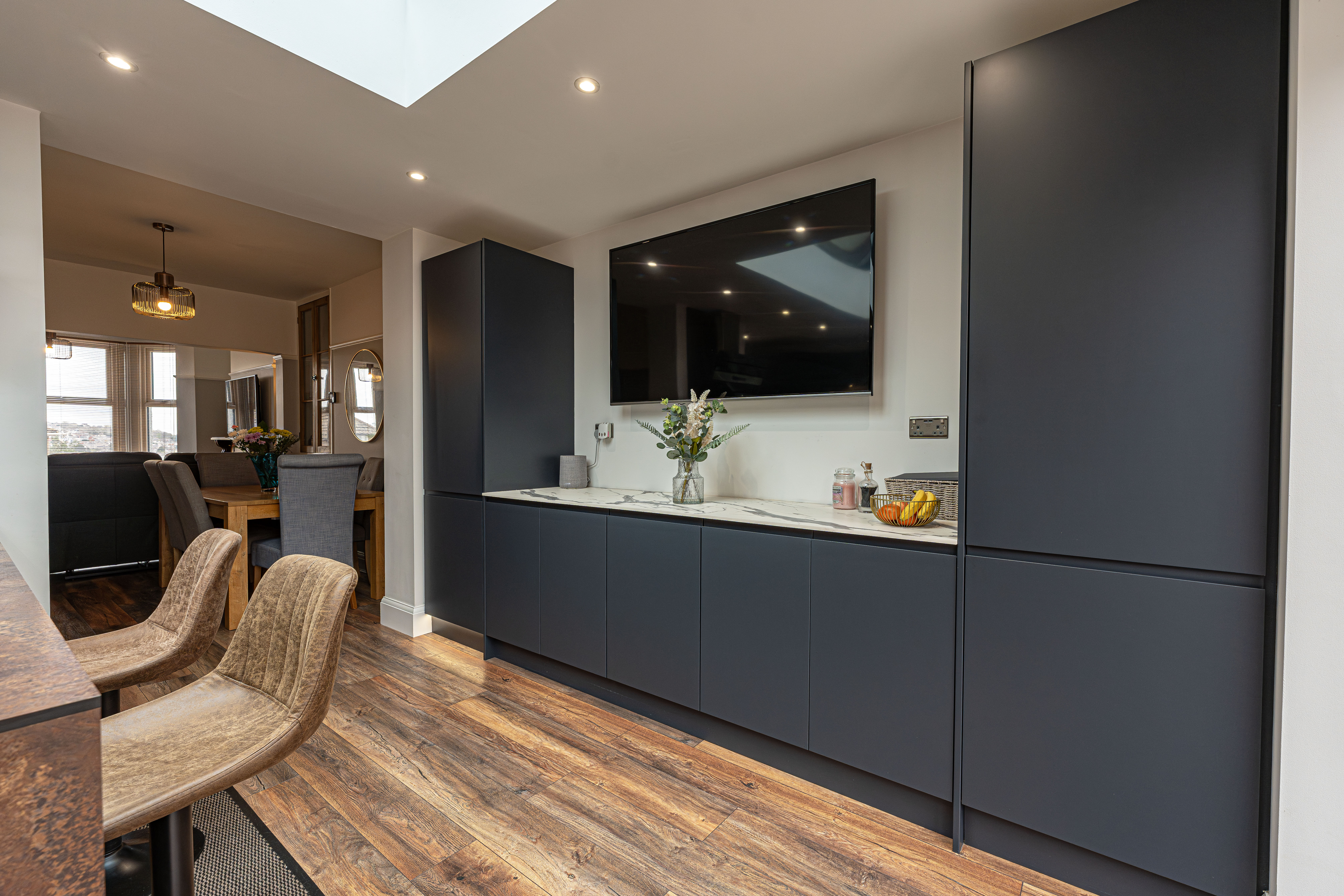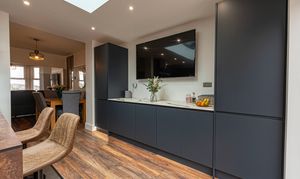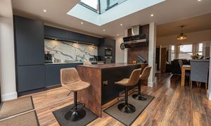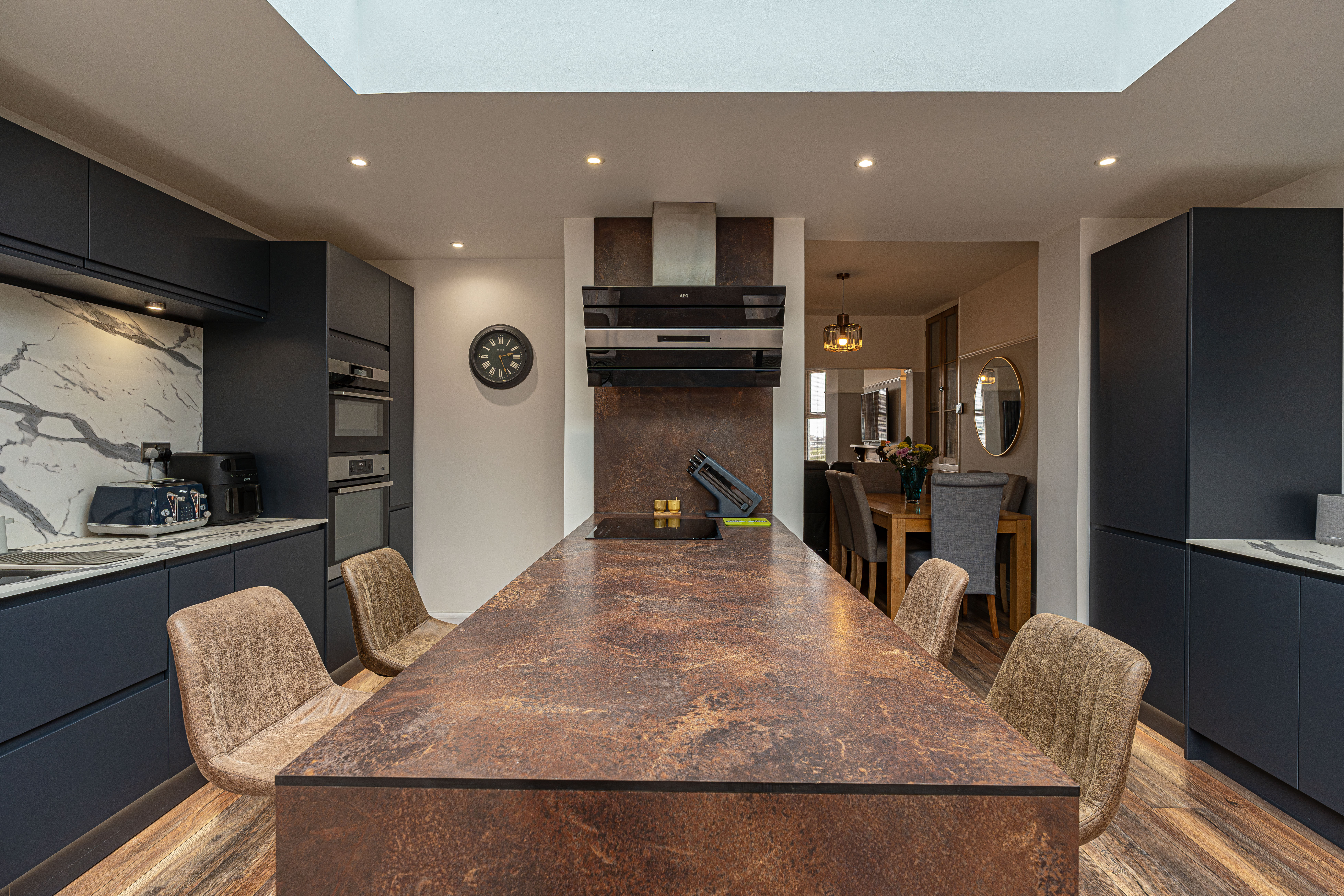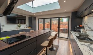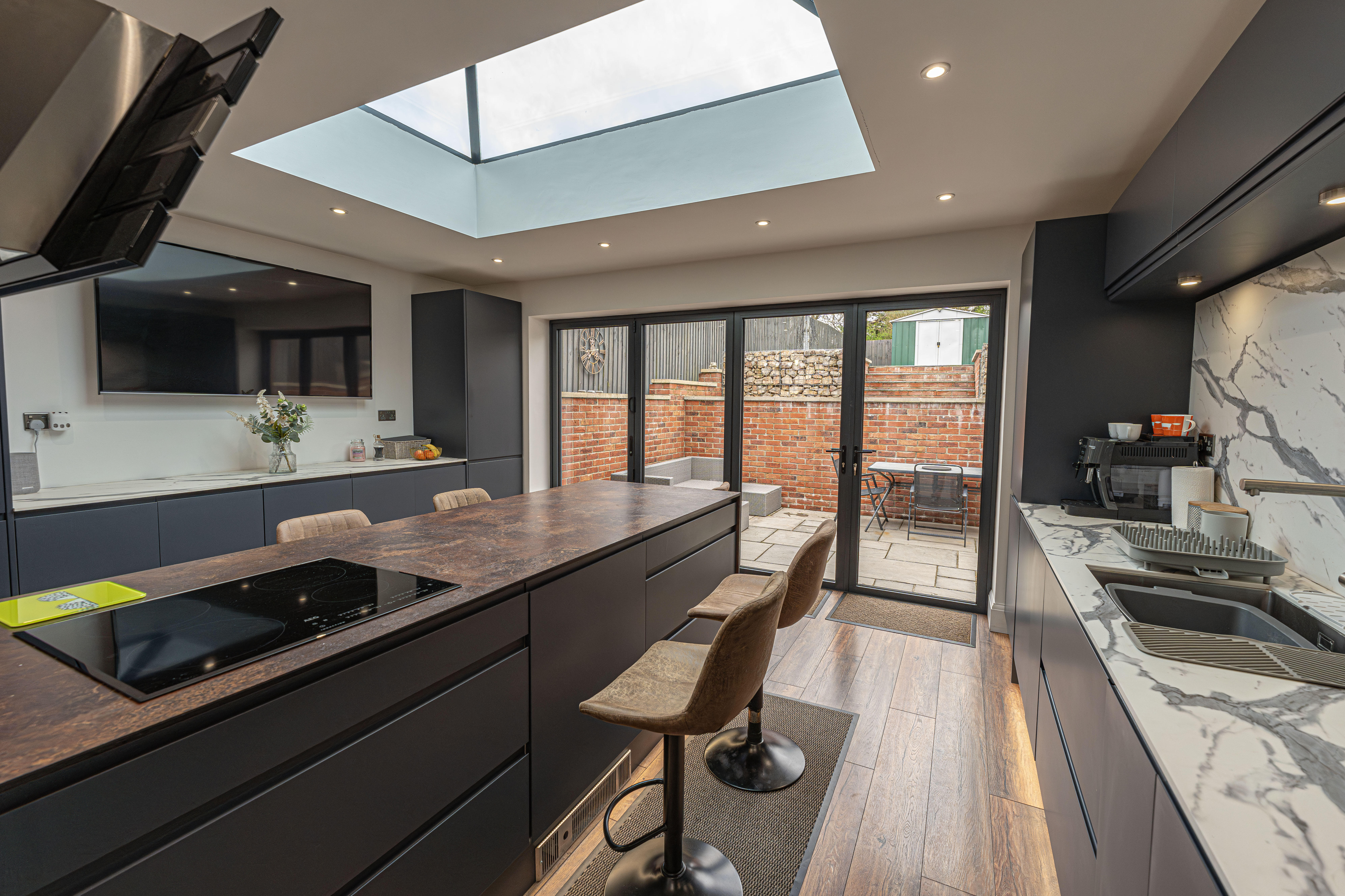This attractive property has been renovated to an impeccable standard throughout, offering a beautifully presented space that is ideal for contemporary family living. The property boasts two beautifully presented reception rooms connected by a fluid open plan design, offering a flexible and attractive space for residents to relax and entertain visitors. The front facing living room is lit up by bay windows, and features a charming period fireplace for a charming decorative touch. At the rear of the house we have the impressive kitchen extension, featuring a stylish modern design with a large breakfast bar, ample counter space, and abundance of storage options with sleek cabinetry throughout. The kitchen also benefits from a flood of natural light streaming in through an overhead skylight and bi-fold windows that effortlessly open out to the garden. Numerous high-end appliances are integrated into the worktop, such as a full length fridge, freezer, dishwasher, double oven/microwave and induction hob with extractor. The kitchen sink is also fitted with an ‘InSinkErator’, with boiling water tap and waste disposal system. Additional space for laundry machines can be found from the hallway with the W.C, which doubles up as a helpful utility room, while fitted understairs storage is available from the entry hallway.