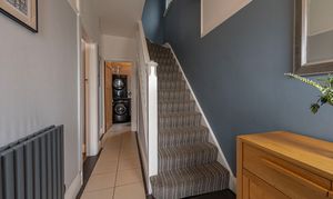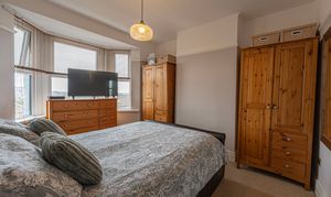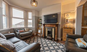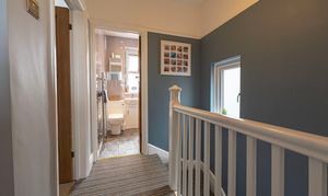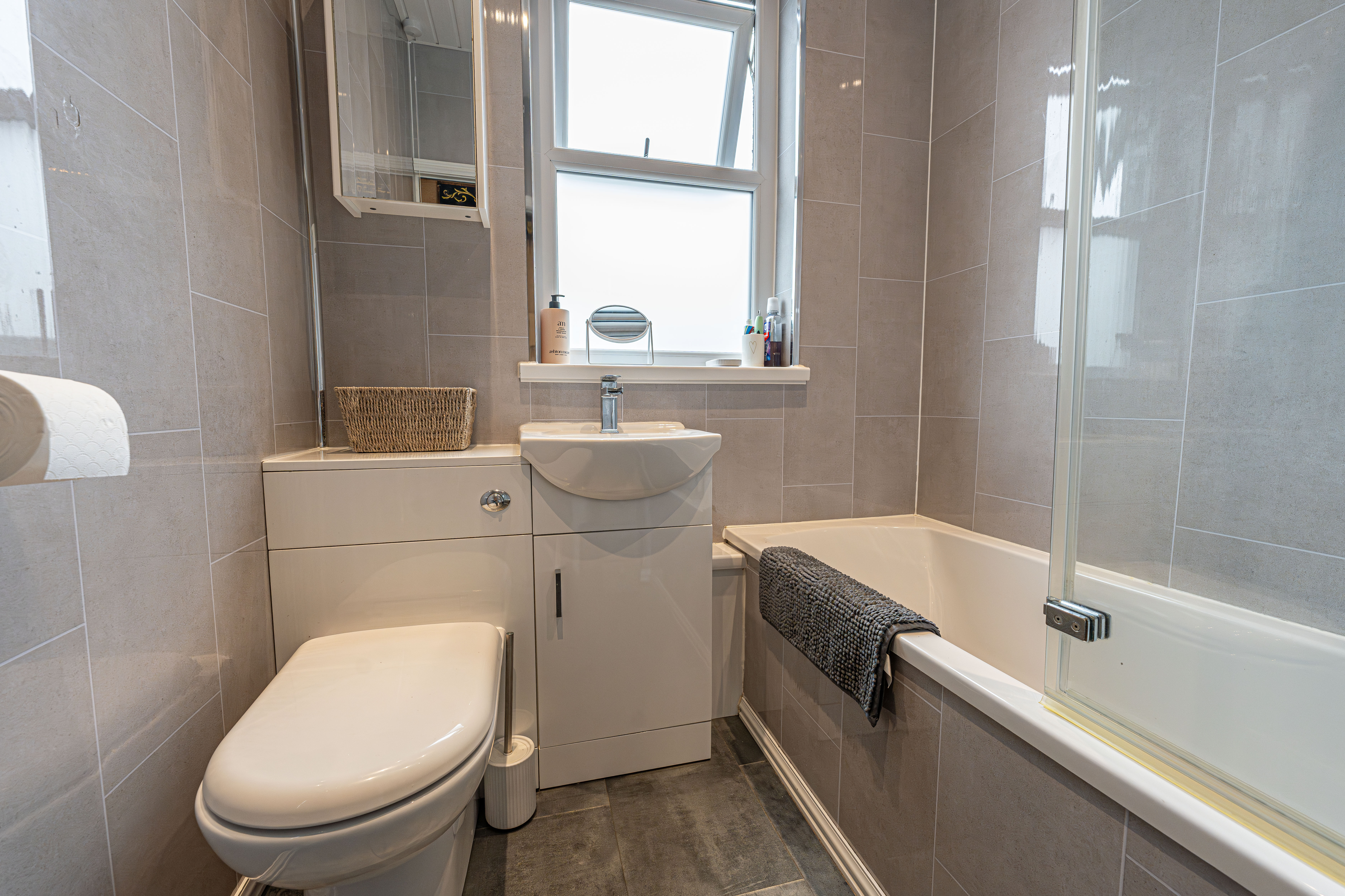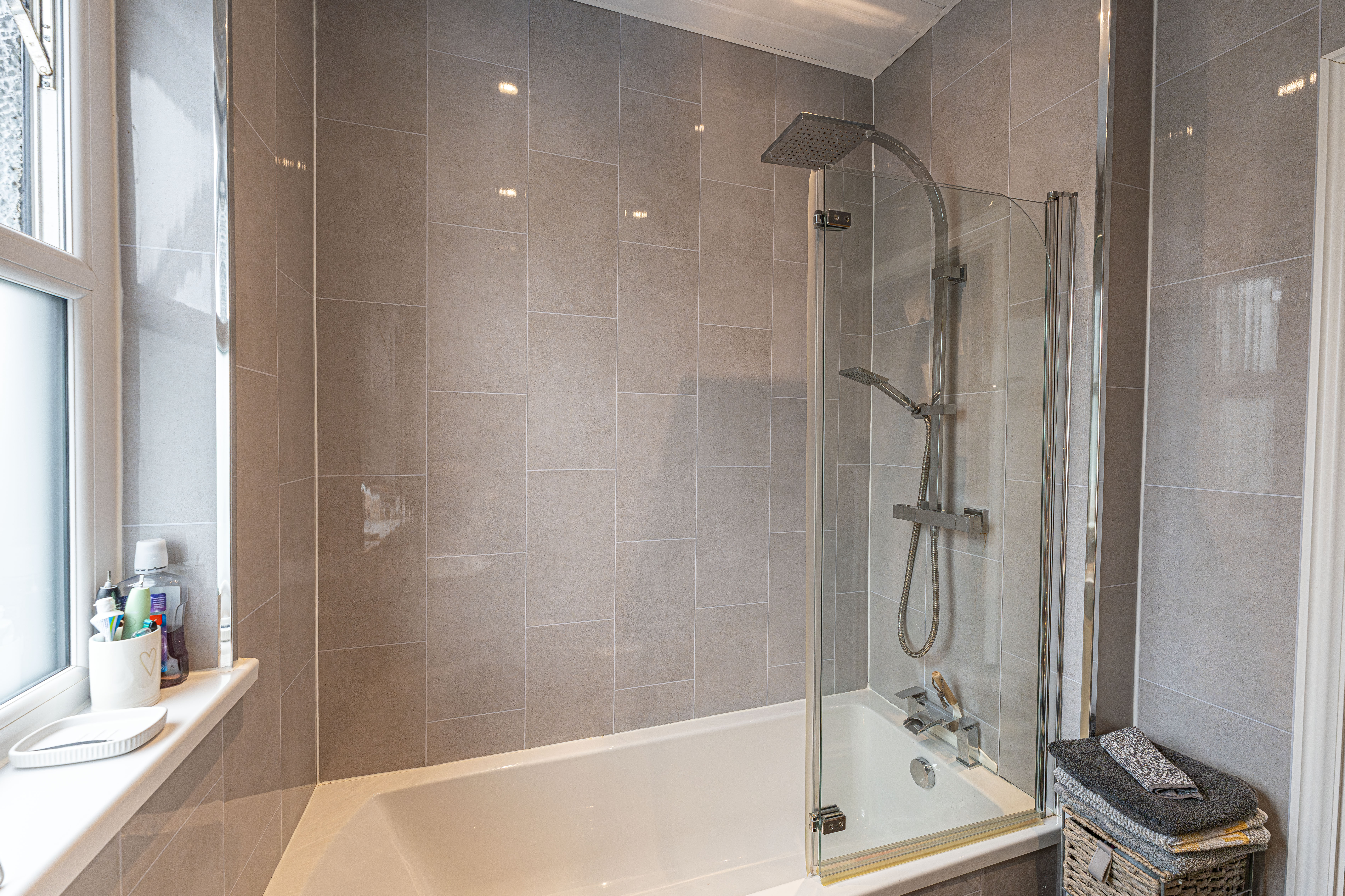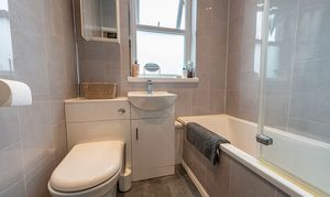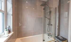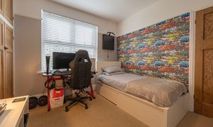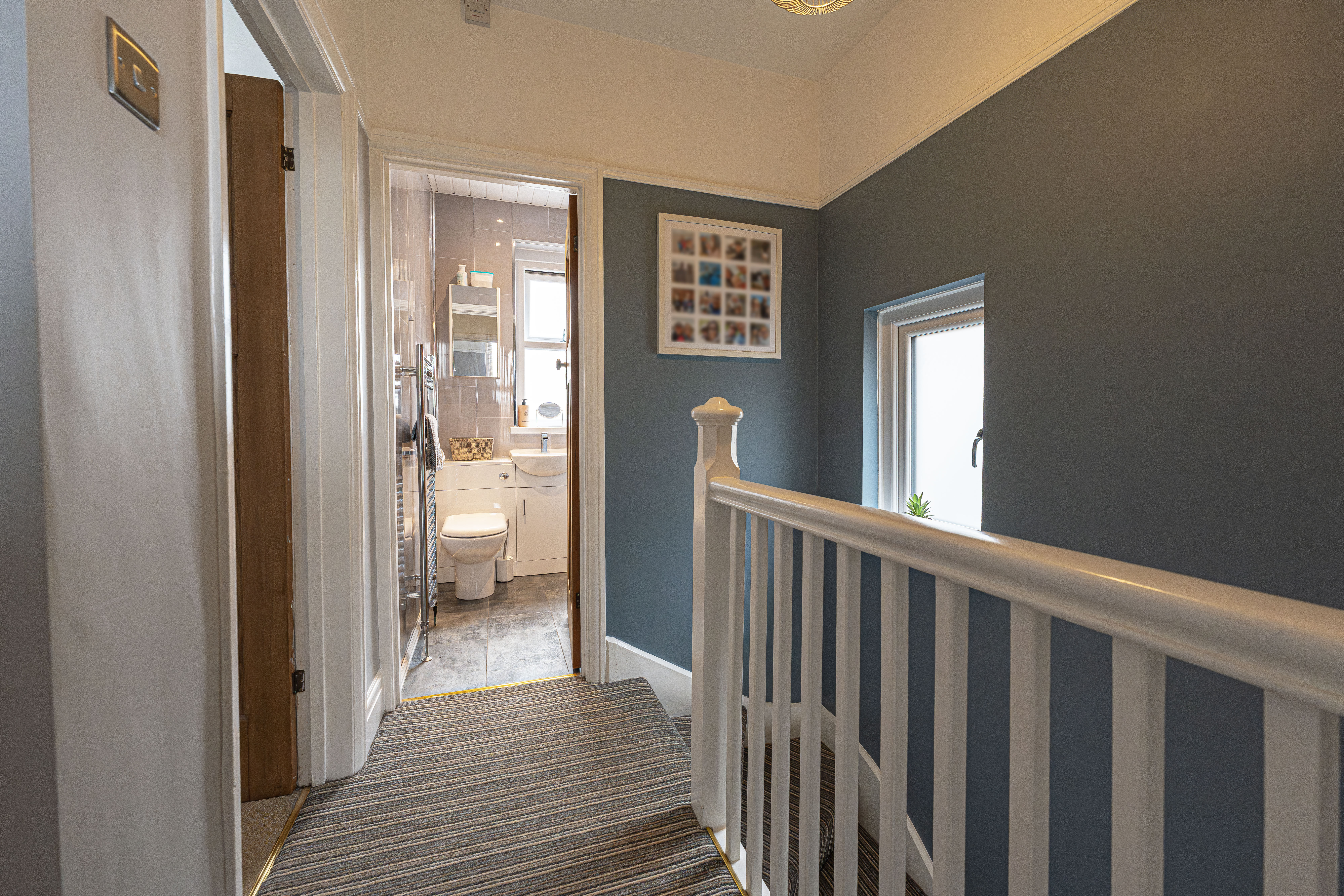To the first floor we have three bedrooms - two of which are double in size, with the front facing bedroom enjoying the glorious bay windows of the floor below, and the secondary bedroom featuring a fitted airing cupboard for added convenience. The third bedroom is a cozy single, and offers great potential for repurpose into a home office or dressing room. Also found on the first floor is the modern bathroom, with a toilet, bath suite and overhead mixer/rainfall shower.
