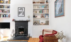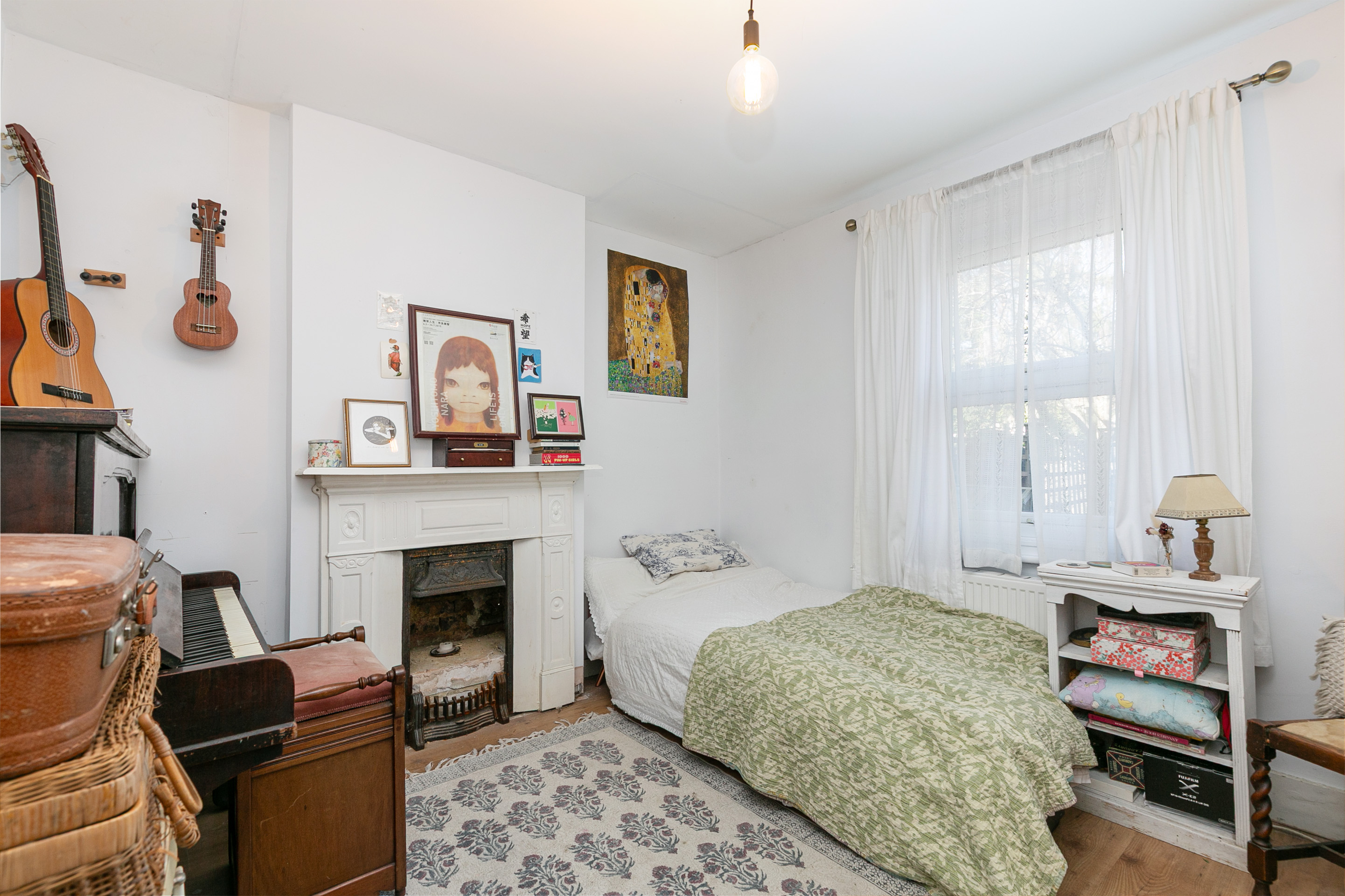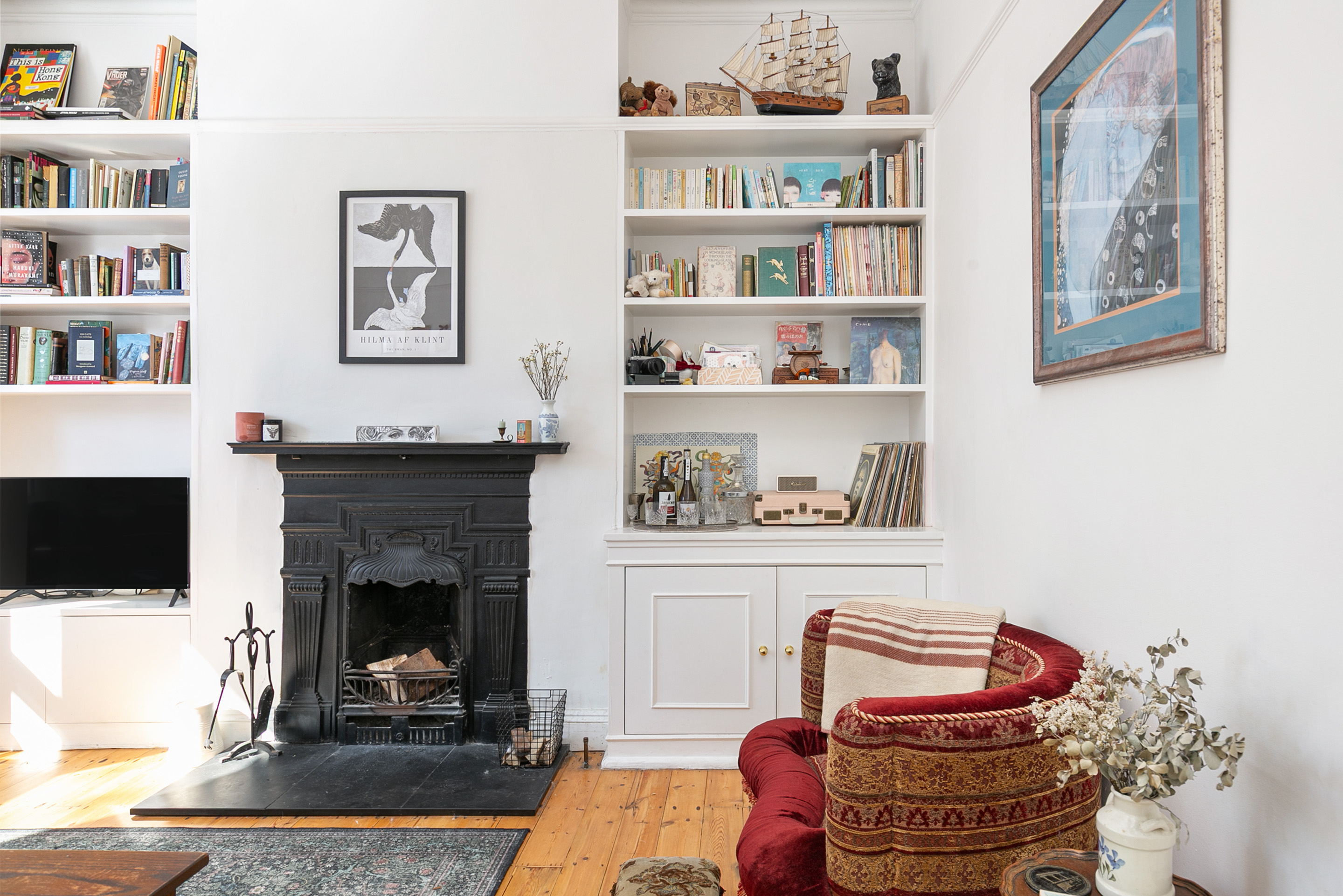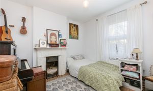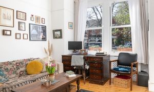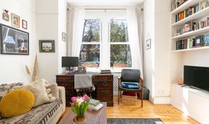 The flat has its own entrance, which is a real bonus for those with pets and who prefer privacy. The reception is at the front, measuring 15'5" by 12'2", and it features stripped wooden floors, original cornicing, and two large double-glazed sash windows overlooking the street through a mature tree. There’s built-in shelving in the alcove, which is great for storage and lets you style the room as you wish.