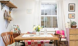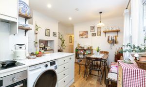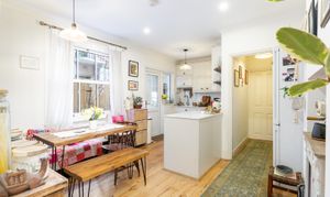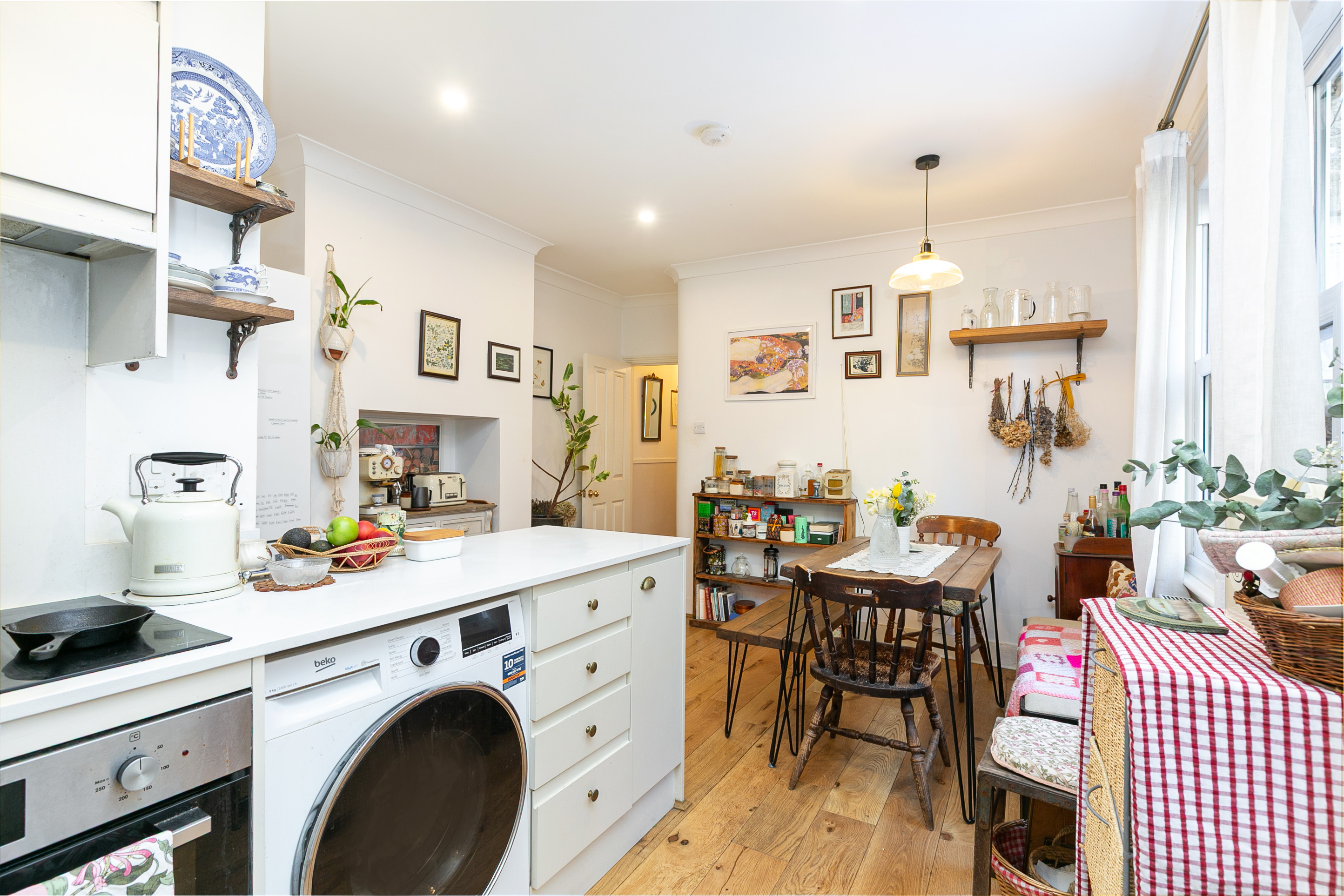 The layout opens towards the rear, where the kitchen and dining room meet — just under 17 by 12'5" — it’s a large and very sociable space. A full dining table with bench seating sits comfortably alongside the kitchen, which works as well for a weeknight dinner as it does for entertaining. The kitchen is crisp and contemporary, with white cabinetry and white tops. It’s arranged in an L-shaped configuration, which creates plentiful worktop space, and there is also a great amount of storage space.