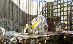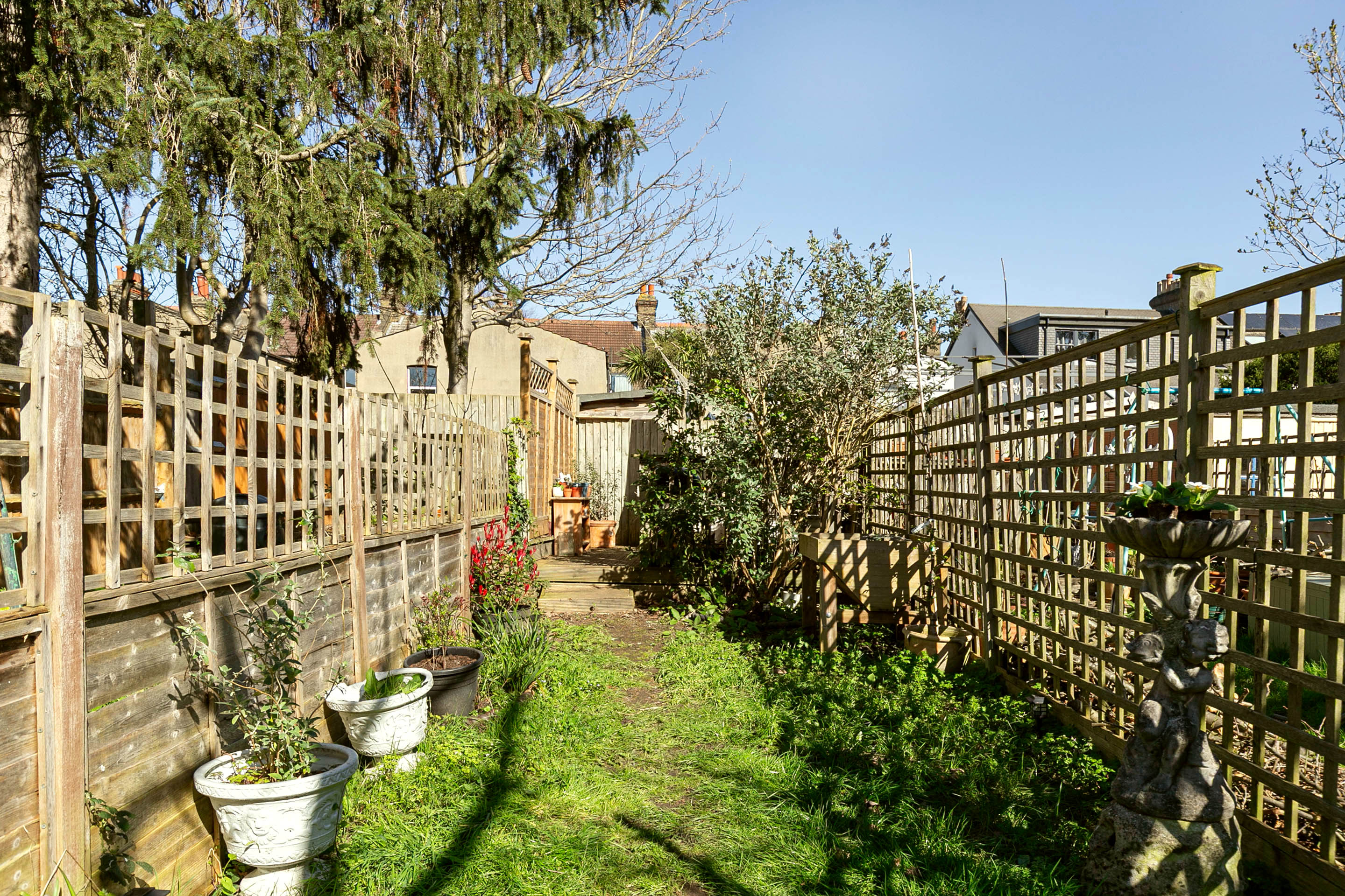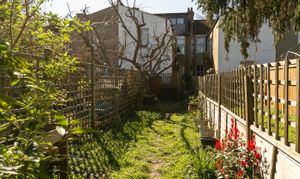 Moving outdoors, the flat has a very cute al fresco dining space adjacent to the dining space, in the side return, and the garden runs to nearly 60 feet, planted on both sides with a central path — it's ready for someone to put their mark on it.