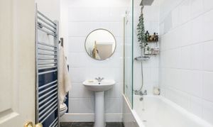 Both bedrooms are doubles, with the larger at the rear, overlooking the gardens. The rear room has a feature period fireplace, and like the second bedroom, has a calm and classic feel about it. Like all the windows throughout the flat, they have high-quality double-glazed sash windows, which retain the period look and charm but importantly are highly insulative and help keep energy bills in check.