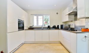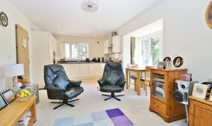 The entrance hall has a built-in storage cupboard and doors through to all principal rooms. The spacious kitchen/living area is a triple aspect room with a window to the front, a bay window to the side and French doors overlooking the rear.