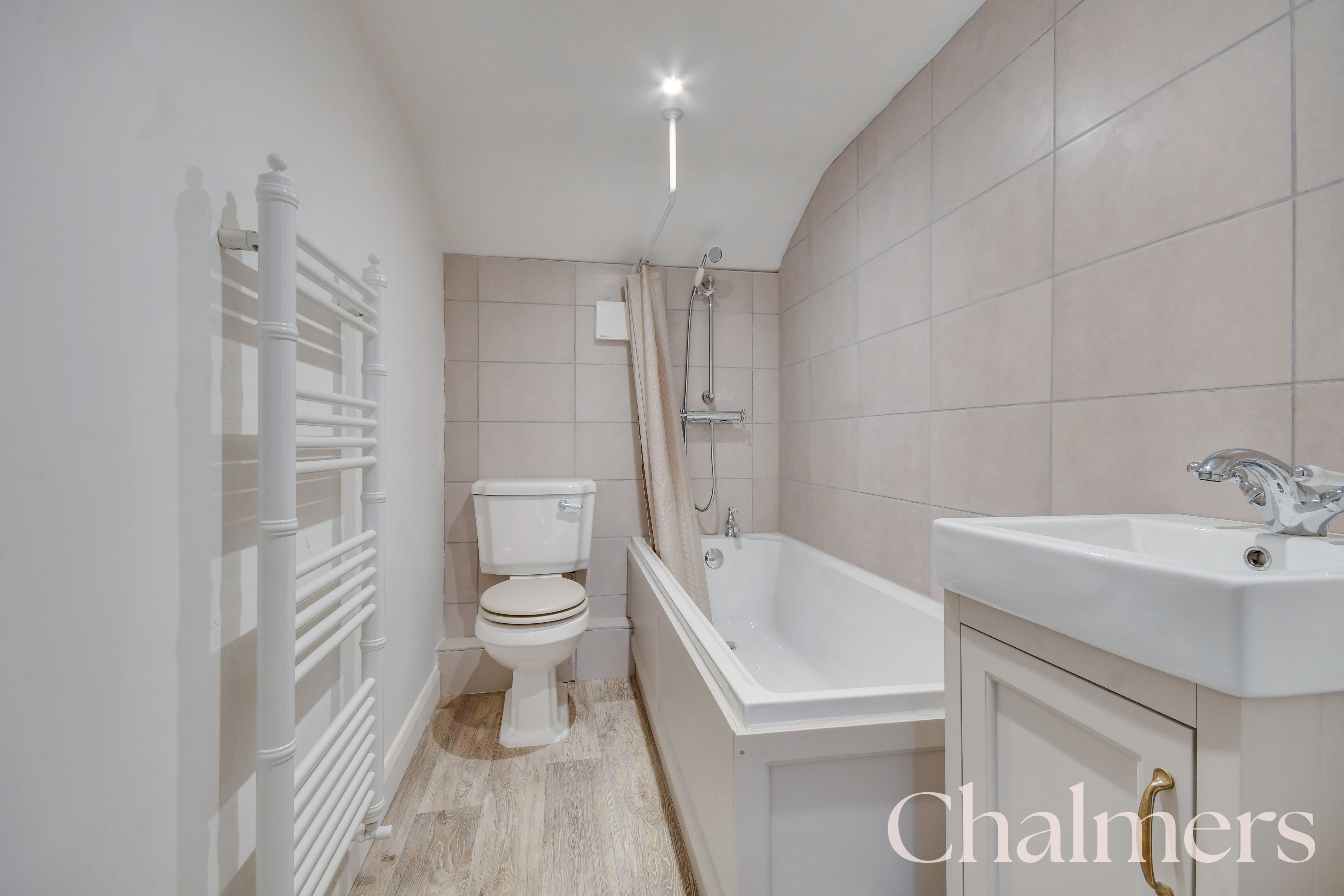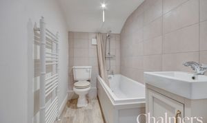 Shower over the bath, heated towel rail, basin with vanity unit and wc.