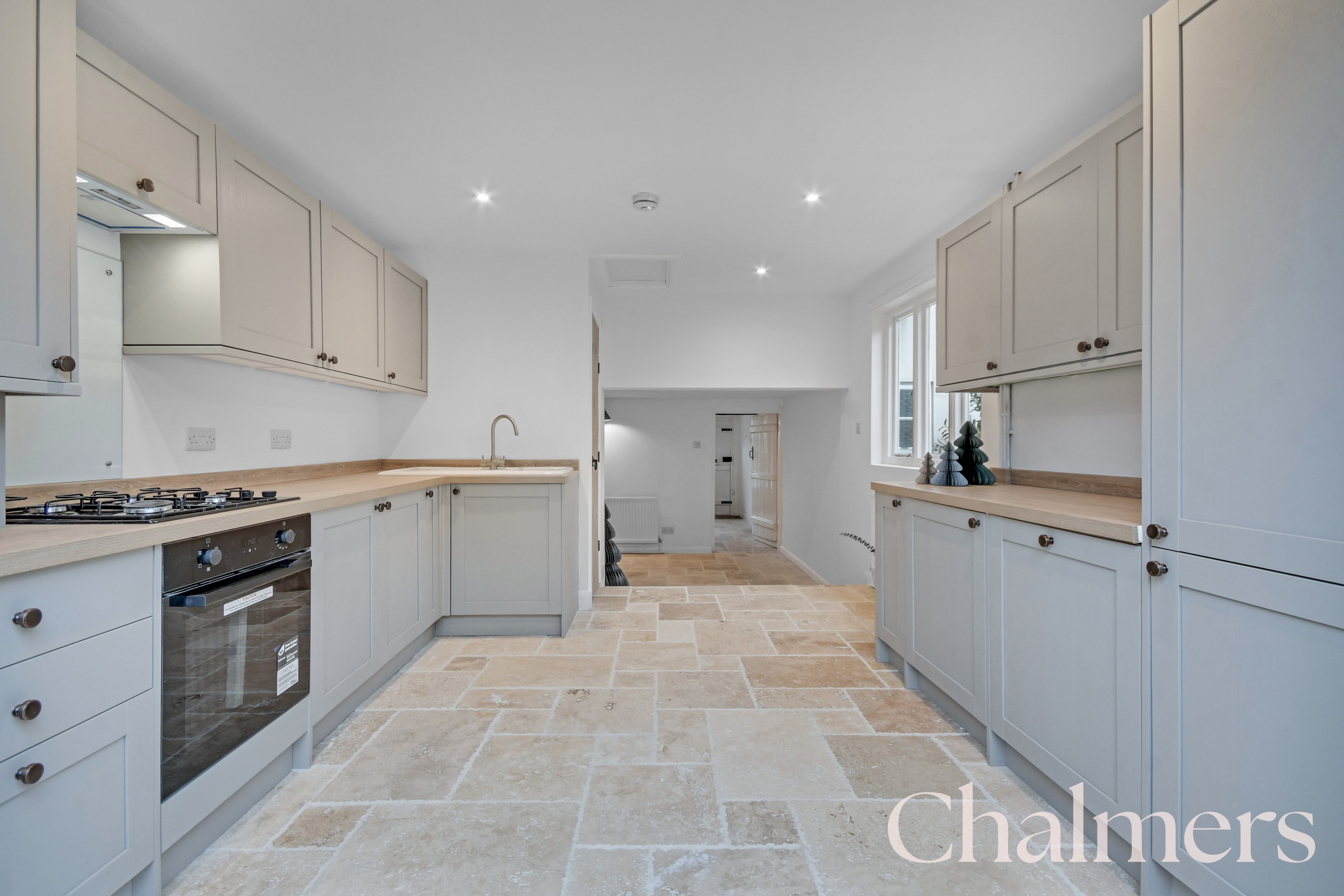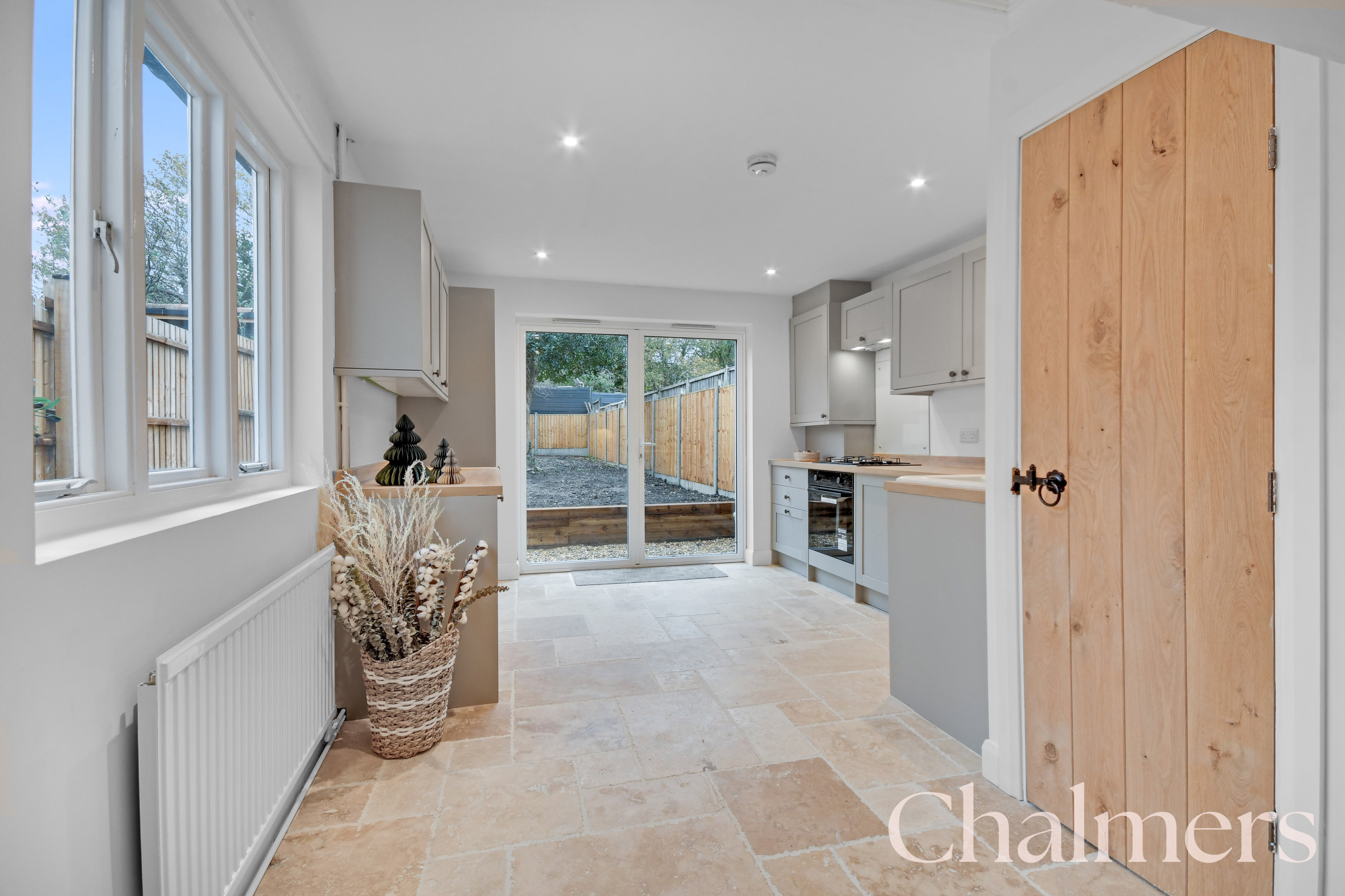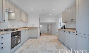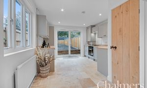 The show-stealing room of the house, newly fitted kitchen in light units, integral applicances, beautiful tiled floor and french doors leading out to the garden.