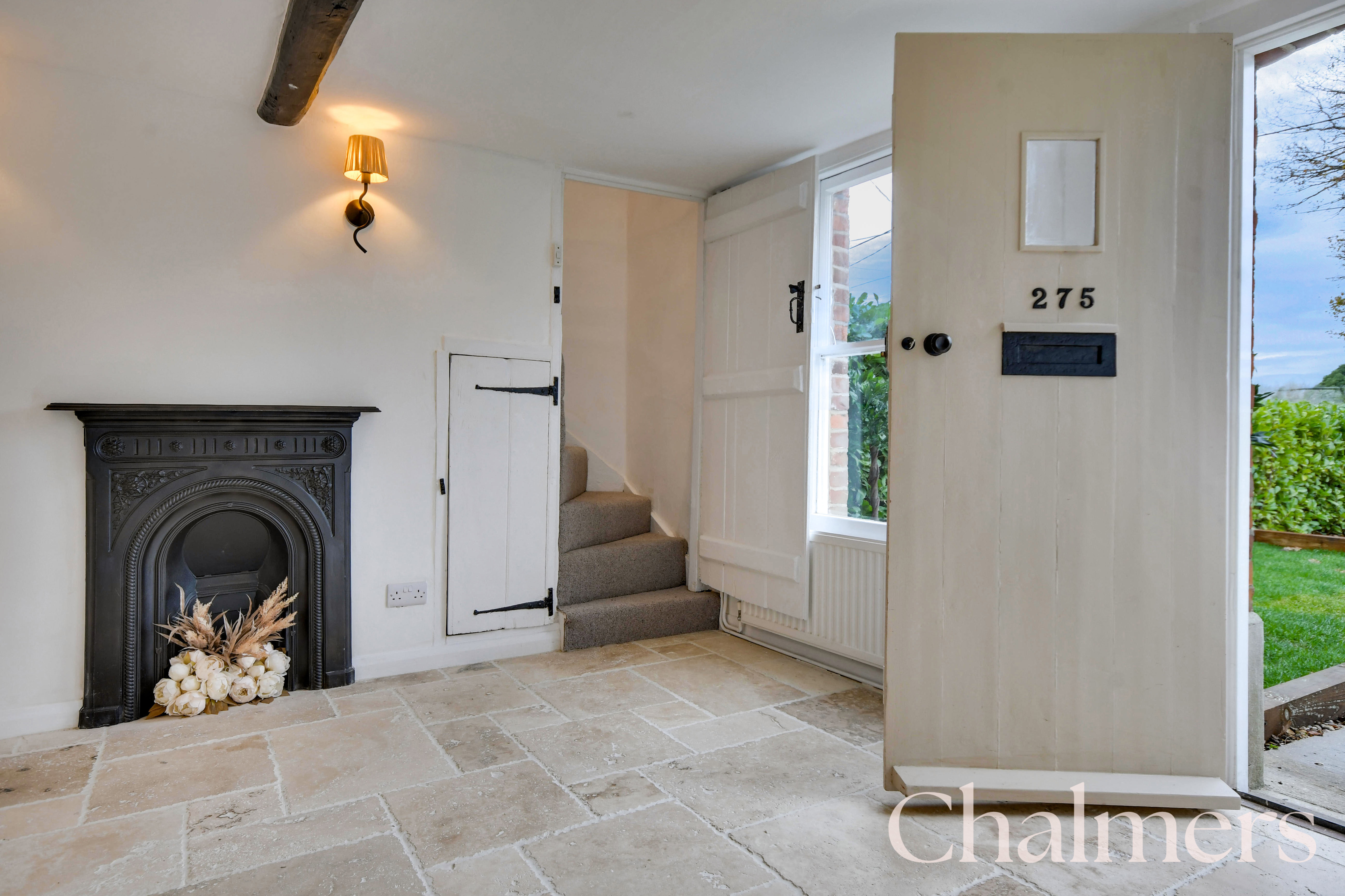 Full of character and a stunning first impression, fireplace, storage, door leading to stairs and tiled floor.