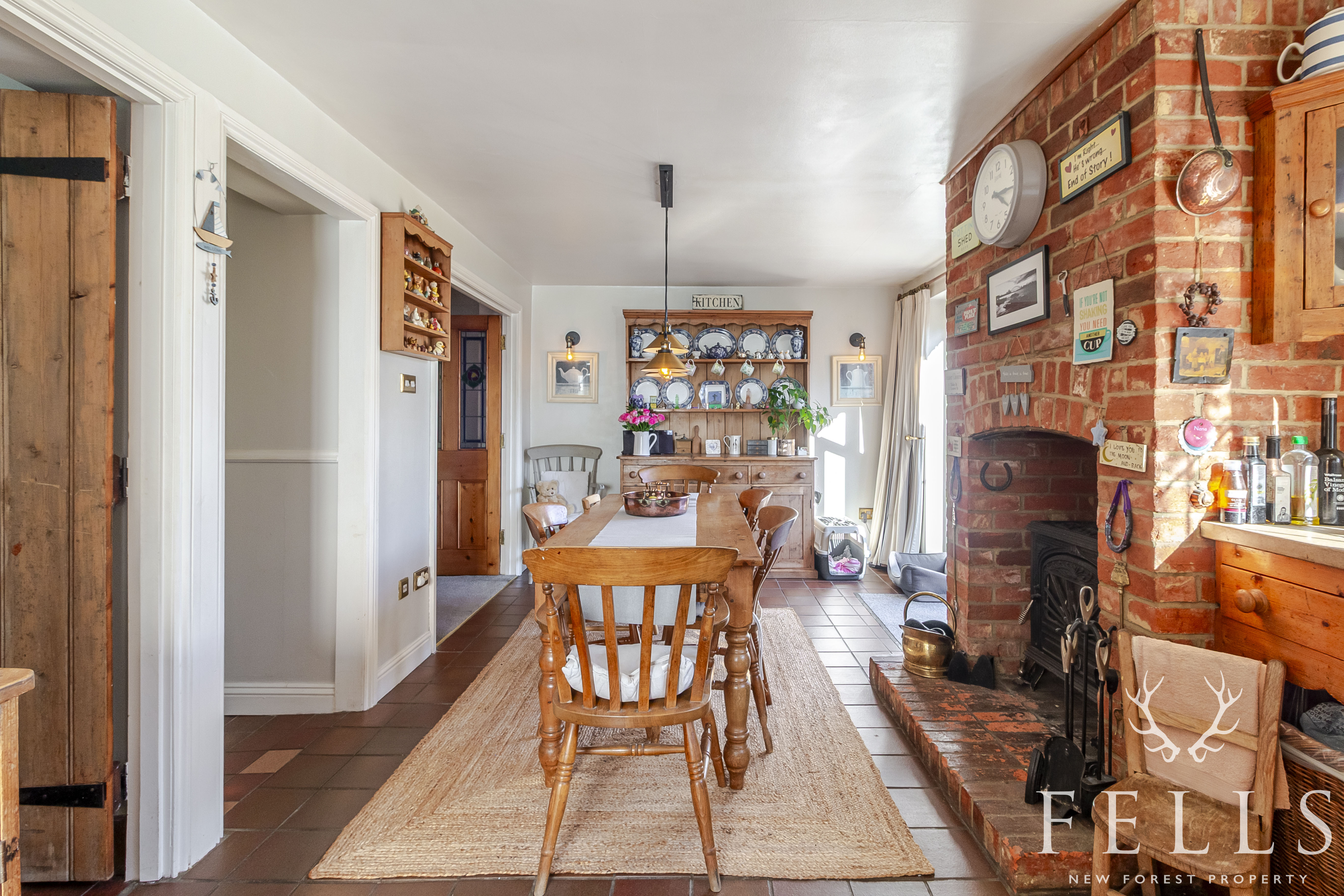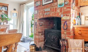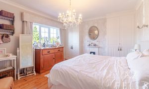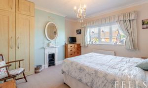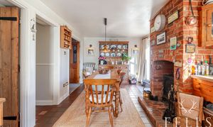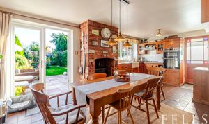 The ground floor offers remarkable versatility. A front room provides the perfect snug or could serve as a fifth bedroom if required. The main living room carries a sense of elegance, with ornate coving, ceiling roses and a striking open fireplace with marble surround, complemented by stained glass double doors that flow through to the kitchen dining room. Here, the heart of the home, farmhouse-style cabinetry, a Belfast sink, double ovens and a characterful brick chimney with woodburning stove create a warm and inviting setting. French doors draw you to the garden beyond, while a separate utility keeps the household organised with plenty of storage and appliance space.