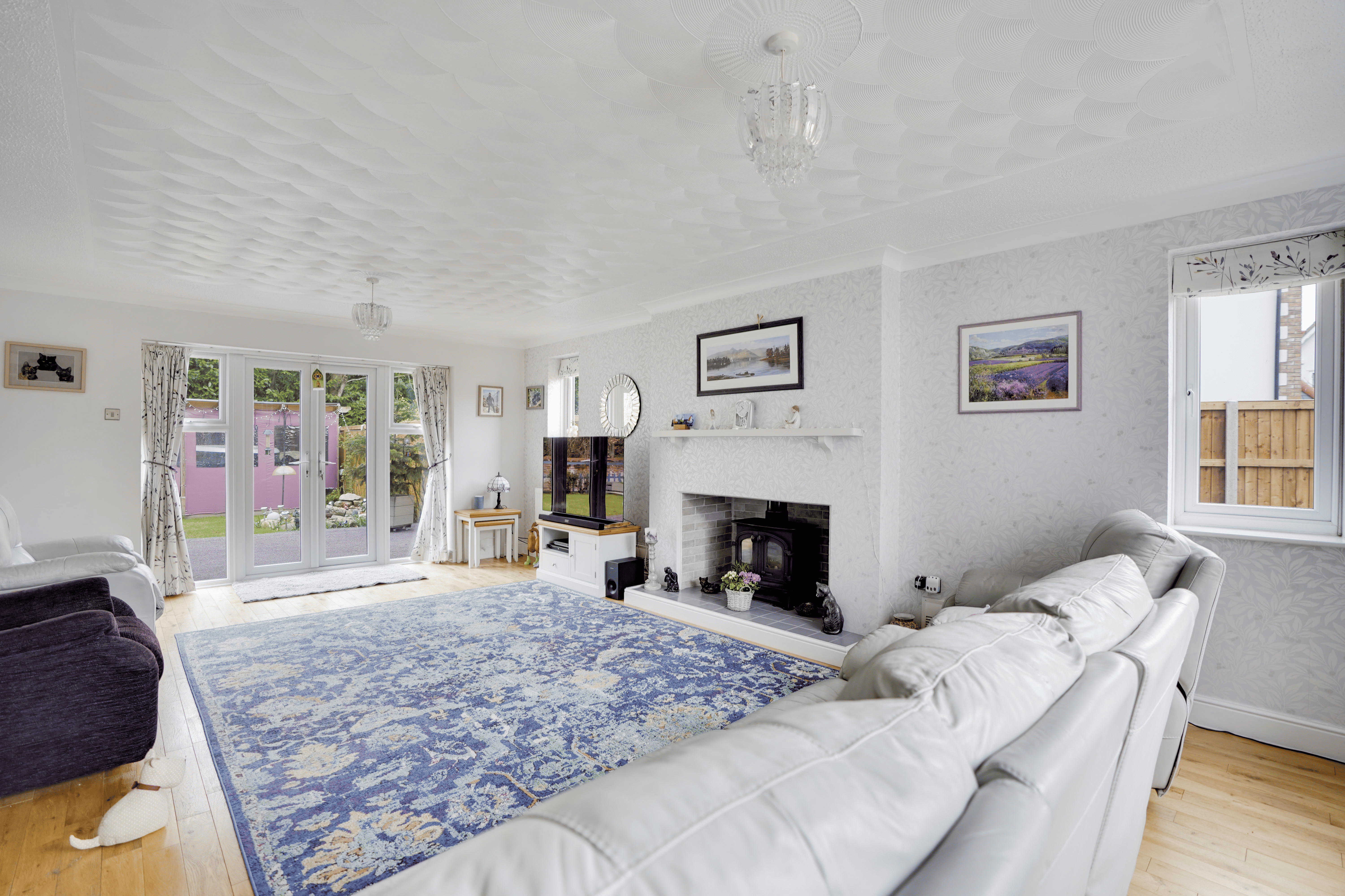 Dual aspect living room with windows to the front aspect and French doors to the rear, leading into the private rear garden. Fireplace with log burning stove.