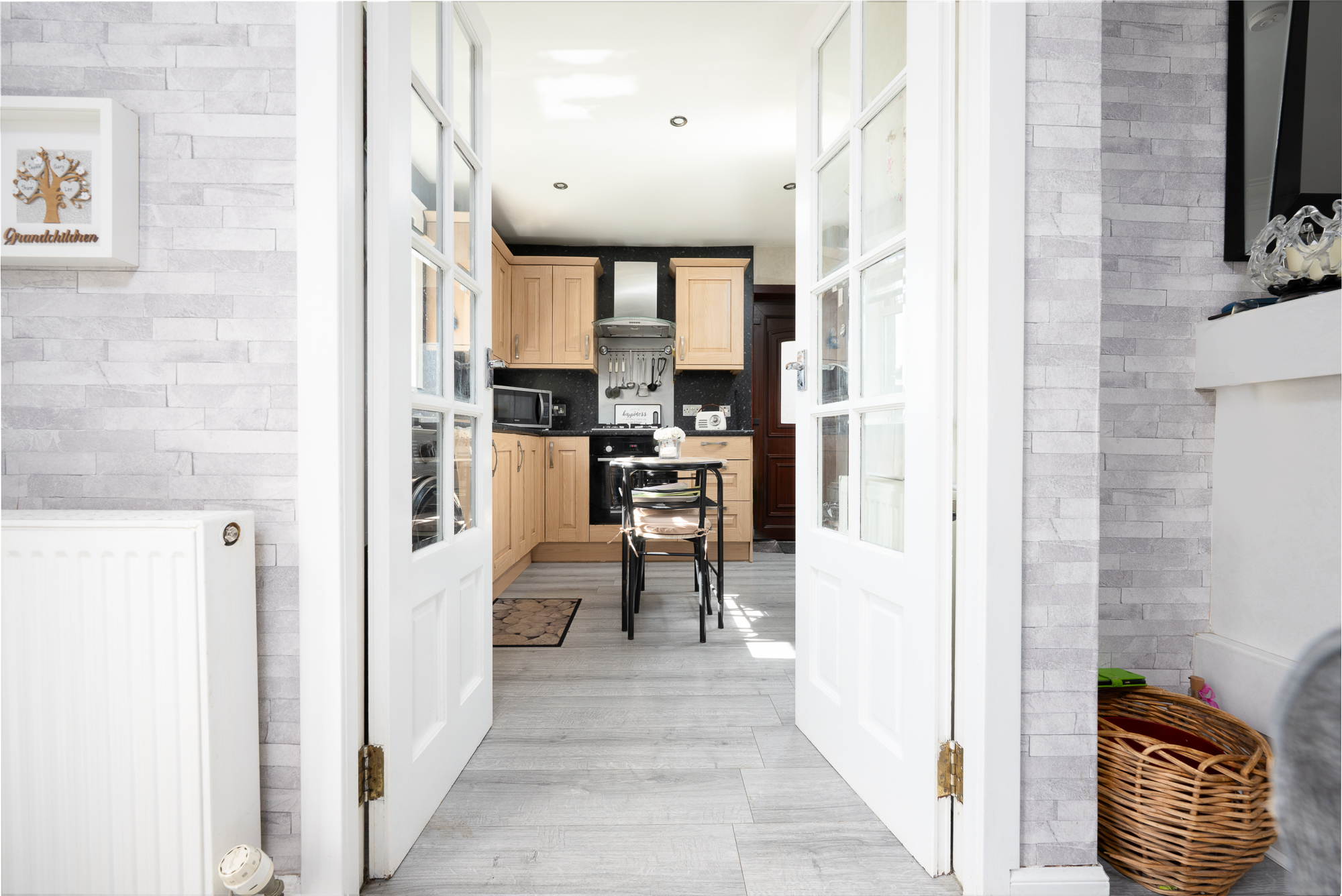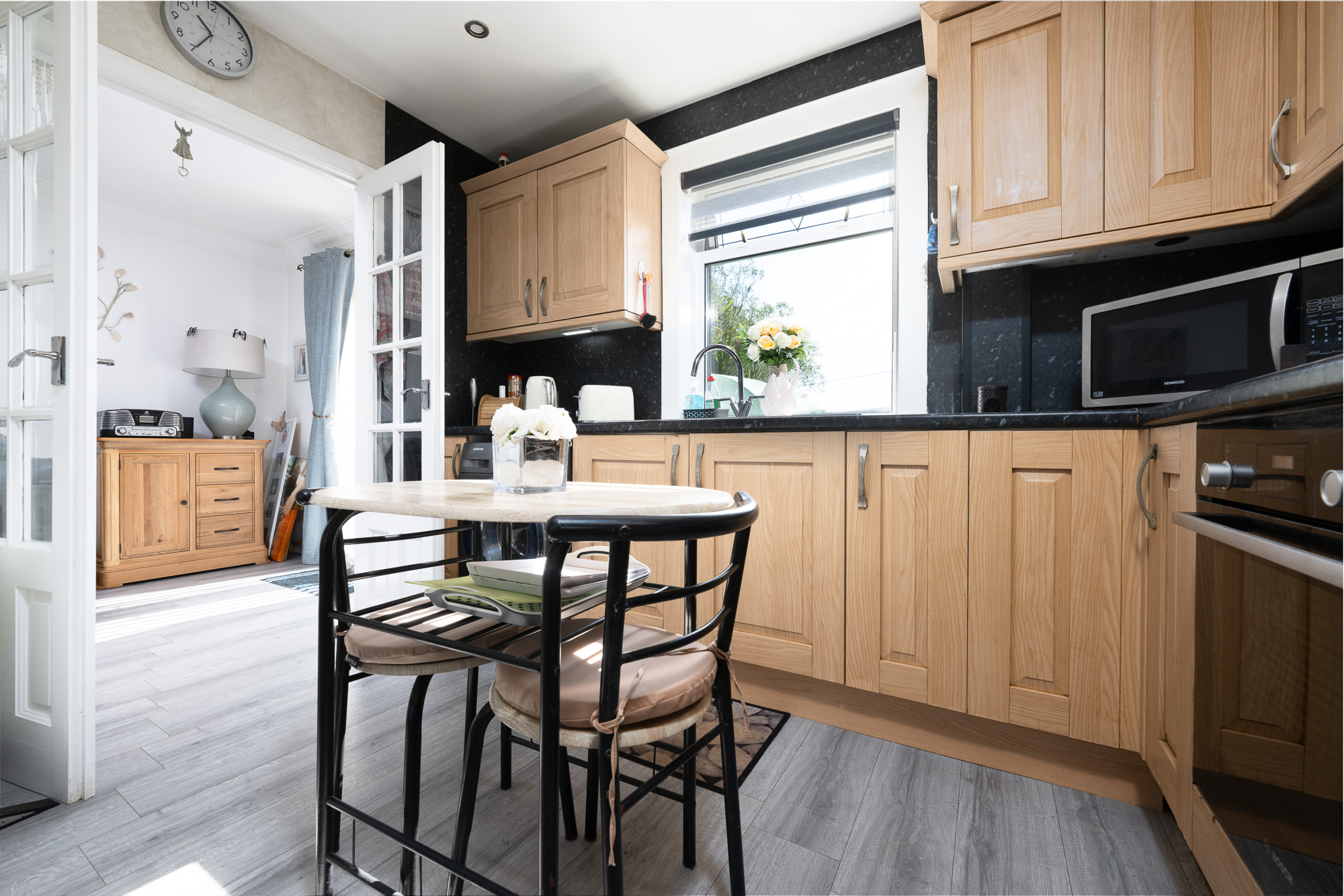 - Living/dining area with direct garden access and elegant French doors leading through to the bright, modern kitchen.