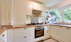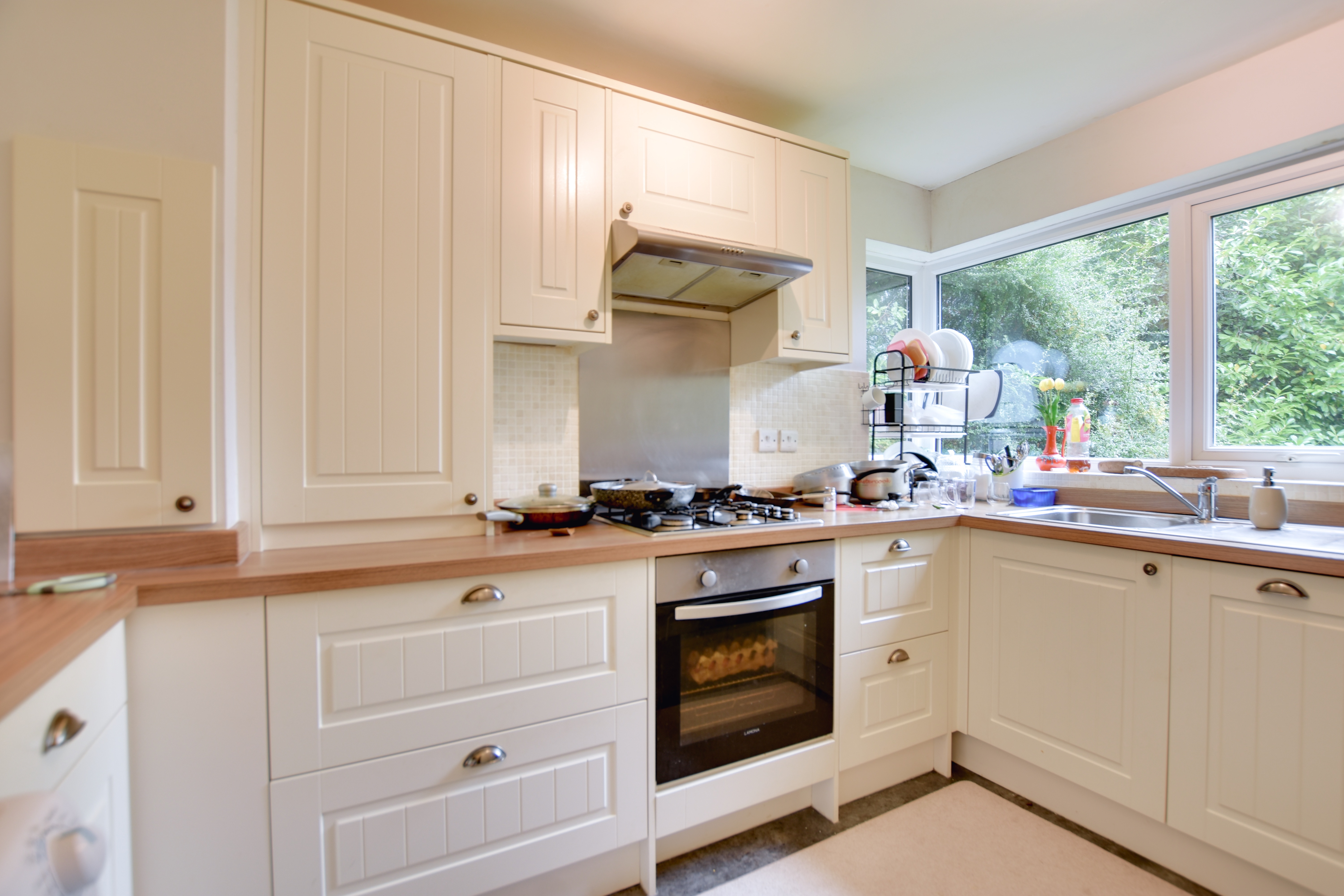 With double glazed window to the front elevation, stainless steel sink and drainer unit with a range of wall and base units with work surface over, built-in oven and gas hob with filter hood over, stainless steel splashback, built-in dishwasher, plumbing for washing machine, cupboard housing boiler, radiator.