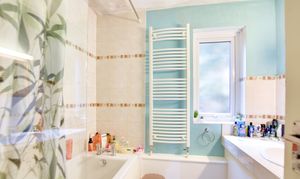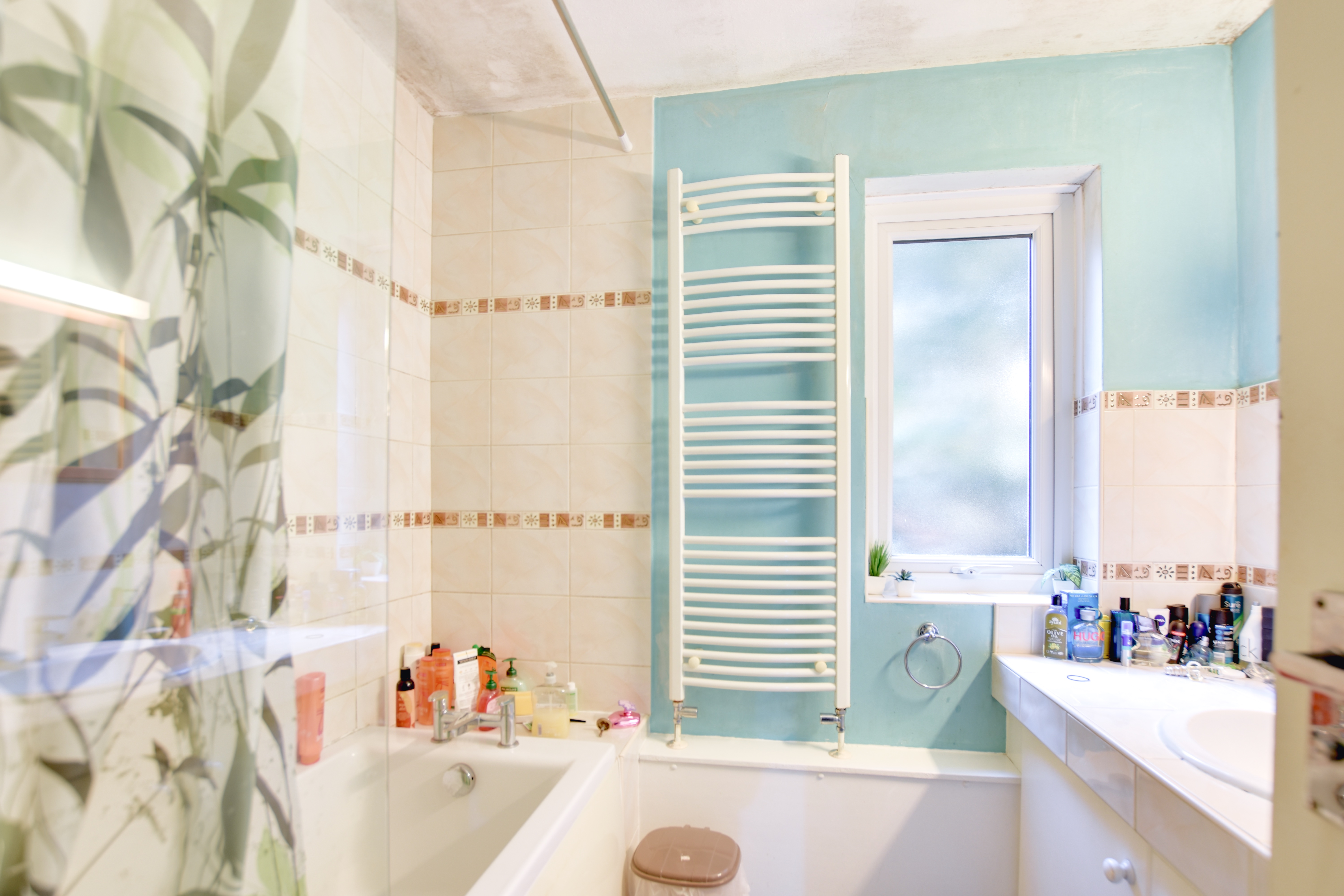 With double glazed window to the side elevation, bath with electric shower over, wash hand basin, part tiled walls, heated towel rail.