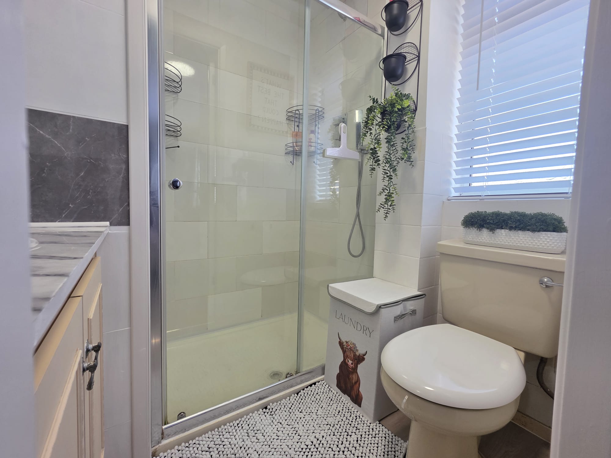 Containing walk-in shower cubicle, low level flush WC, base unit with worktop and integrated sink, tiled splashbacks and obscure UPVC double glazed window.