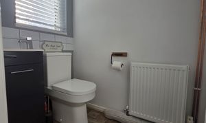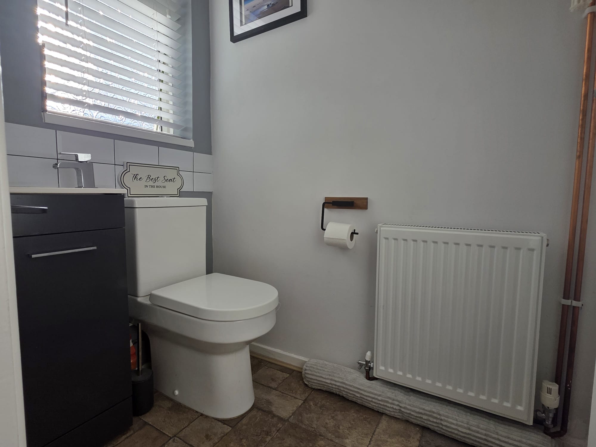 Complete with low level flush WC, vanity unit with integrated ceramic sink and mixer tap, tiled splashbacks, radiator and obscure UPVC double glazed window.