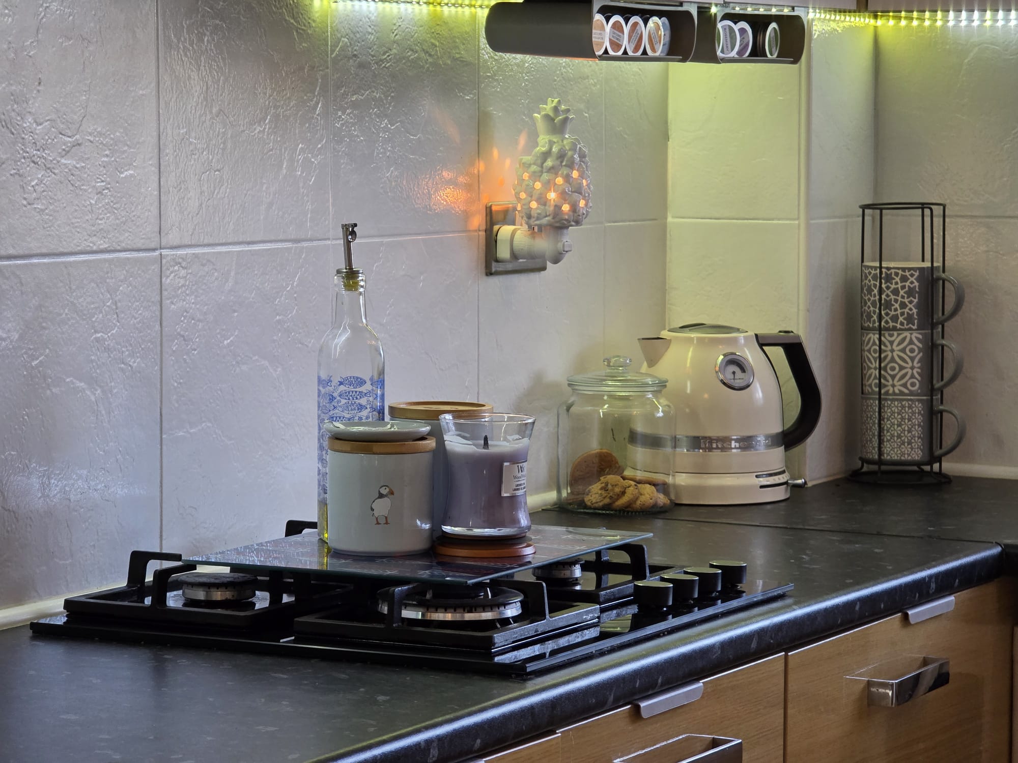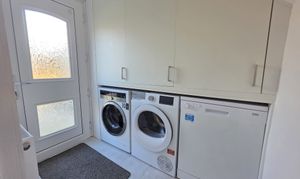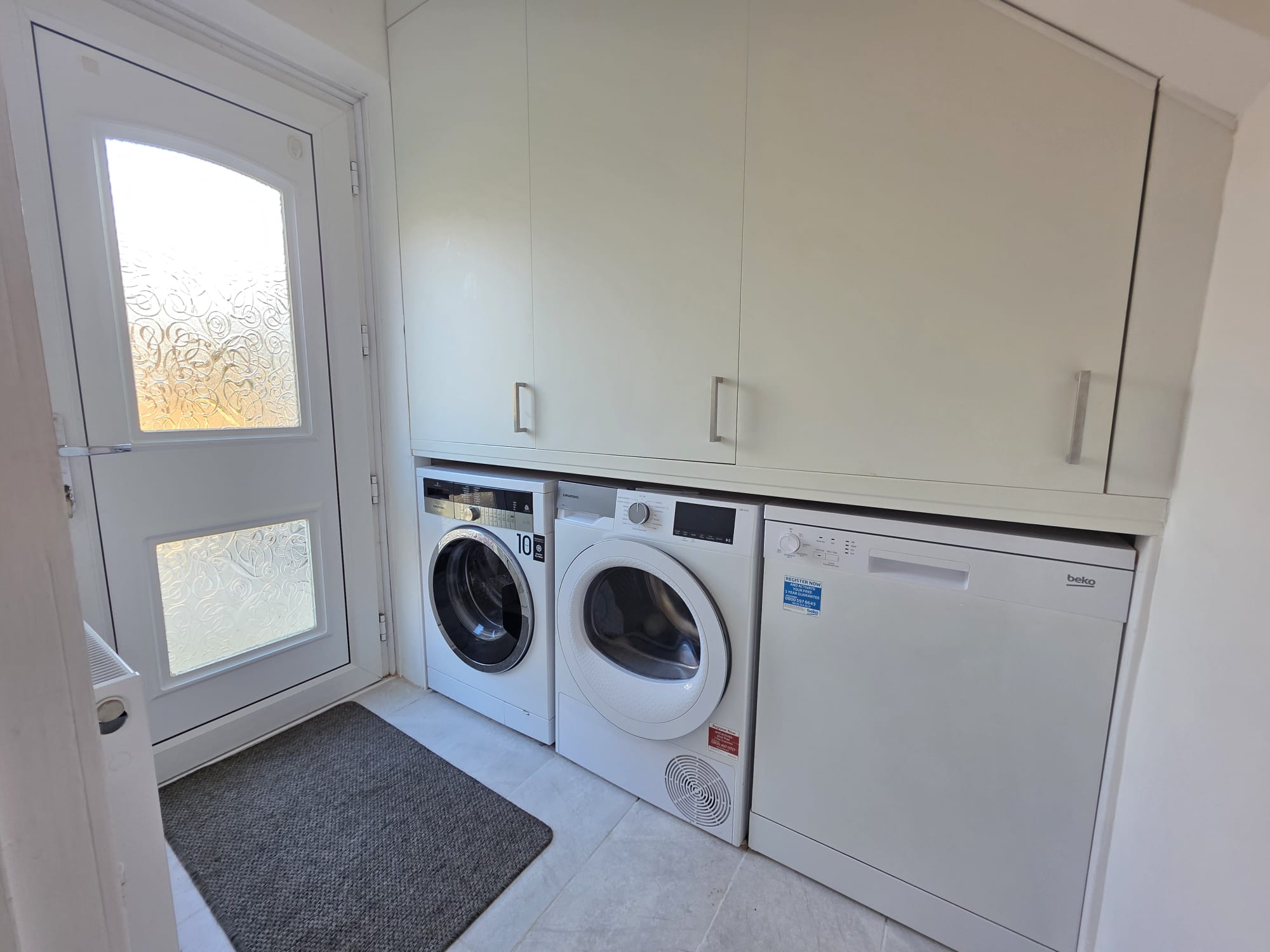 This clever use of space includes areas for washing machine, tumble dryer and dishwasher, alongside pull-out storage solutions, tiled flooring, radiator, and UPVC double glazed door out to the rear garden.