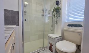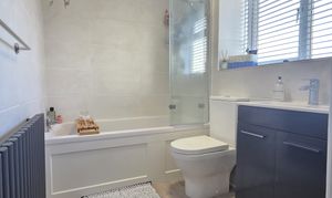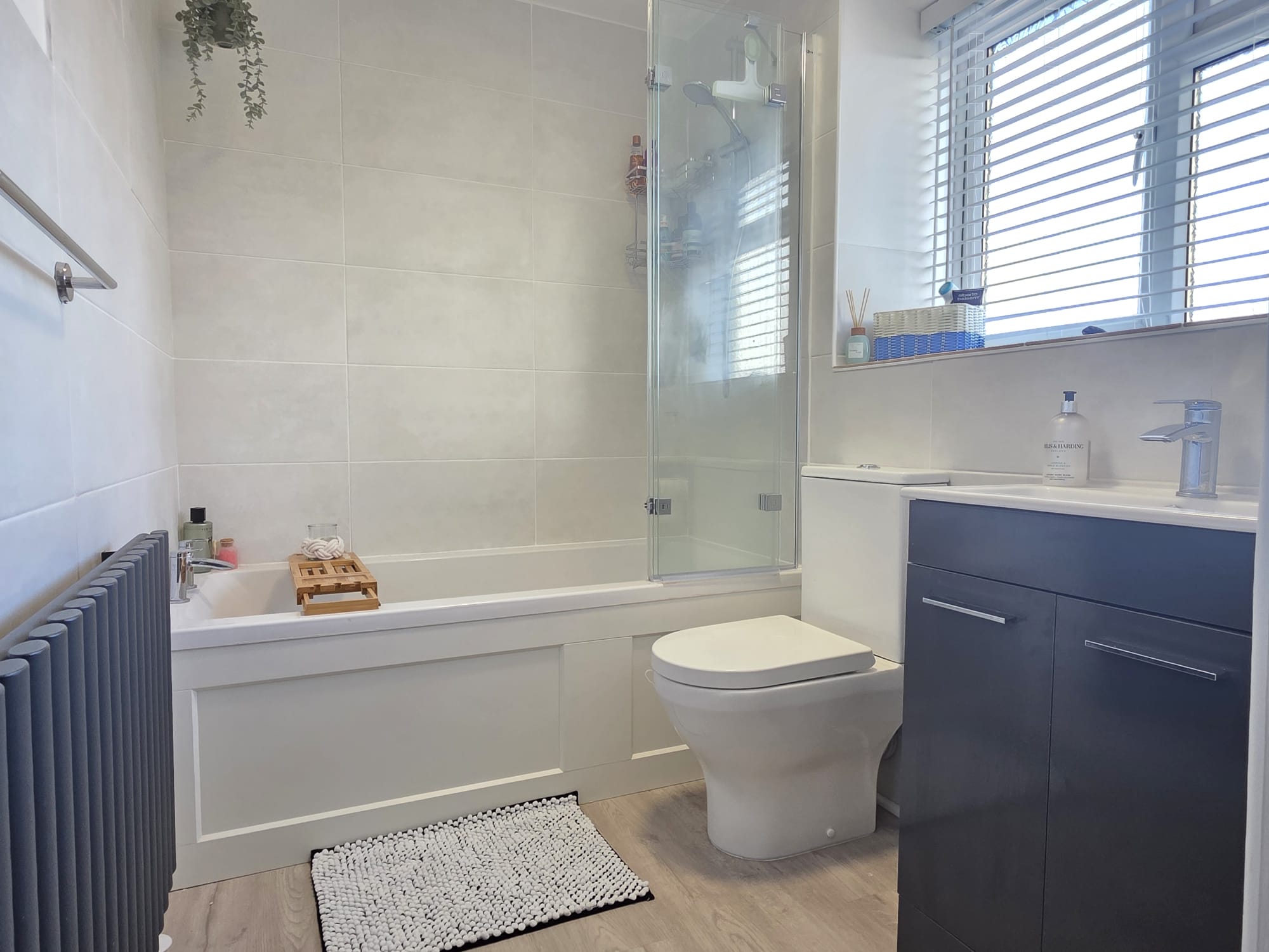 This beautifully modern bathroom comprises of low level flush WC, vanity unit with integrated ceramic sink and mixer tap, panel bath with shower over, matte grey radiator, tiled walls, laminate flooring and obscure UPVC double glazed window.