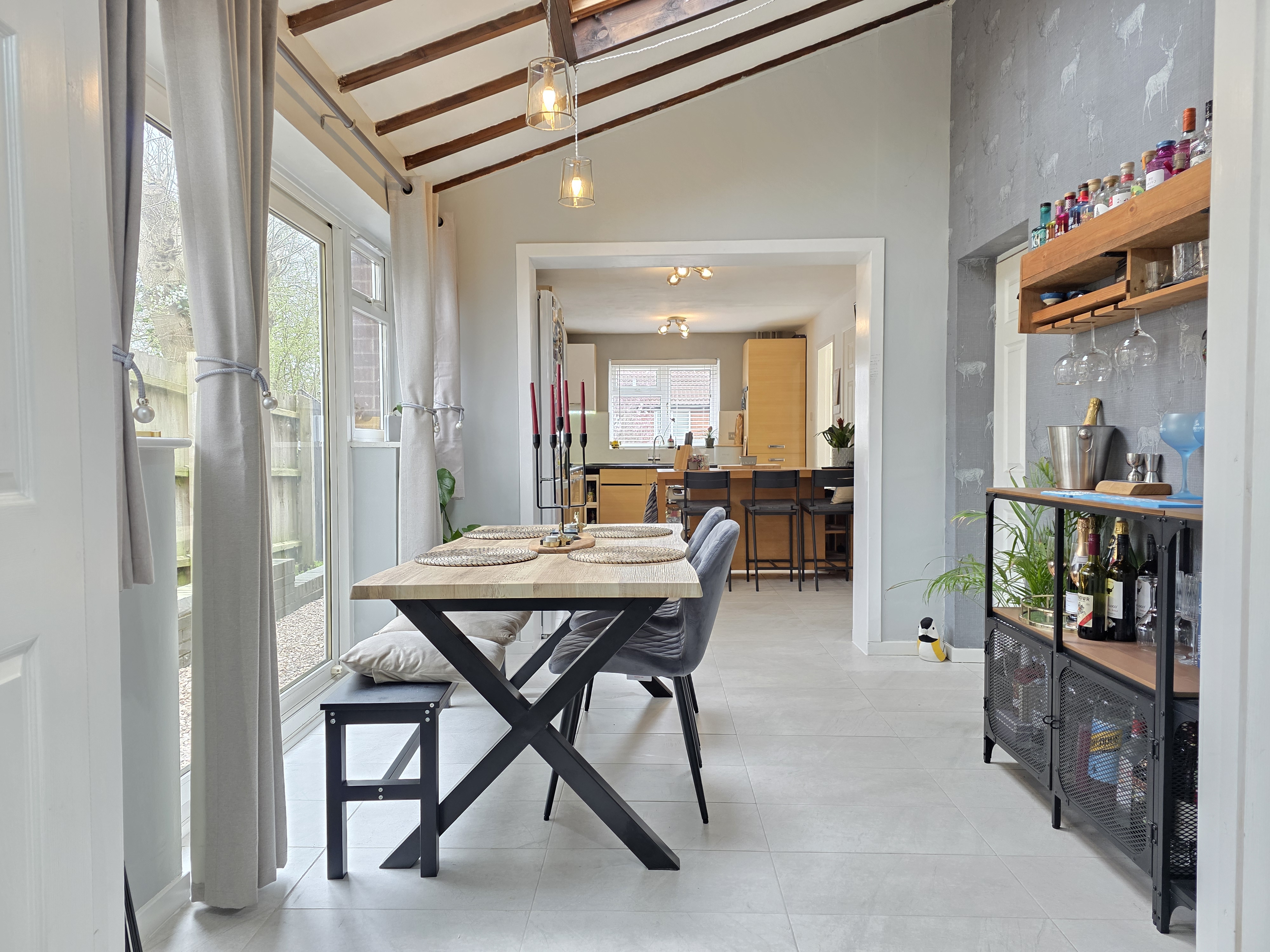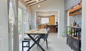 The dining room forming part of the open plan living area includes tiled flooring, vaulted ceiling, Velux roof window, UPVC double glazed windows and double doors out.