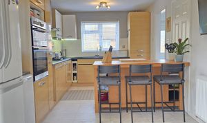 The kitchen offers a number of wall and base units with gloss finished doors, rollover worktop, sink and drainer unit with mixer tap, gas hob, extractor hood, integrated oven and grill, space for an upright fridge/freezer unit, tiled flooring, tiled splashbacks, radiator, access into the utility room and UPVC double glazed window.