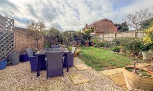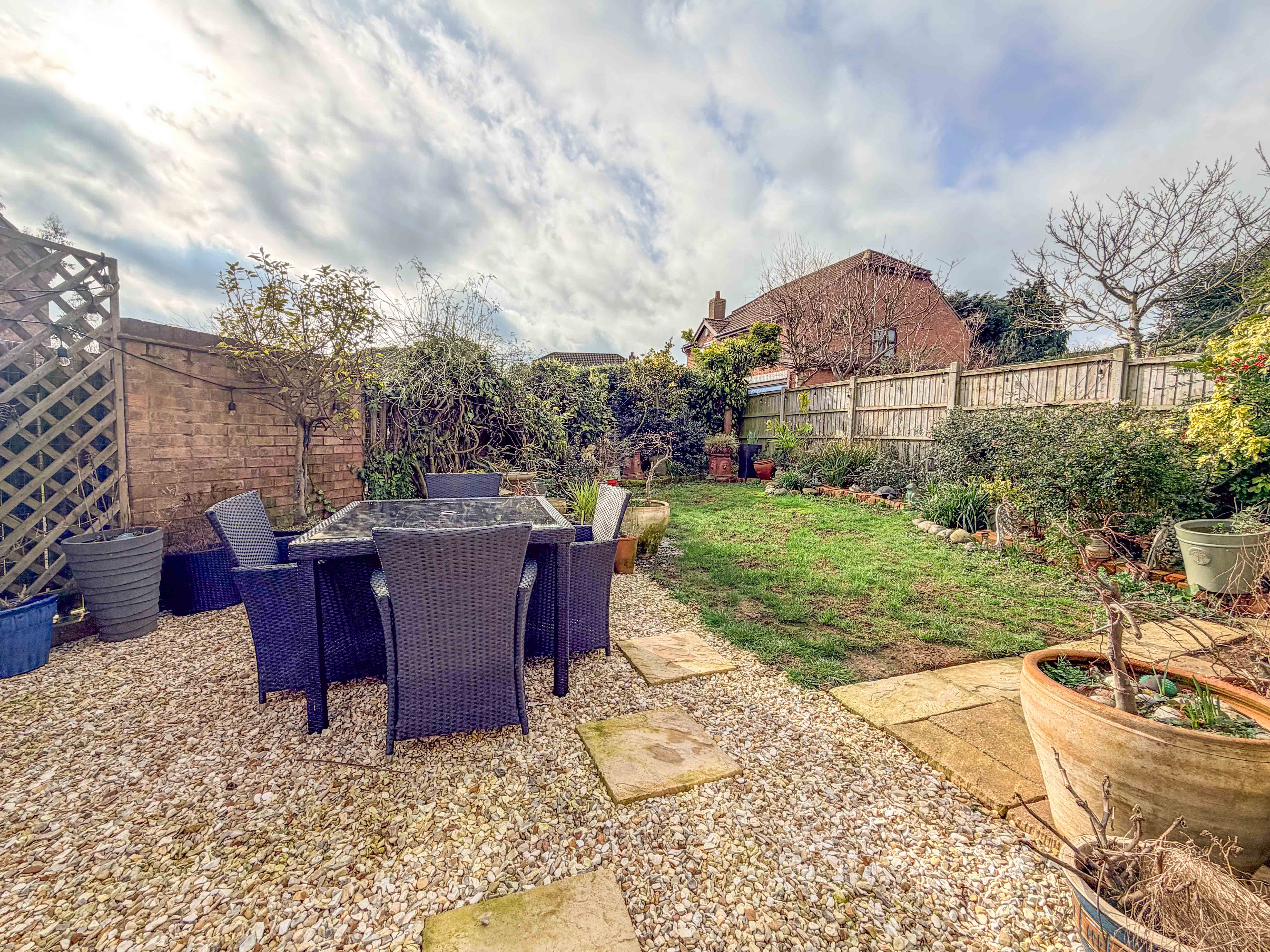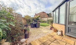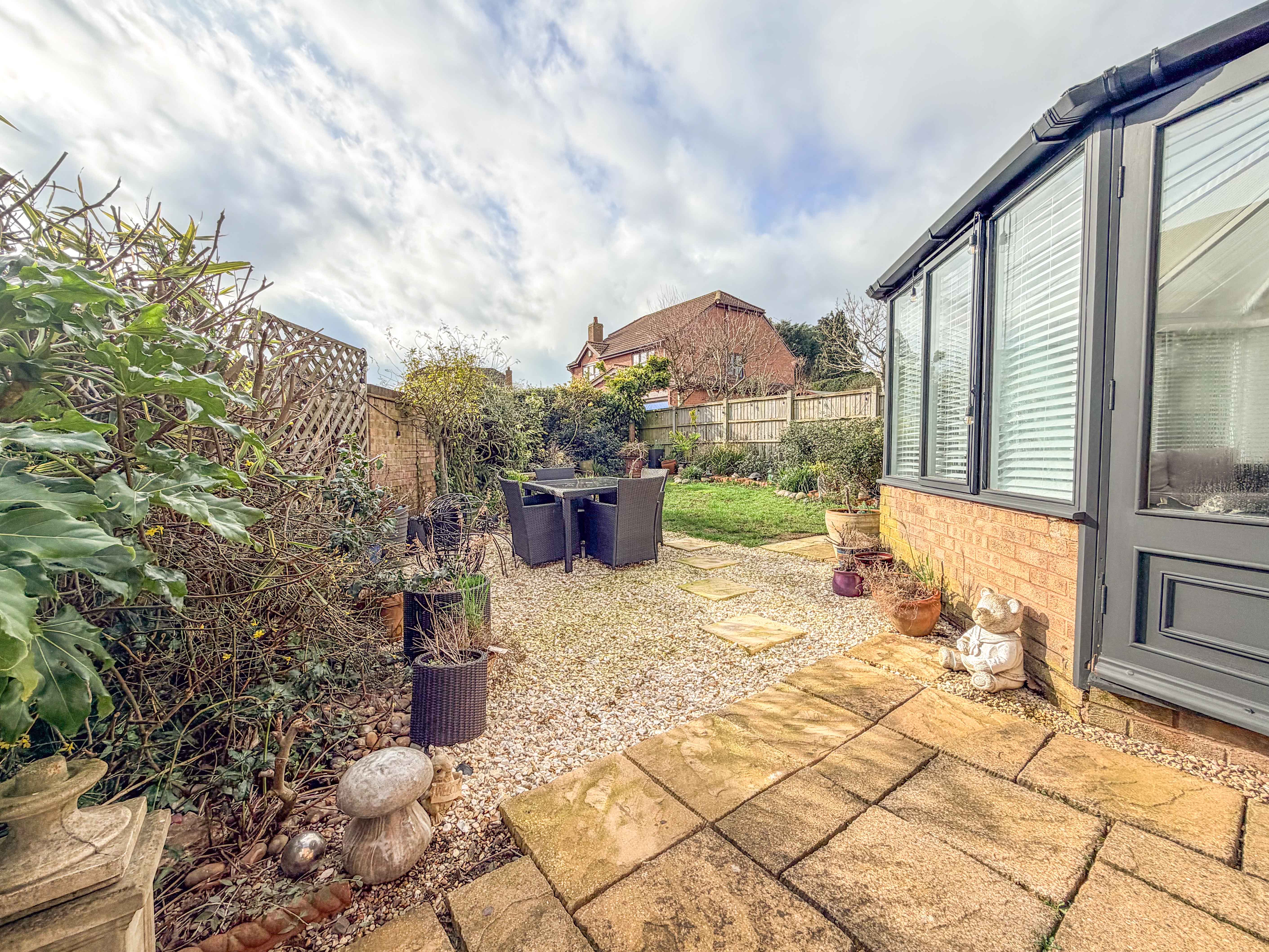 Outside, the rear garden has been thoughtfully arranged to create a private and inviting outdoor haven. A paved patio offers the perfect setting for al fresco dining and summer entertaining, leading onto a well-maintained lawn framed by mature planting that enhances both privacy and visual appeal. The corner plot position further adds to the sense of space and seclusion.