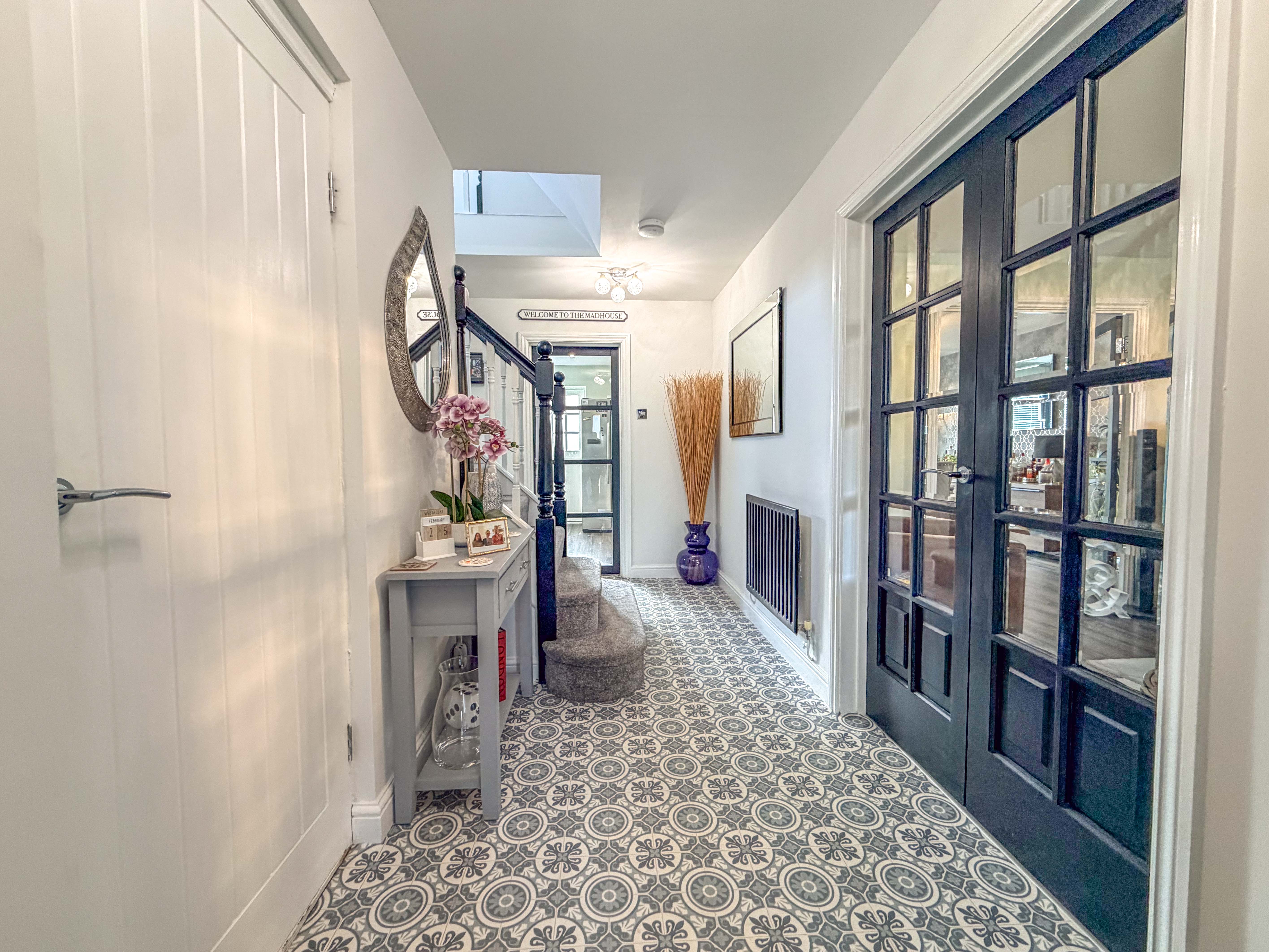Step inside and you are welcomed by a bright and spacious through hallway — a central spine to the home — with stairs rising to the first floor and access to a ground floor shower room, ideal for guests or busy family life.