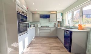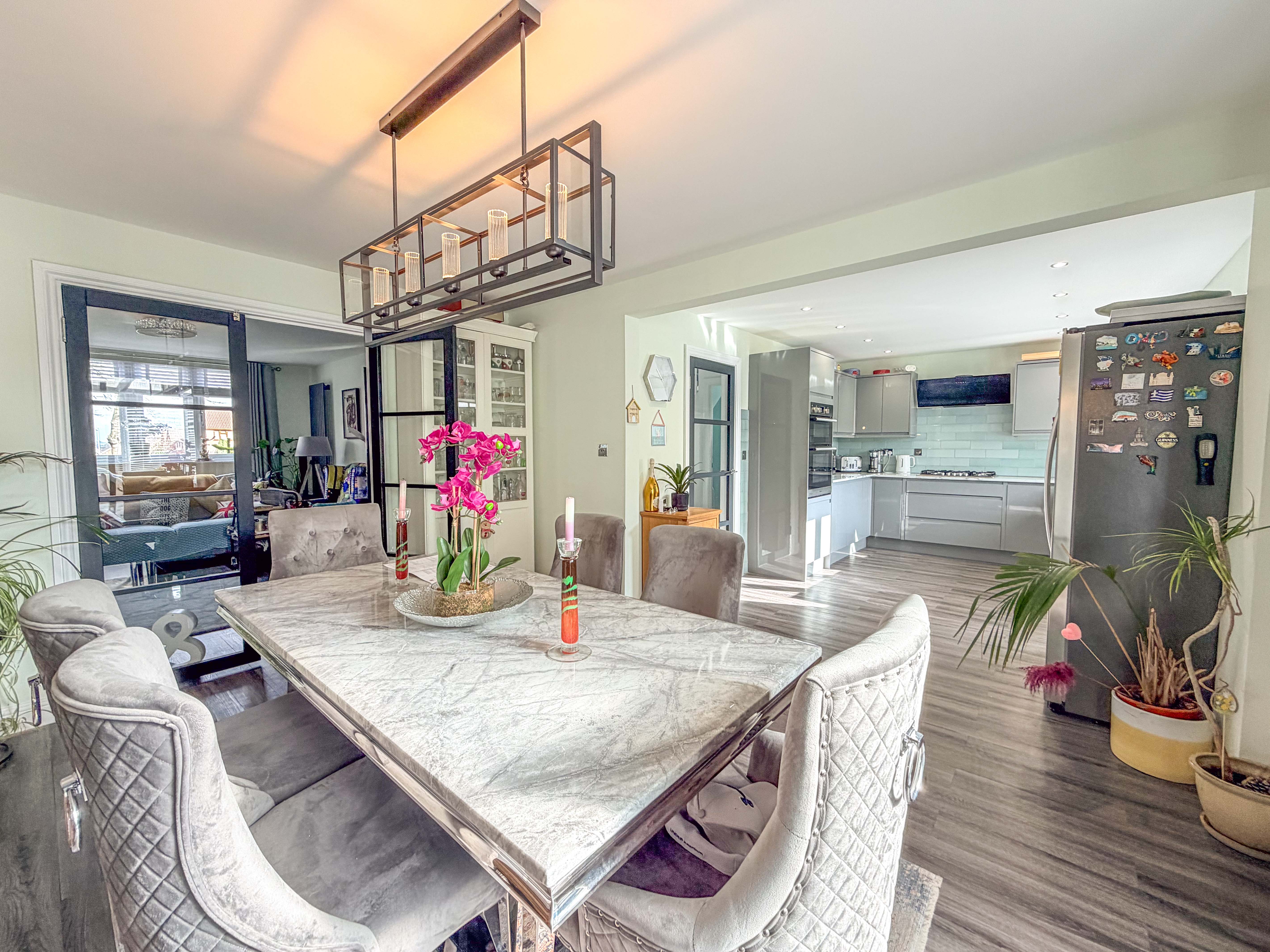 Undoubtedly the heart of this home is the stunning open plan kitchen/diner — a true showpiece designed for modern family living. Fitted with an impressive range of contemporary units, generous work surfaces and ample storage, this space is both practical and visually striking. There is plenty of room for a large dining table, making it ideal for everything from casual breakfasts to festive gatherings. Flowing seamlessly from here is the conservatory, enhancing the sense of openness and flooding the space with light — a superb extension of the living area and a wonderful spot to entertain during the warmer months.