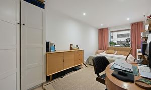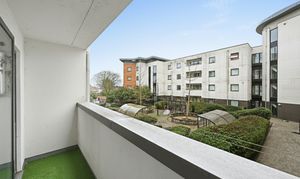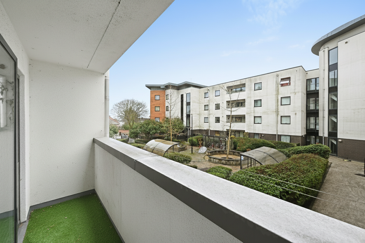 The bright and spacious living area is filled with natural light and opens through a large sliding door onto a private balcony. Whether you’re enjoying a quiet morning coffee, unwinding after work, or entertaining friends, this versatile space effortlessly adapts to your lifestyle. The modern open-plan kitchen, finished with sleek white cabinetry and generous worktop space, integrates seamlessly with the living area, making everyday living and social occasions equally enjoyable.