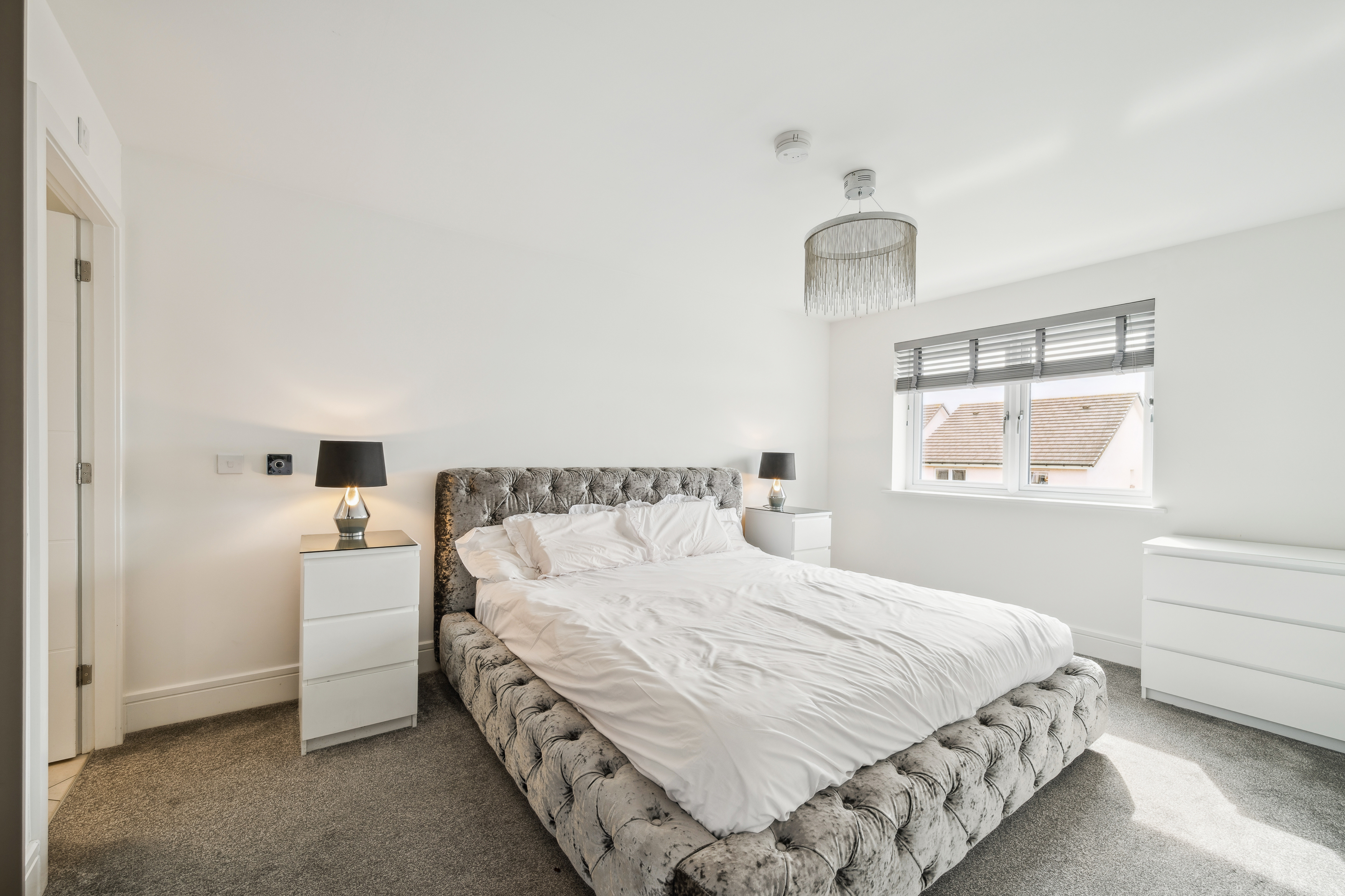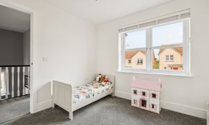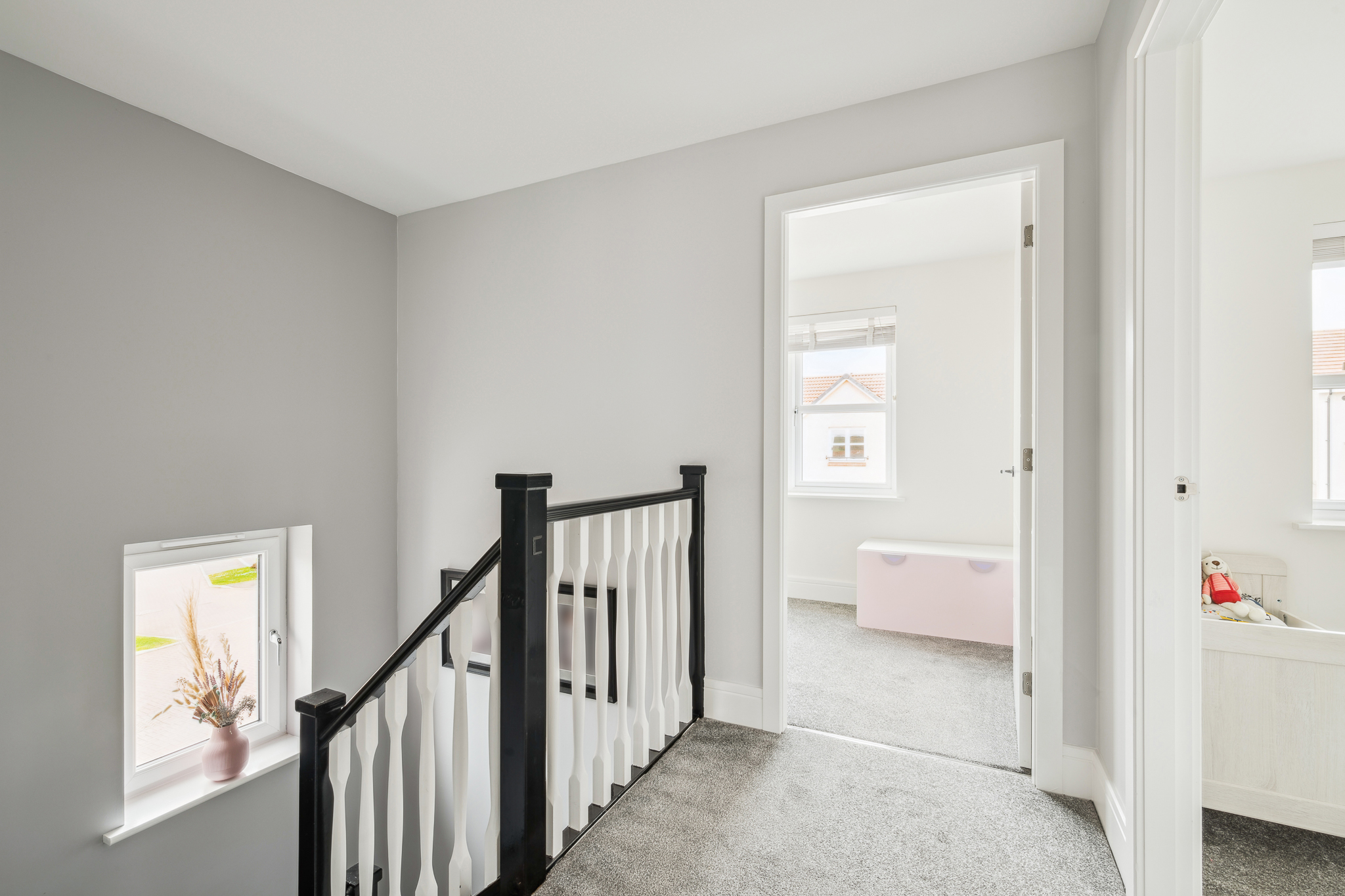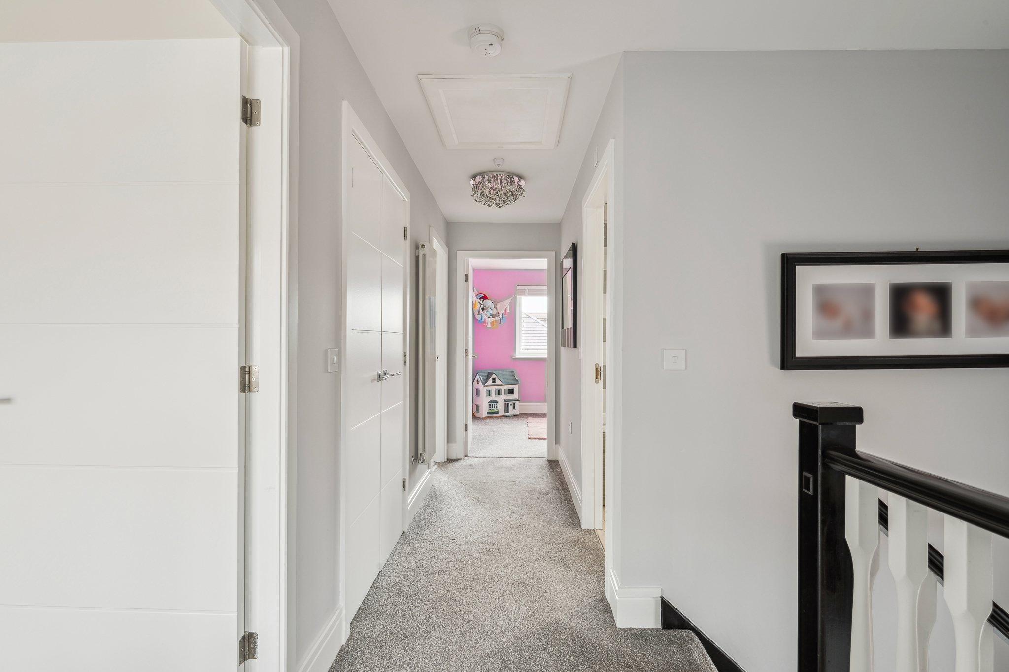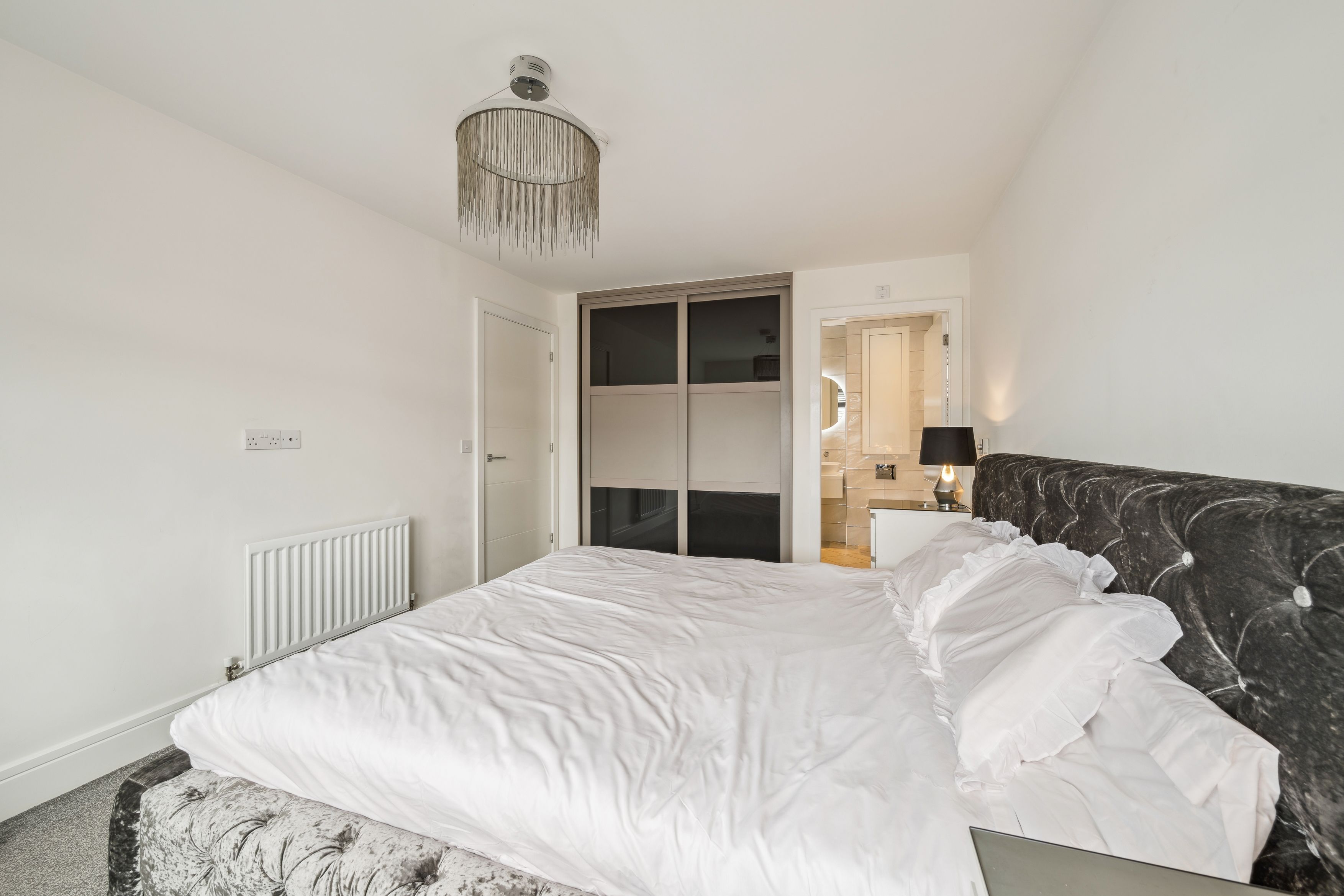 Upstairs, the home continues to impress with four double bedrooms, offering flexible living space for the whole family. The principal bedroom features a modern en-suite shower room, complete with a rainfall shower, floating vanity unit with integrated storage, and a chrome towel rail.
