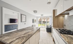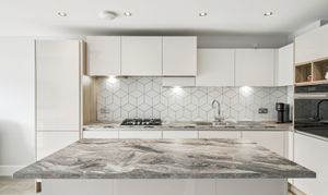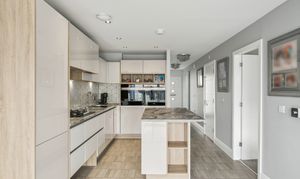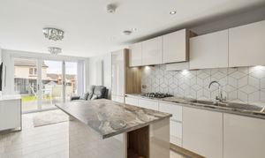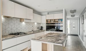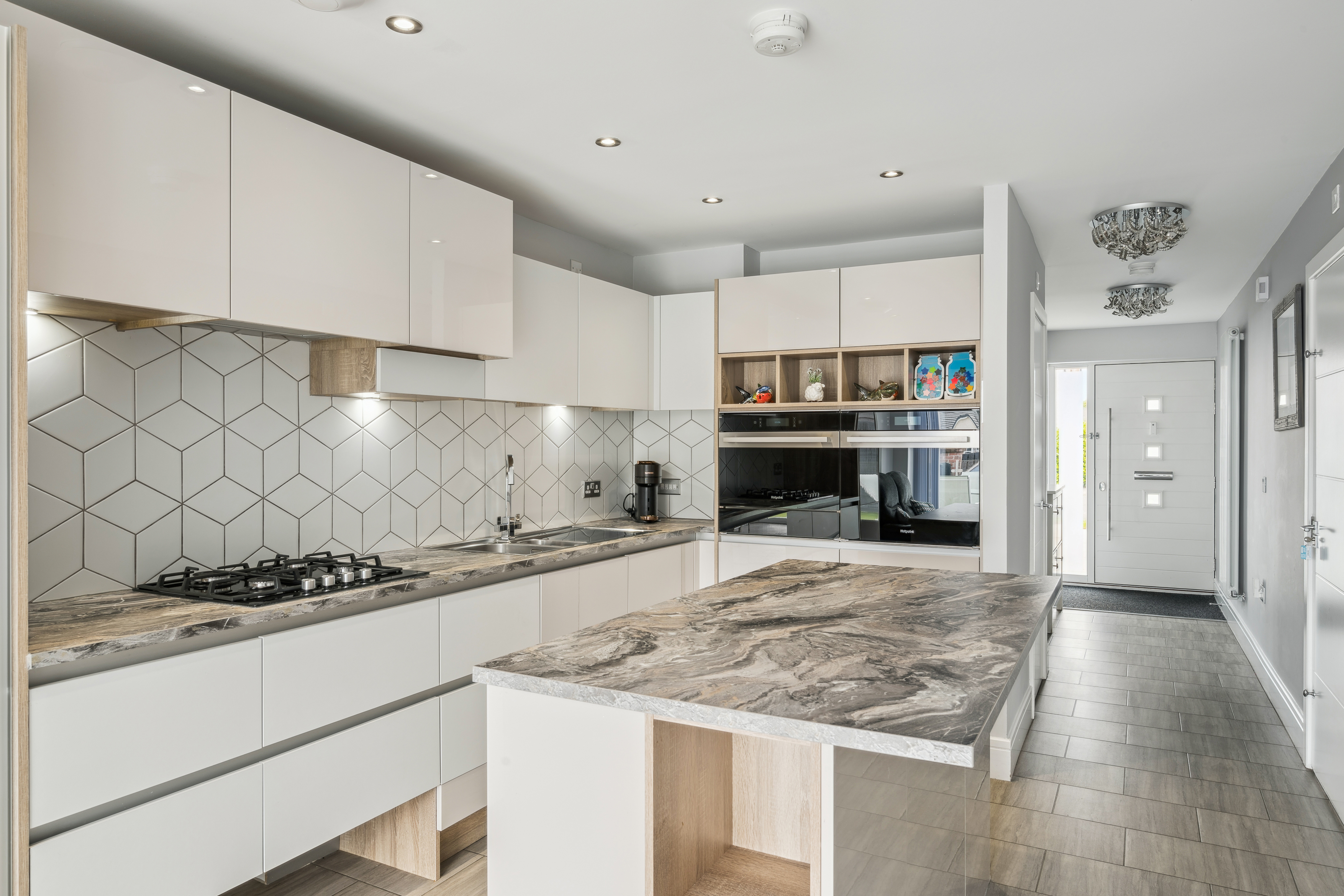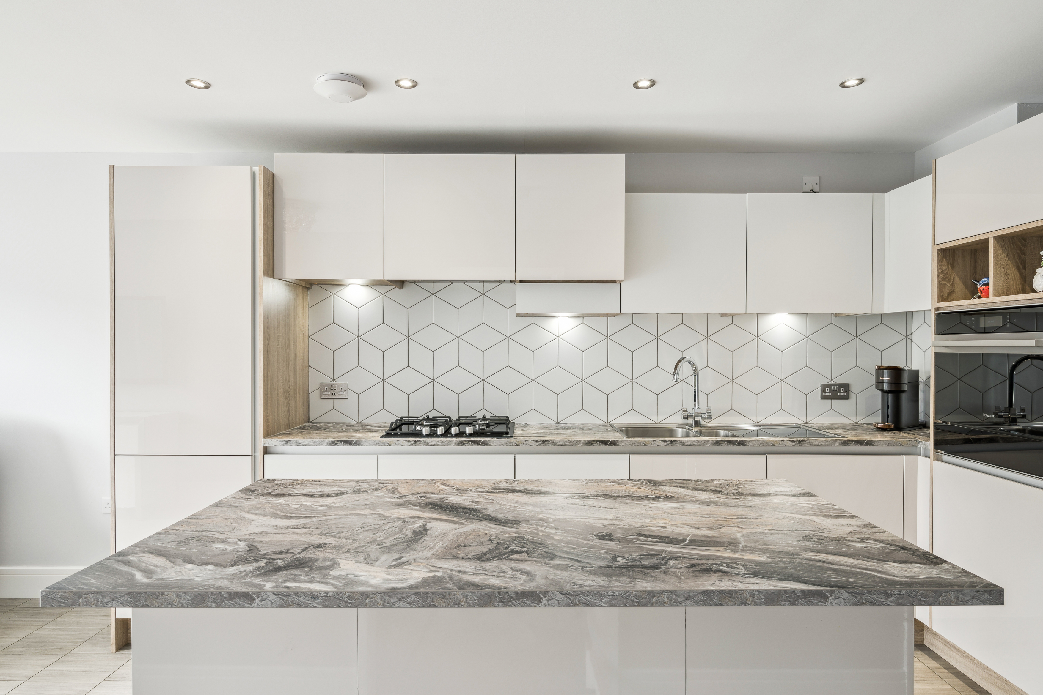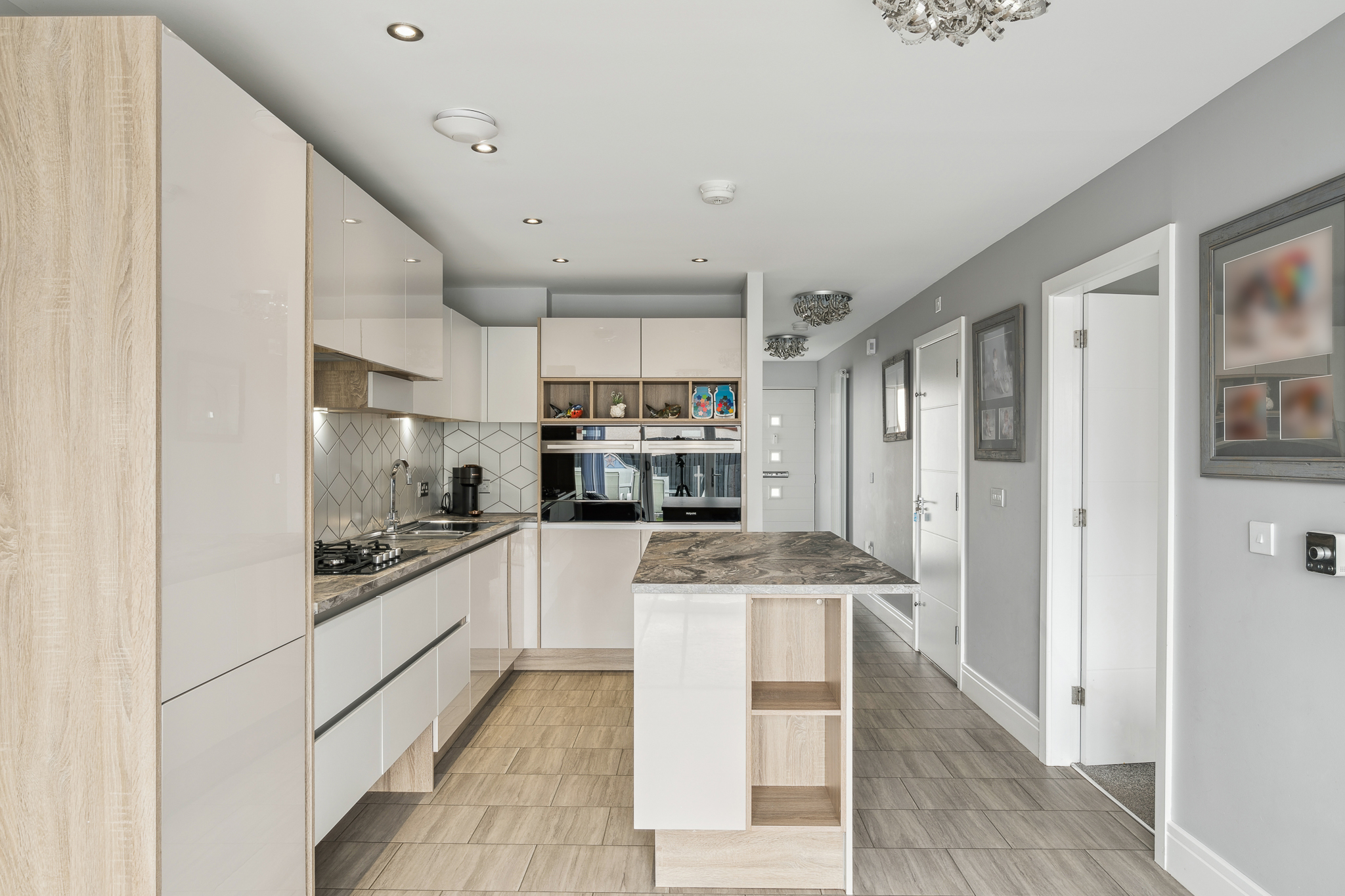 The kitchen is designed with sleek, contemporary units and comes fully equipped with integrated appliances including an oven, hob, fridge/freezer, dishwasher, and washing machine. A stylish breakfasting island adds both practicality and a touch of elegance to the space.