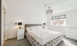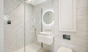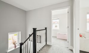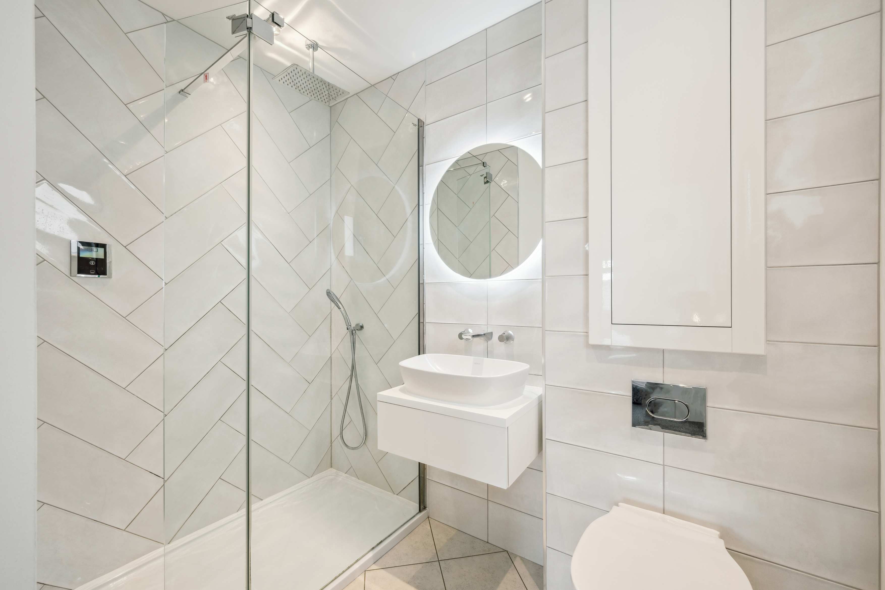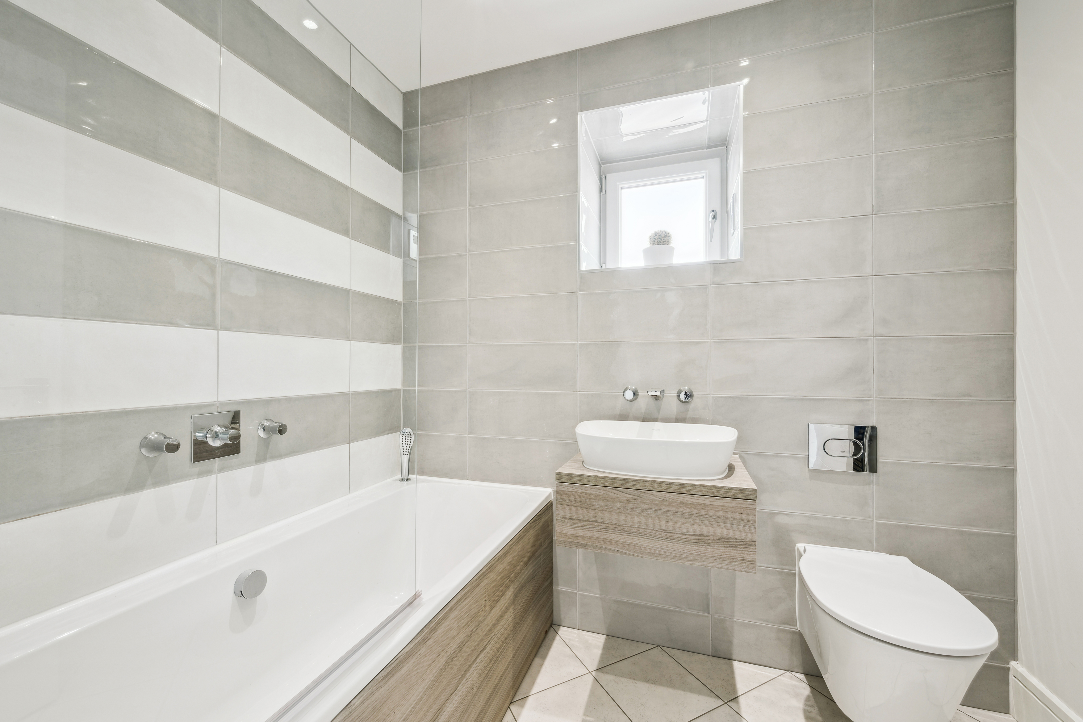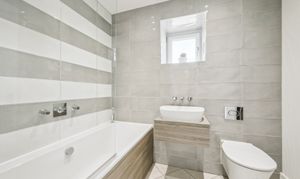 The family bathroom exudes modern elegance, featuring a high-quality, contemporary three-piece suite with a sleek shower over the bath. Fully tiled giving a premium finishes, the space is both stylish and serene, offering a spa-like atmosphere perfect for unwinding at the end of the day.
