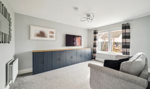 At the heart of the home lies a stunning open-plan kitchen and dining area, currently styled as a secondary living space. This expansive room easily accommodates a dining table and enjoys direct access to the southwest-facing garden through bi-fold doors, making it perfect for everyday living and entertaining alike.