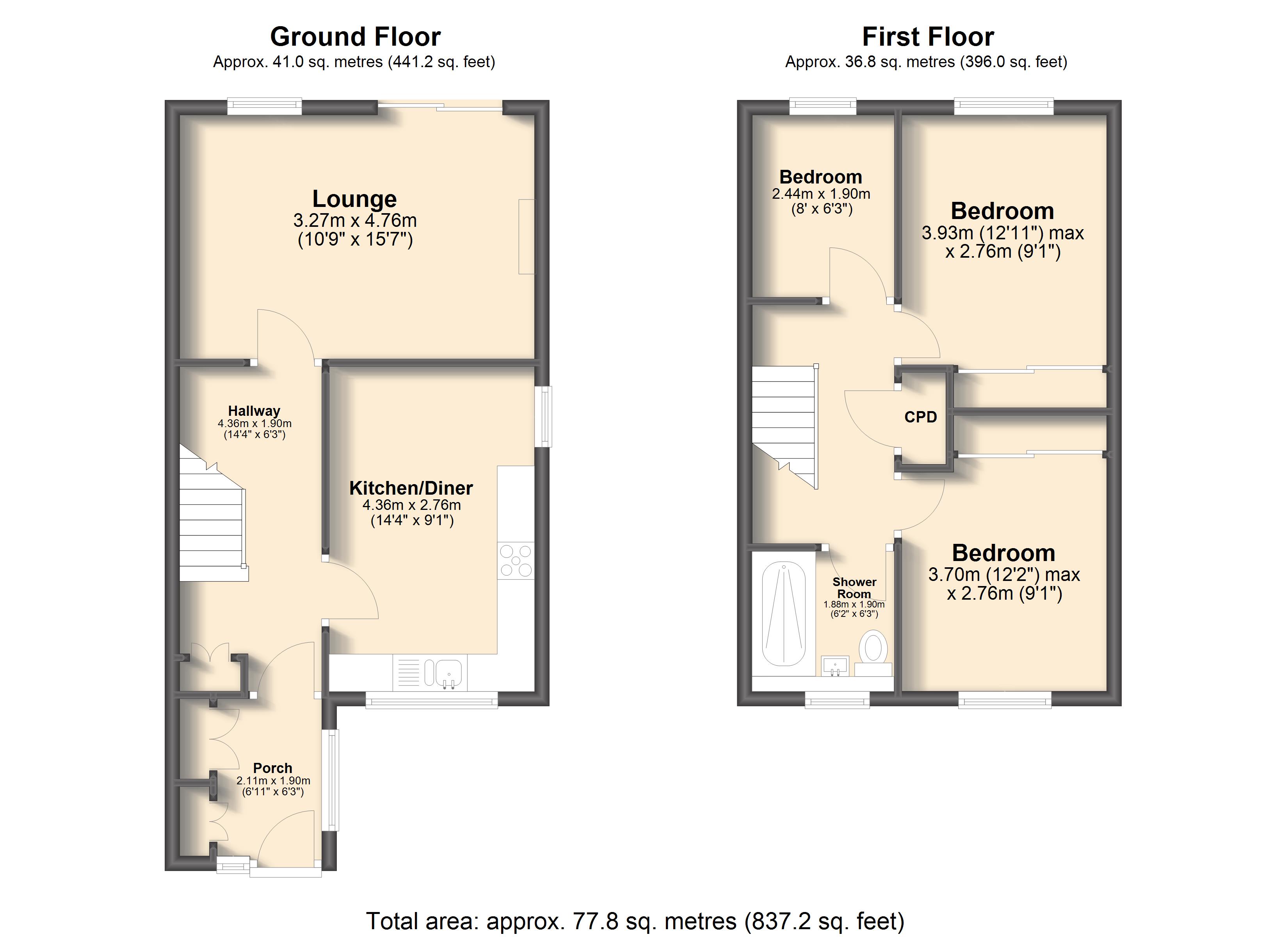 Upstairs, you will find two well-proportioned double bedrooms, both benefitting from fitted wardrobes for convenient storage, alongside a versatile single bedroom ideal as a nursery, study, or guest room. The stylish, fully tiled shower room is fitted with a contemporary three-piece suite, offering a fresh and functional space for daily routines.