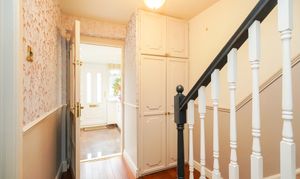 Additional storage is available on the landing, ensuring the home remains clutter-free and well-organised. The property’s practical layout is complemented by a mature landscaped garden and driveway that can accommodate two vehicles.