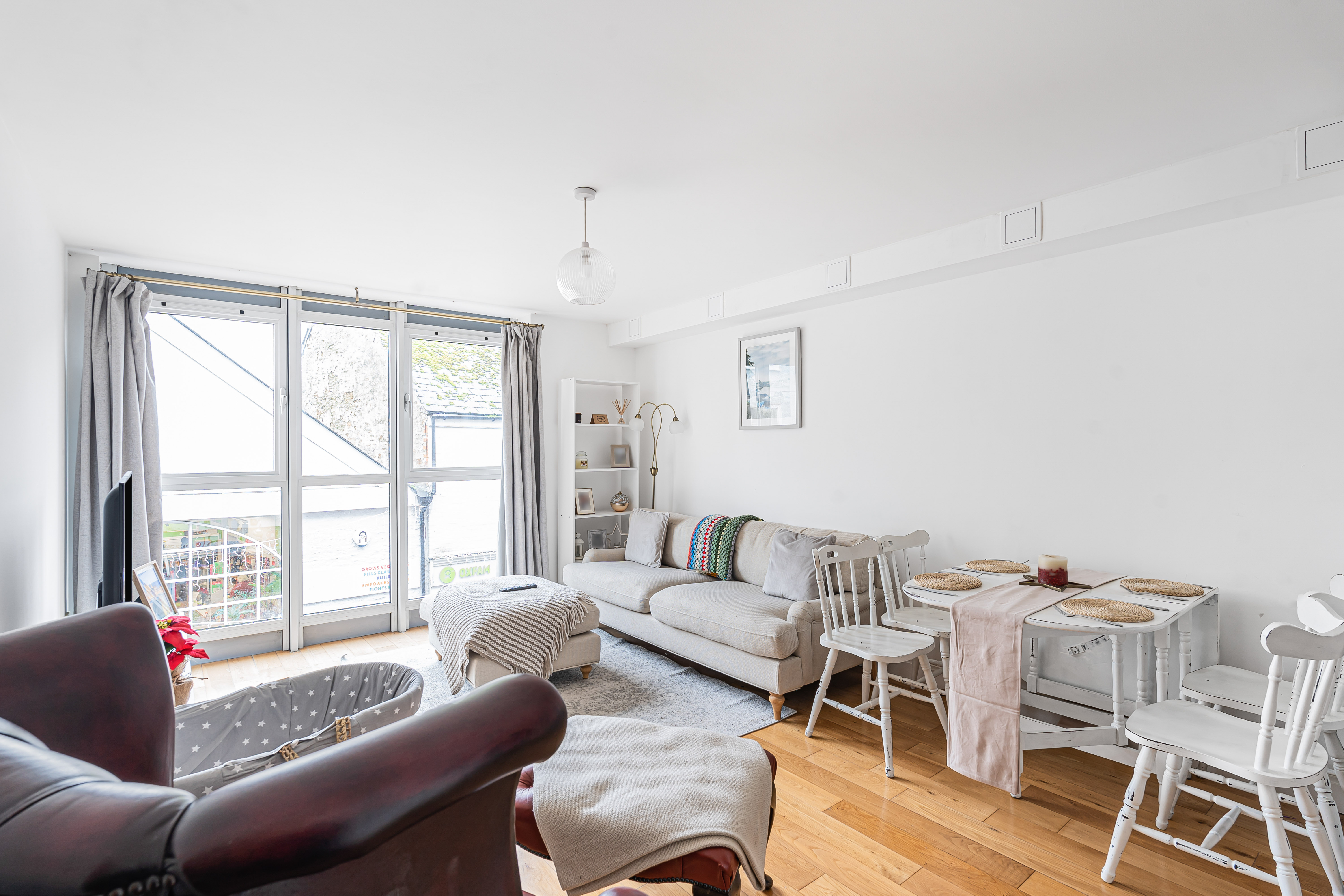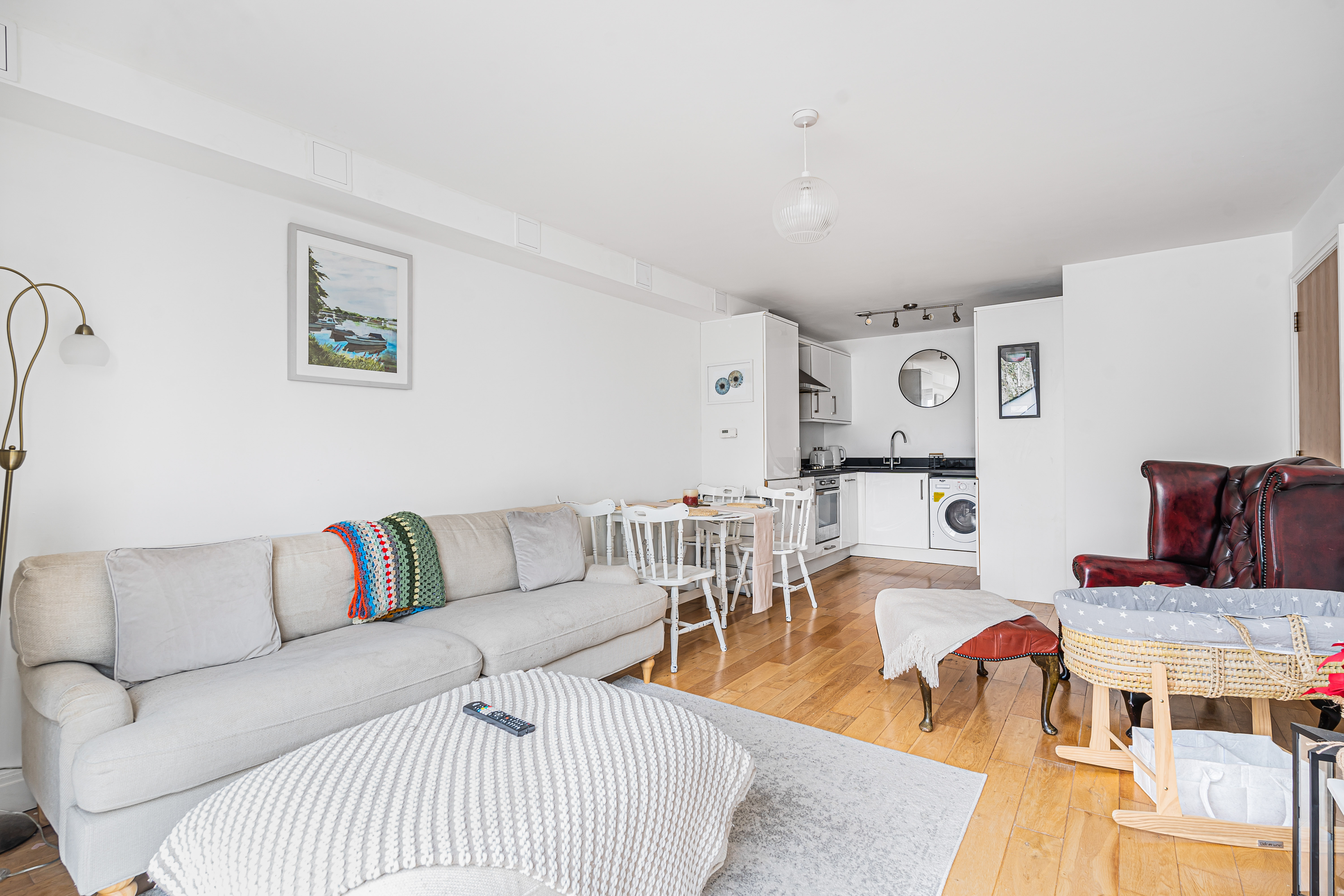 You have a lovely open plan living space, with full length window to the front, wooden floors. With space for dining table and lounge furniture.