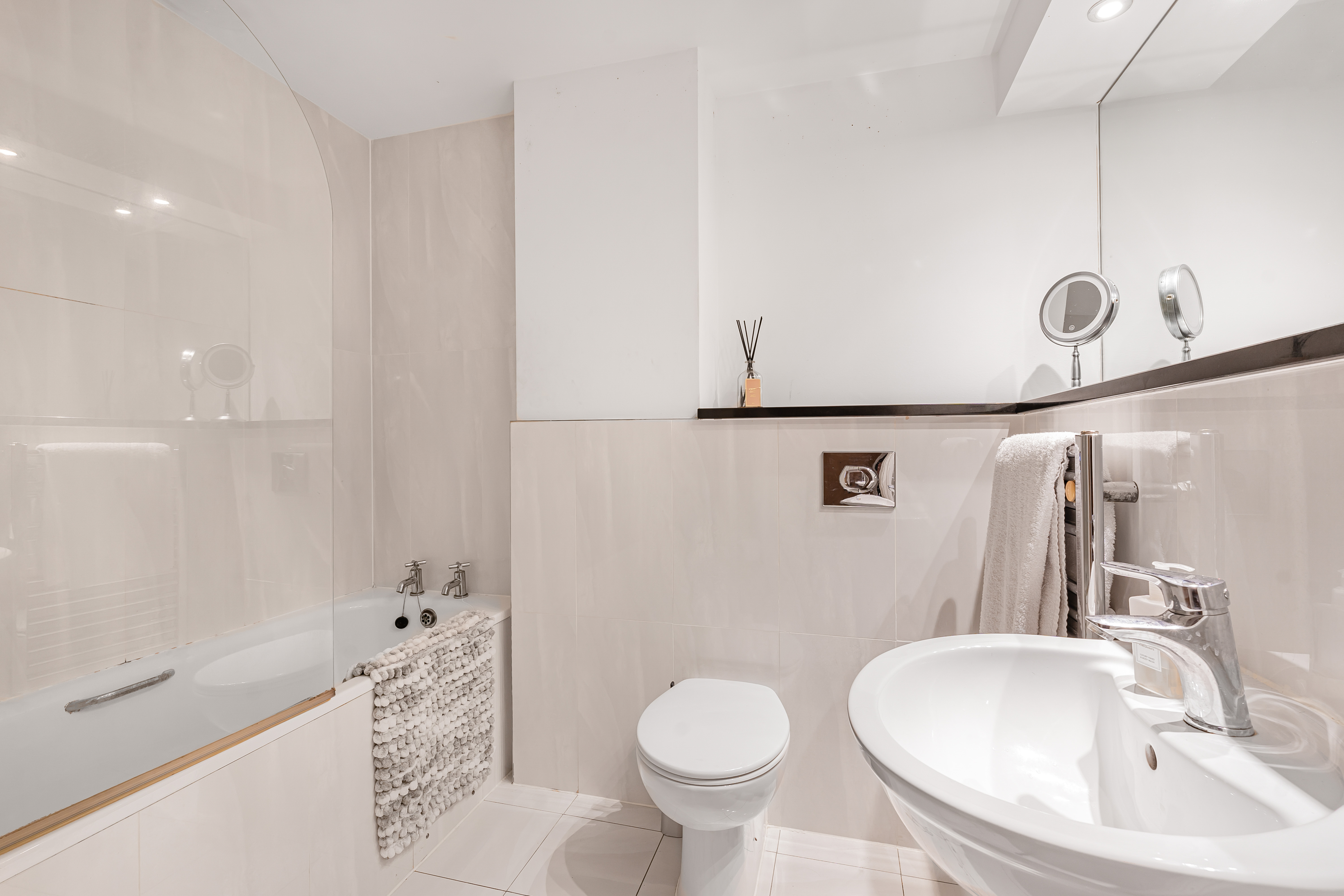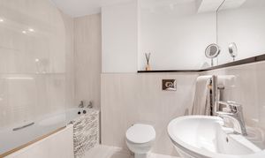 The bathroom is fully tiled, fitted with a modern bath suite comprising of bath with shower over, low level wc with concealed cistern. Wash hand basin with hot and cold mixer taps over. Wall mounted towel rail/heater.