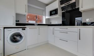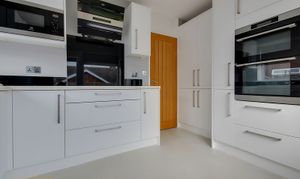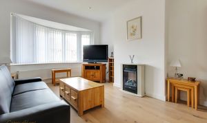 Designed for relaxed living, the home features a spacious sitting room and a contemporary, fully fitted kitchen equipped with quality AEG appliances. A door from the kitchen opens directly onto a sunny, south-facing garden, perfect for seamless indoor-outdoor living.