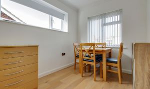 The property comprises two bedrooms: the main bedroom includes wardrobes, while the second offers versatility as a guest room, home office, or study.