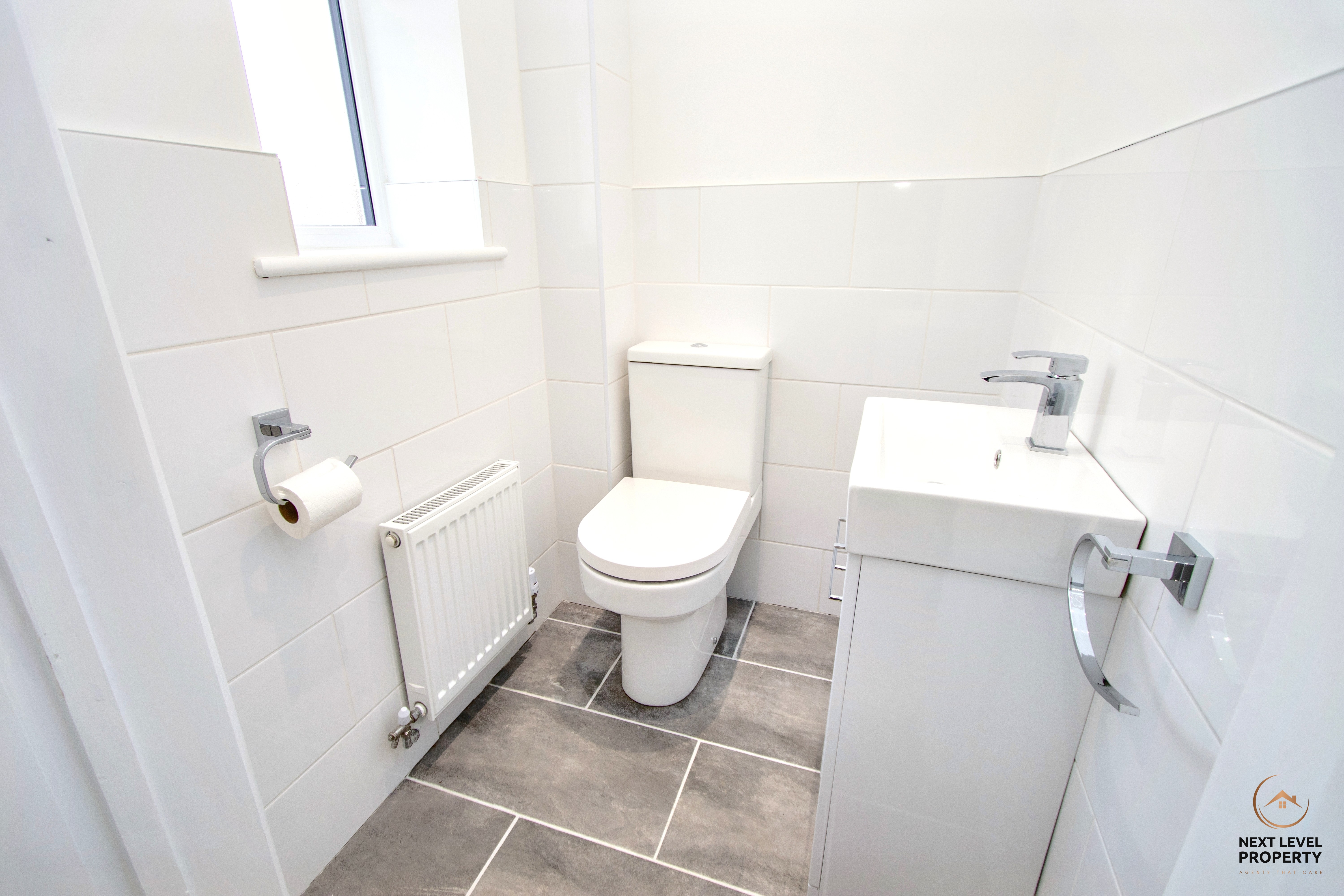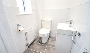 Conveniently located on the ground floor, this smart and neatly presented cloakroom features a modern close-coupled WC and a hand basin set within a vanity unit offering practical storage. The room is finished with a tiled floor and half-height tiled walls for a clean, contemporary feel, while a UPVC double glazed window to the front provides natural light and an extractor fan ensures good ventilation.