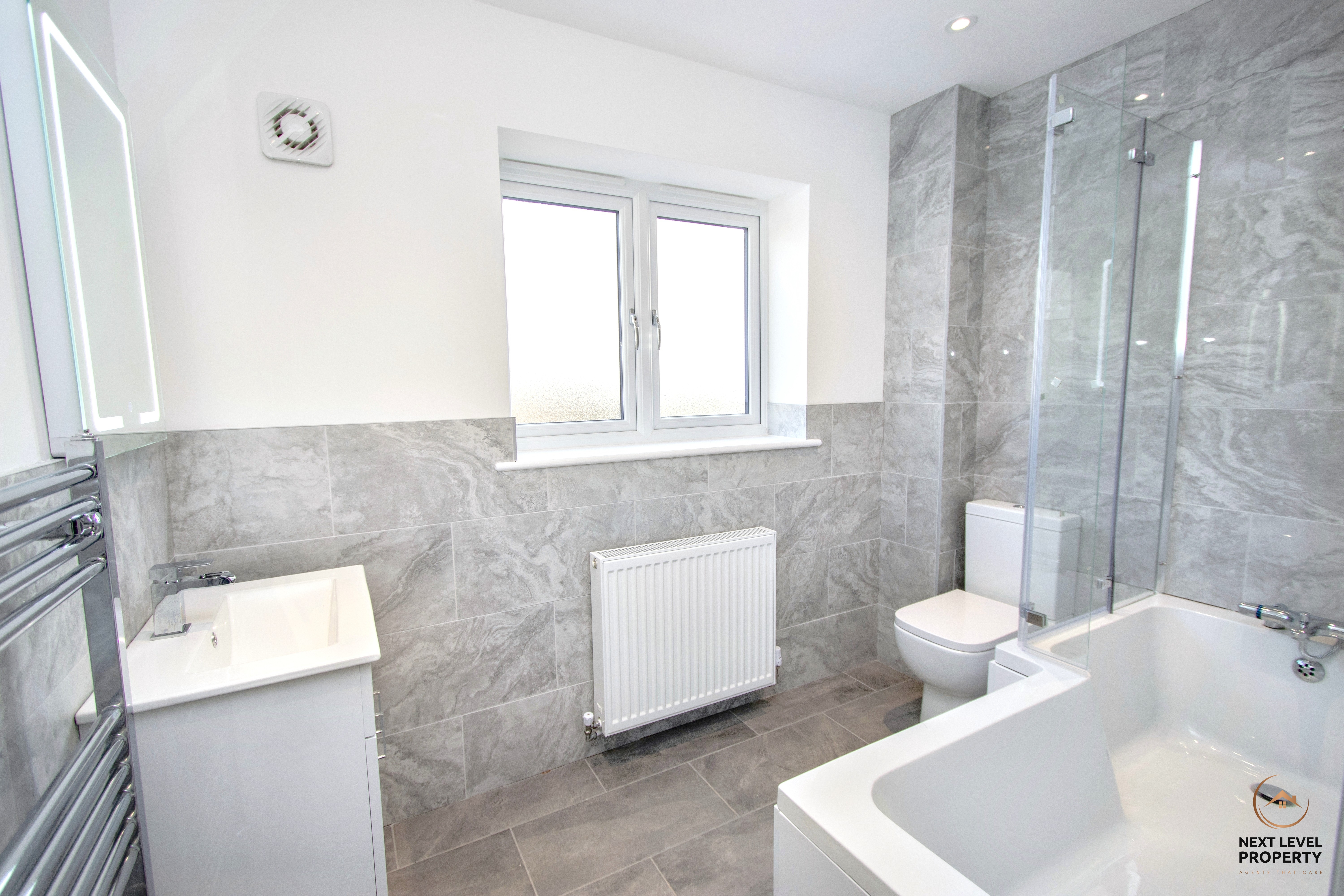 Stylish, fresh and finished to a high standard, the family bathroom has been designed with both comfort and practicality in mind. A modern white suite includes a P-shaped bath with tap-fed shower over and a sleek glass screen, alongside a close-coupled WC and hand basin set within a vanity unit providing useful built-in storage. The room is beautifully presented with a tiled floor, full tiling to two walls and half tiling to the remaining walls for a clean, contemporary look. There is a radiator and heated towel rail for added comfort, a UPVC double glazed window to the front for natural light, and a mist-free illuminated wall mirror completing the space with a smart modern touch.
