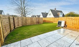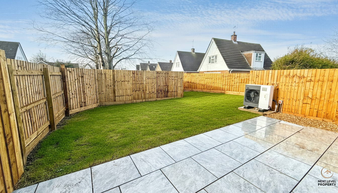 Externally, the rear garden will be laid to lawn (AI images illustrate the finish once complete) alongside a paved patio and external power points. The air source heat pump is neatly positioned outside.