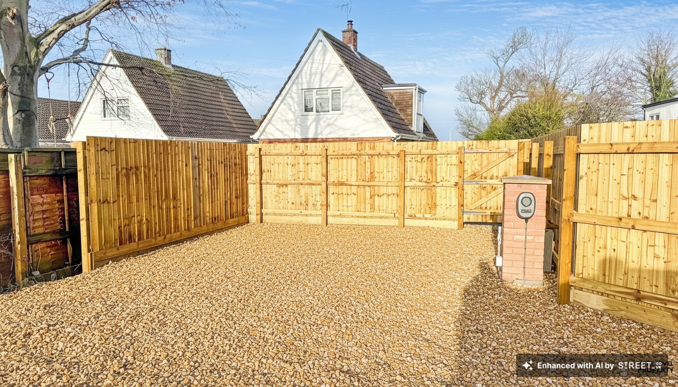 To the side of the property a gravelled driveway provides access through to the rear where there is a private parking area with space for at least two vehicles. A dedicated EV charging point is already installed, adding a practical and future-proof feature for modern living. Two gates lead directly into the rear garden for easy access. The rear garden will be laid to turf (the current images of the outside have been AI-assisted to show how the lawn, driveway and parking area will look once completed). There is also a paved patio area ideal for outdoor seating and entertaining, external power points, an outside tap and the air source heat pump unit neatly positioned to the exterior, and external lighting to both the front and rear of the property enhancing practicality and evening appeal.