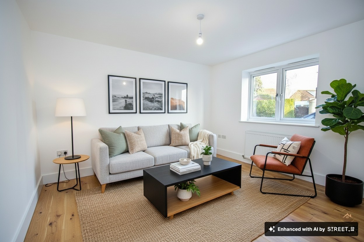 A comfortable and well-proportioned living space designed with modern lifestyles in mind. Pre-installed cabling for a wall-mounted TV, satellite connection and network points make this room fully entertainment-ready, keeping everything sleek and clutter free. The current image has been digitally dressed using AI to showcase layout possibilities, including flooring and furniture, helping buyers visualise how the space can look once furnished.