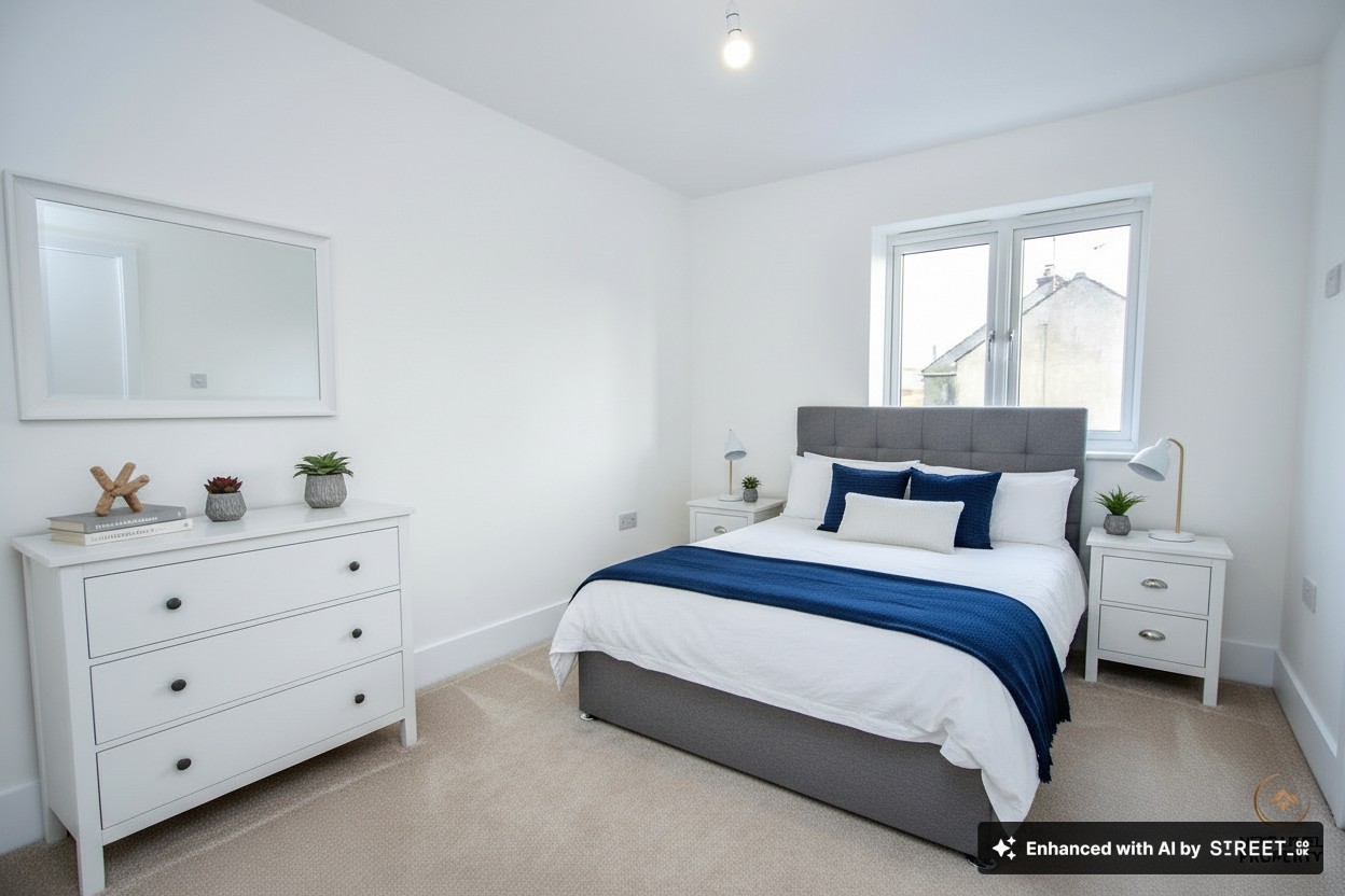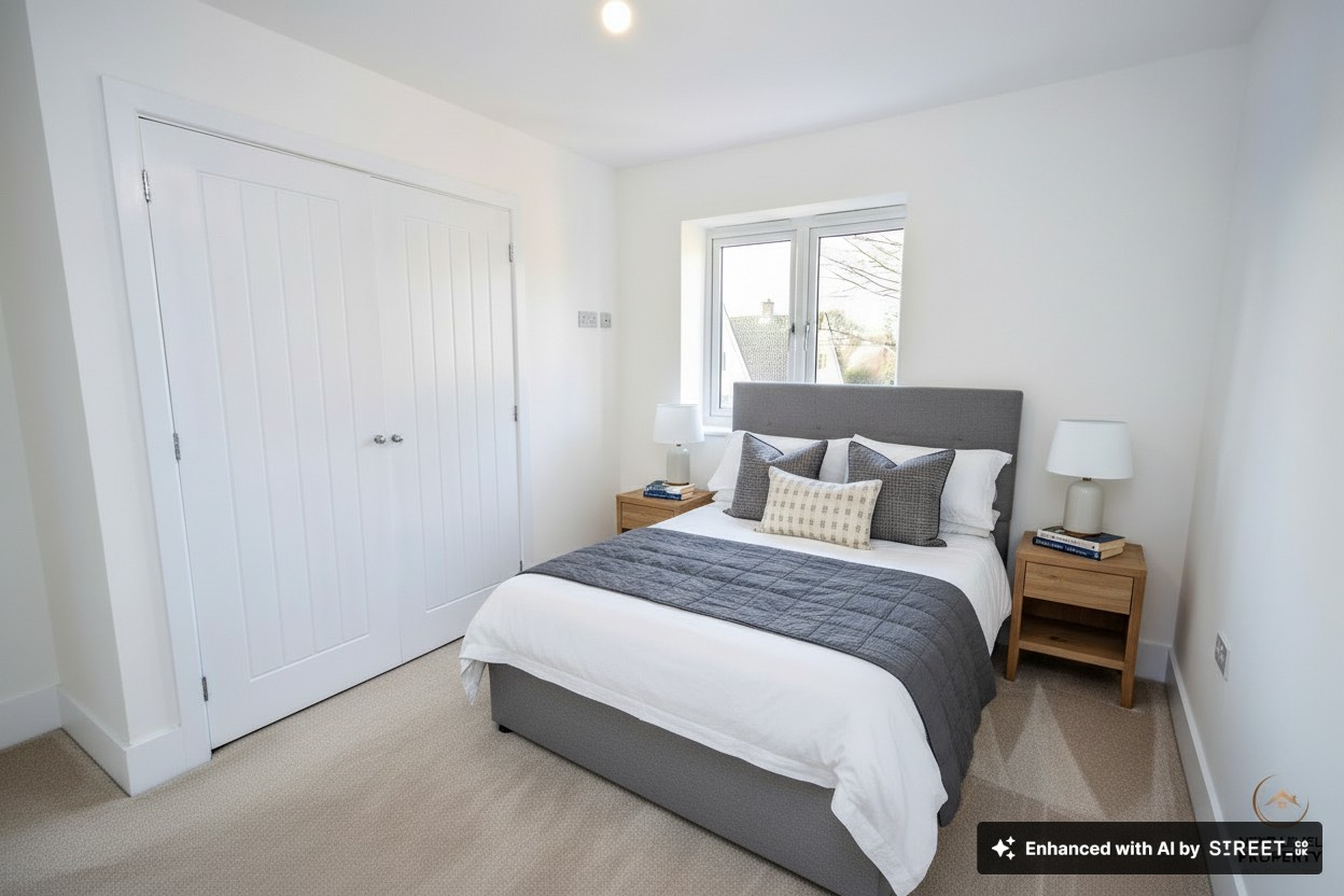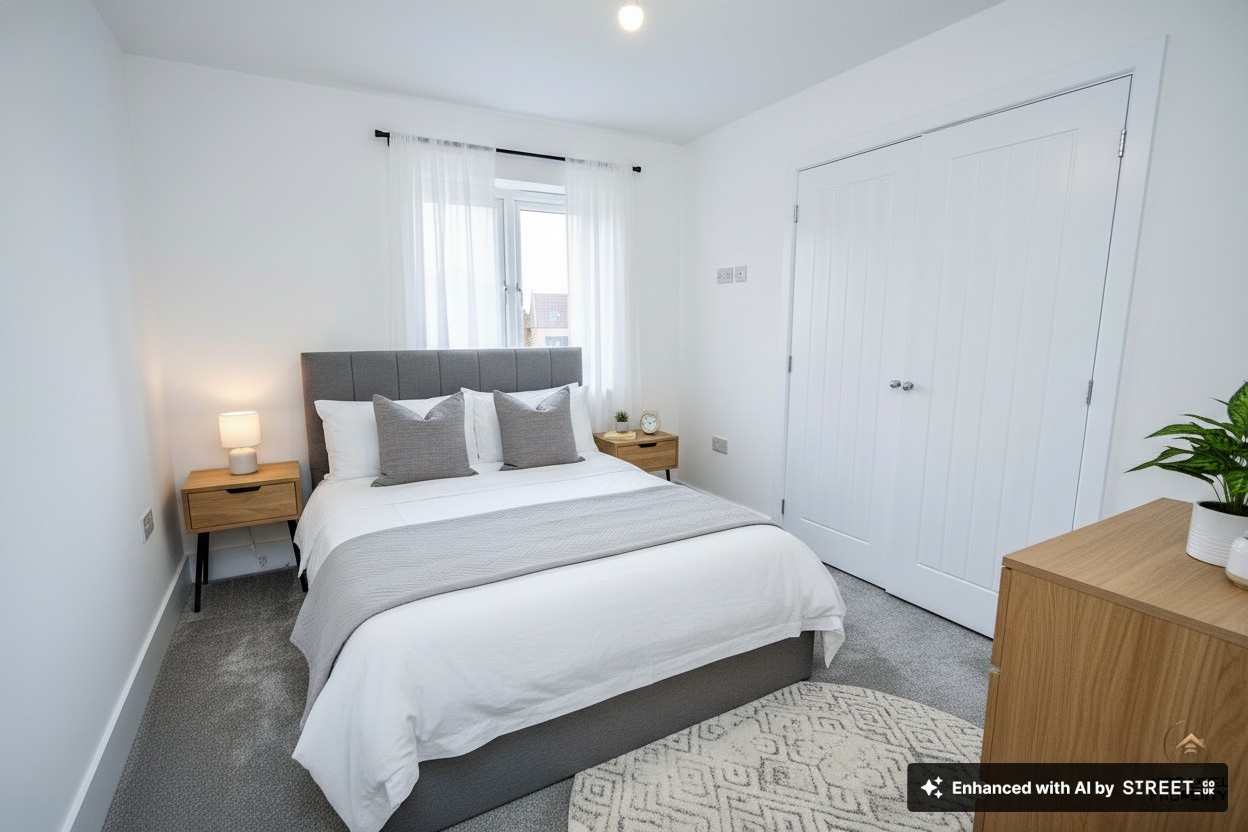 A spacious and relaxing double bedroom positioned to the rear of the home, enjoying a peaceful outlook and plenty of natural light from a UPVC double glazed window. The room benefits from a full range of built-in wardrobes providing excellent storage while keeping the space sleek and uncluttered, and a radiator ensures comfort all year round. The current image has been AI-assisted to showcase potential with flooring and furniture, helping buyers easily visualise how beautifully this space can be styled.