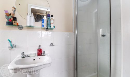 Side facing room, double glazed window, hand towel rail, WC, wash hand basin, shower cubicle, part tiled walls.