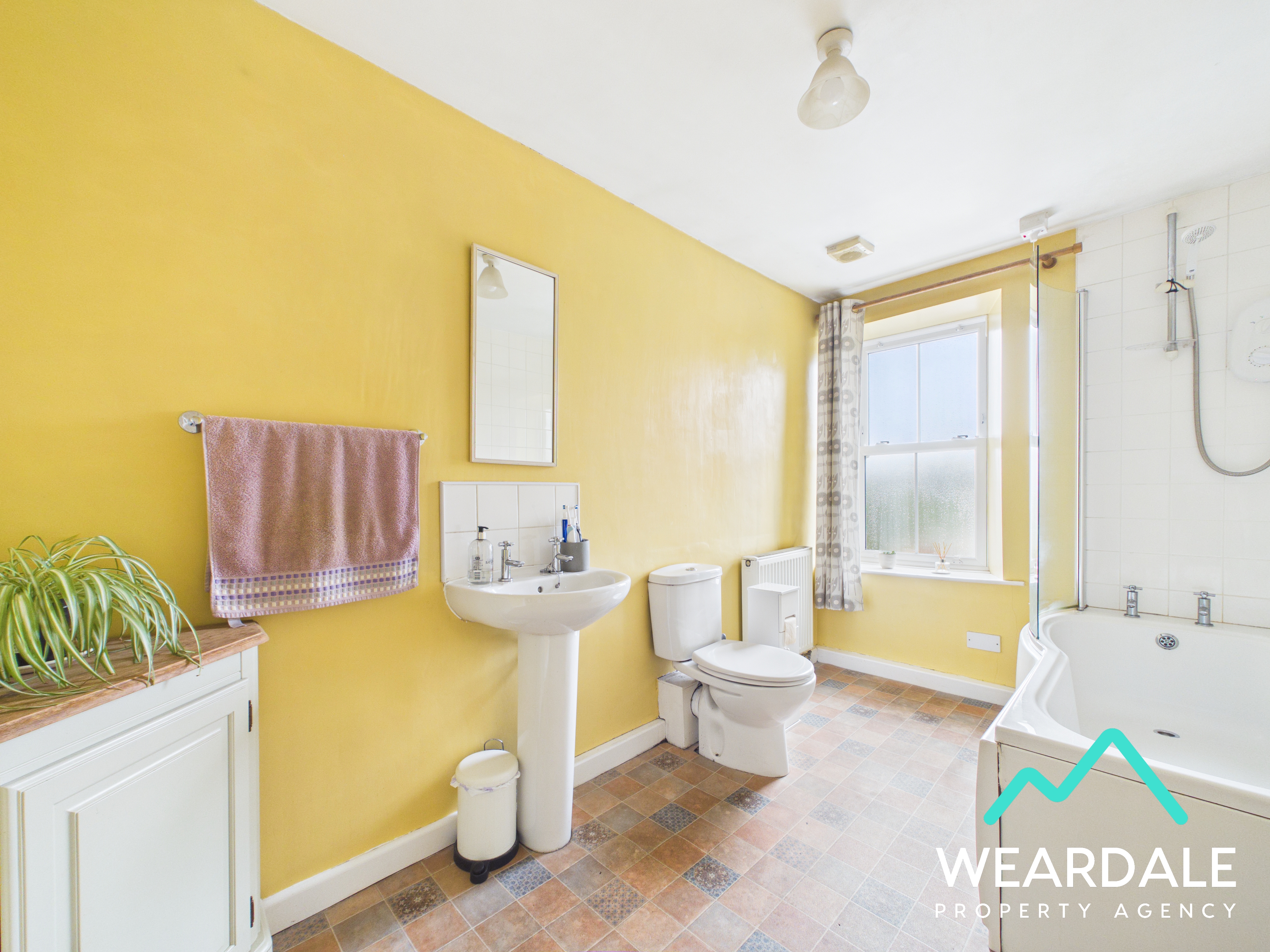 - Positioned to the Southern side of the property and accessed from the landing - Double-glazed uPVC sash window with deep wooden sill and frosted pane to the Western aspect - Vinyl flooring - Neutrally decorated - Panel bath with glass screen, fully tiled enclosure, and electric overhead shower - WC - Hand-wash basin - Central ceiling light fitting - Radiator - Extractor fan - Space for free-standing storage furniture
