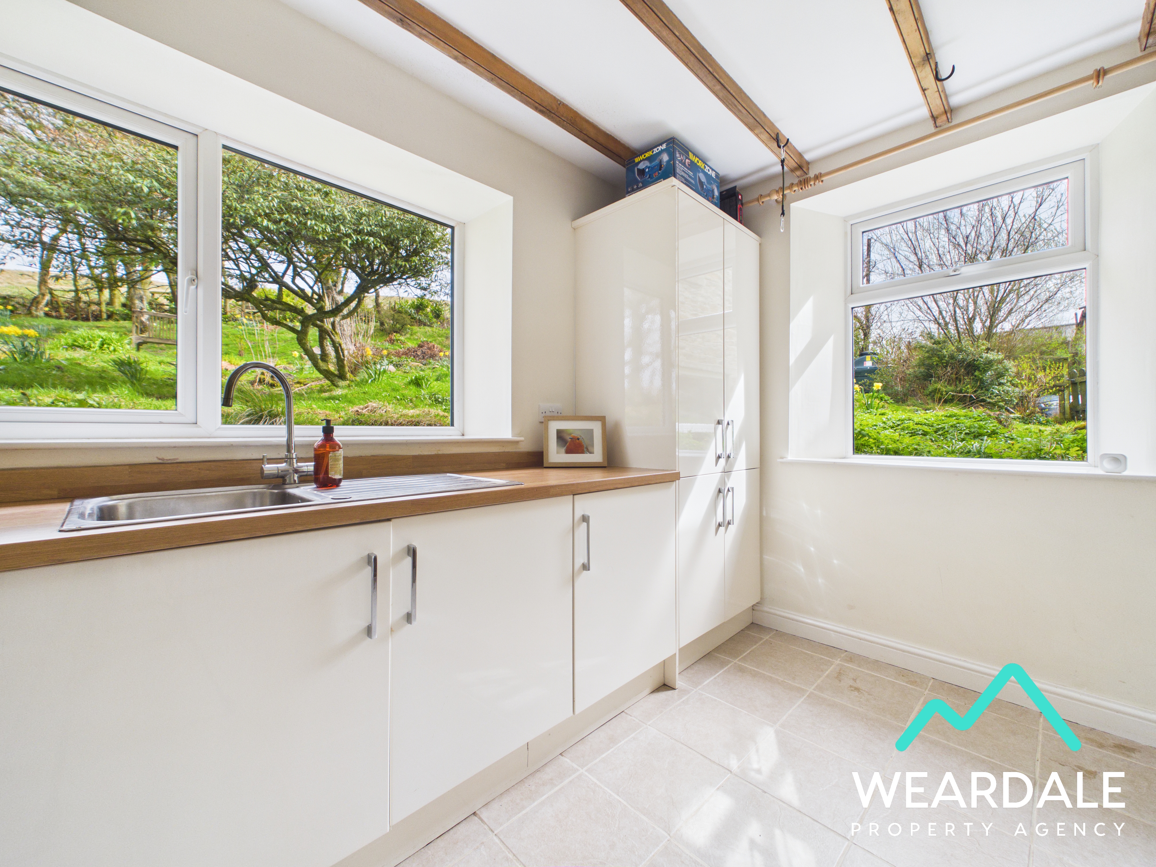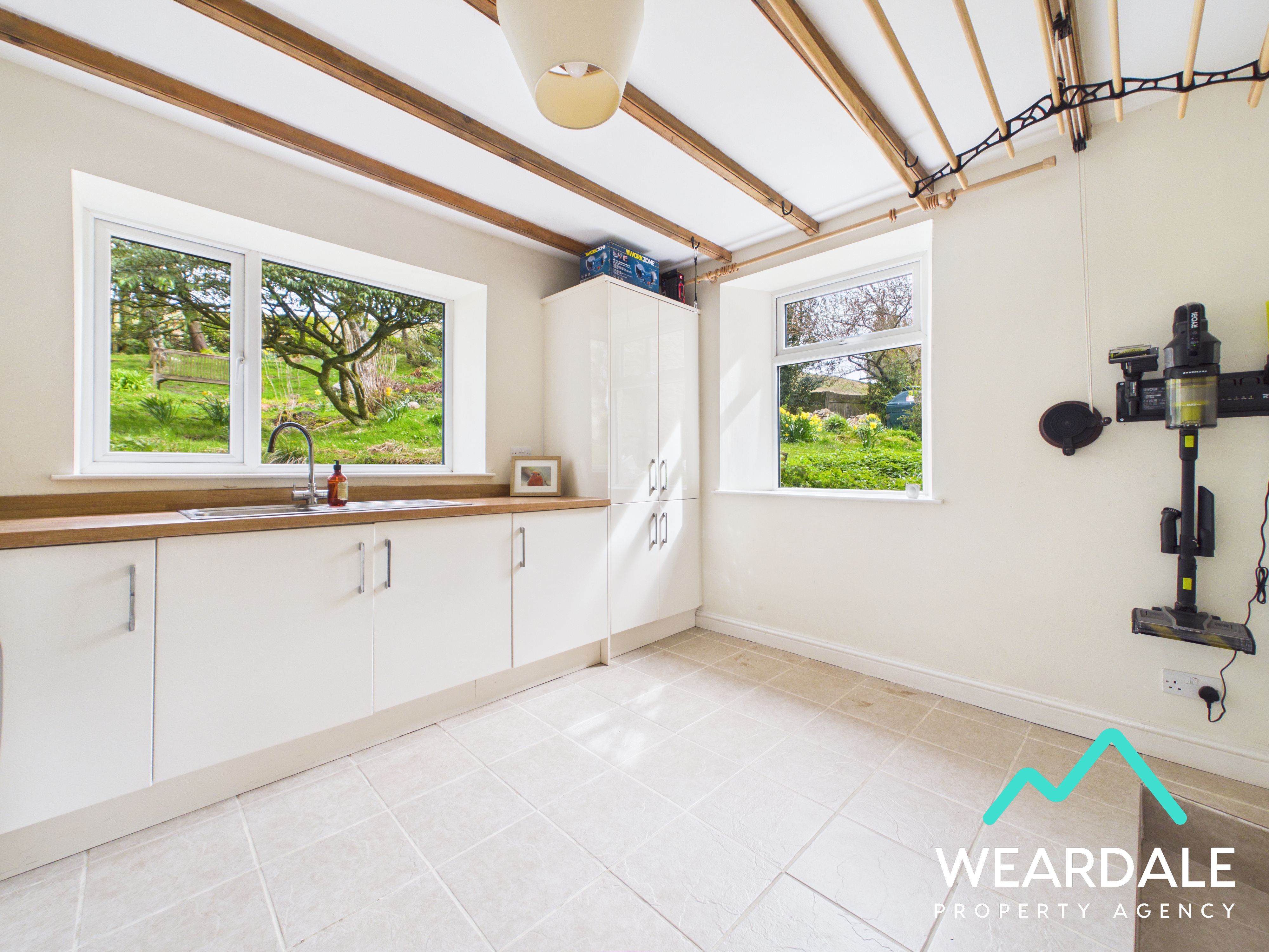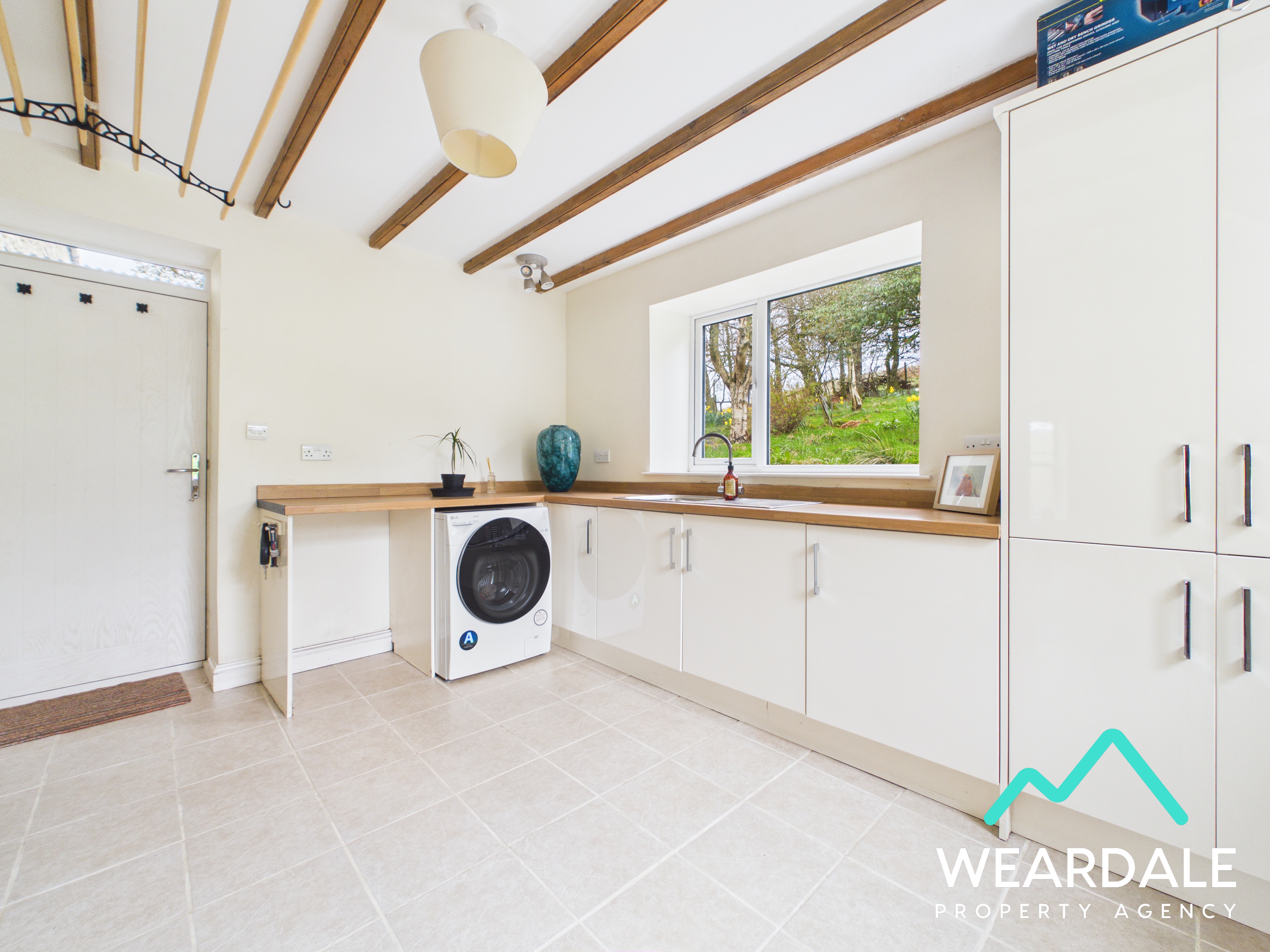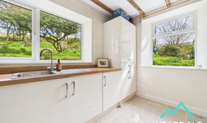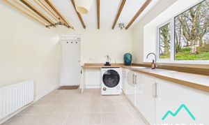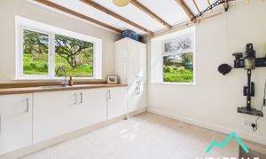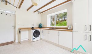 - Positioned to the rear of the property, accessed from the dining room and providing external access to the rear garden via a composite door - Large utility room - Dual aspect with double-glazed uPVC windows with deep wooden sills to the Eastern and Southern aspects, both looking over the rear garden - Tiled flooring - Neutrally decorated - Exposed wooden ceiling beams - Range of over/under counter storage units - Laminate work surface - Stainless steel sink and drainer with laminate splashback - Space for free-standing appliances - Two ceiling light fittings - Radiator - Plumbing for washing machine