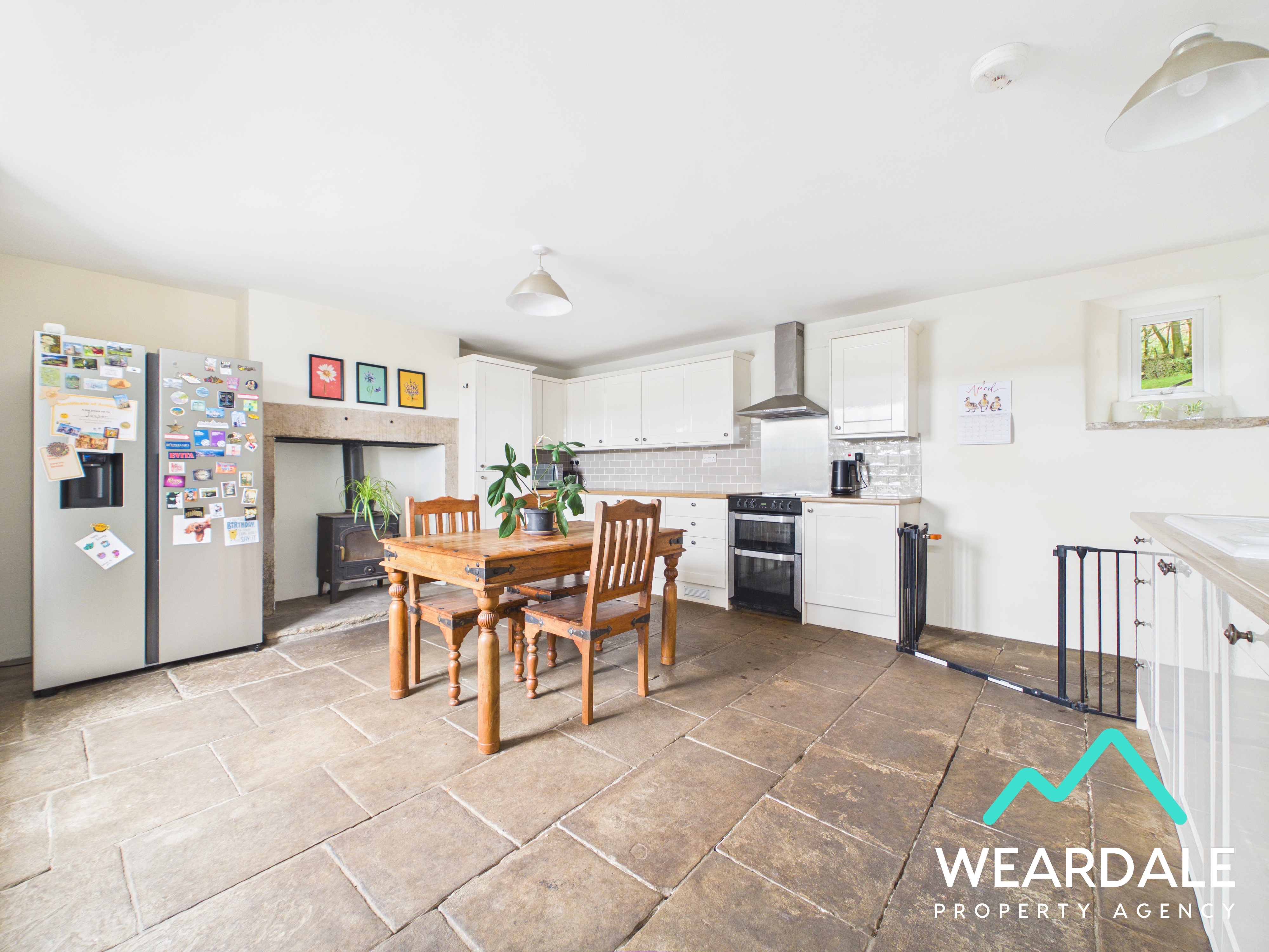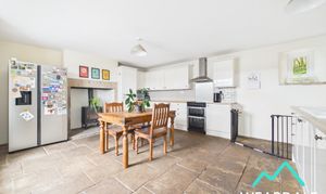 - Positioned to the Northern side of the property, accessed internally from the dining room and externally via a composite door with clear pane from the front garden - Spacious kitchen area - Dual aspect with a double-glazed uPVC sash window with wooden window seat to the Western aspect, looking over the front garden and providing stunning views of the surrounding hillsides. There is a small double-glazed uPVC window with deep stone sill to the Eastern aspect, looking over the rear garden - Original flagstone flooring - Neutrally decorated - Range of over/under counter storage units - Laminate work surfaces with tiled splashbacks - 1.5 porcelain sink and drainer - Integrated dishwasher - Free-standing double electric oven and hob with overhead extractor - Traditional multi-fuel burner set on a flagstone hearth with stone surround - Two ceiling light fittings