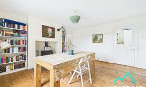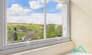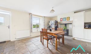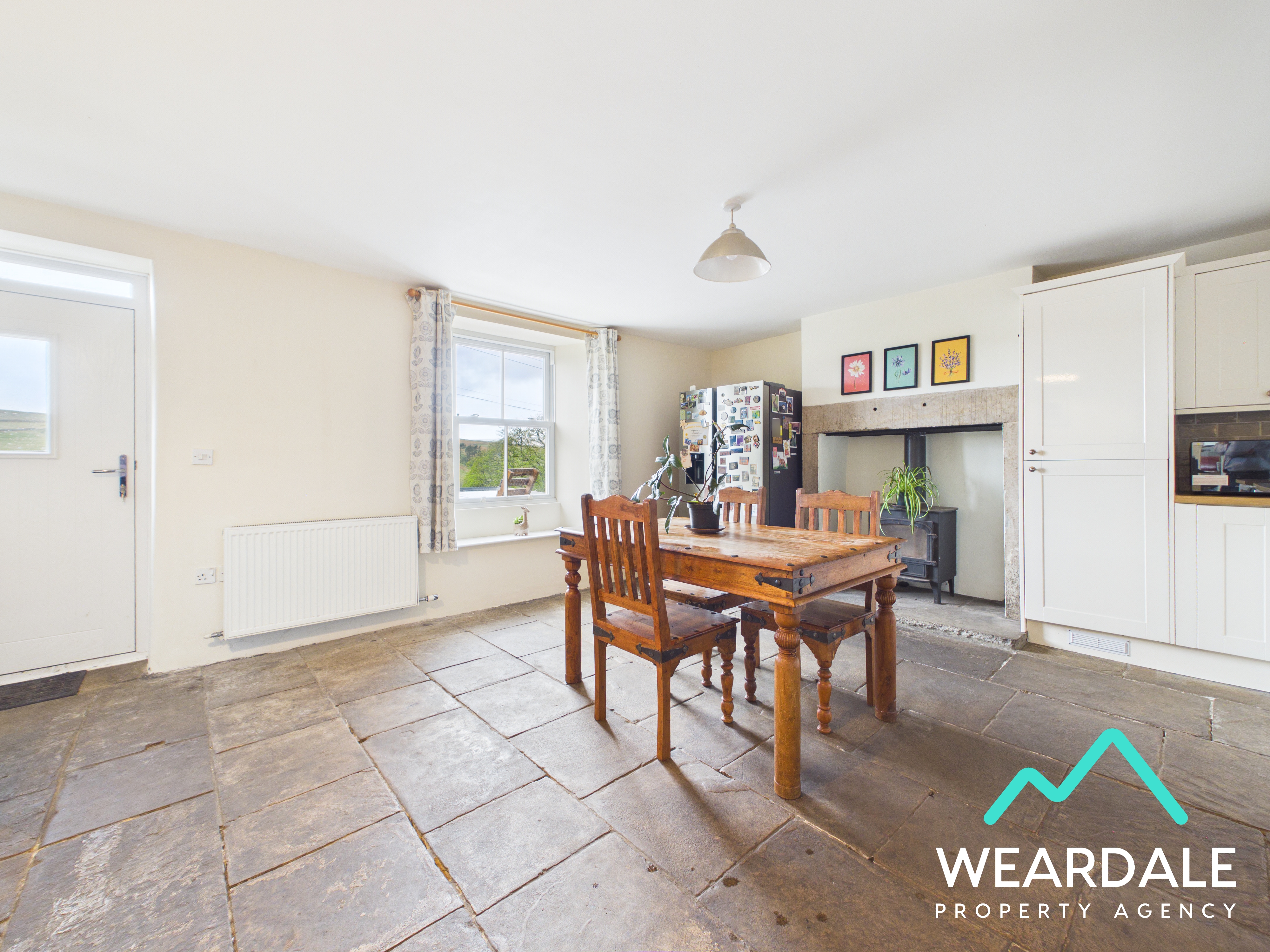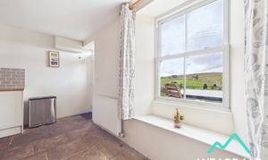 - Positioned to the middle of the property, accessed from the entrance hallway and providing onward internal access the living room, utility room, and kitchen - Well-proportioned dining area - Double-glazed uPVC sash window with deep wooden sill to the Western aspect, looking over the front garden and providing amazing views of the surrounding hillsides - Wooden flooring - Neutrally decorated - Traditional multi-fuel burner set on a flagstone hearth with stone surround - Central ceiling light fitting - Radiator - Space for dining room furniture